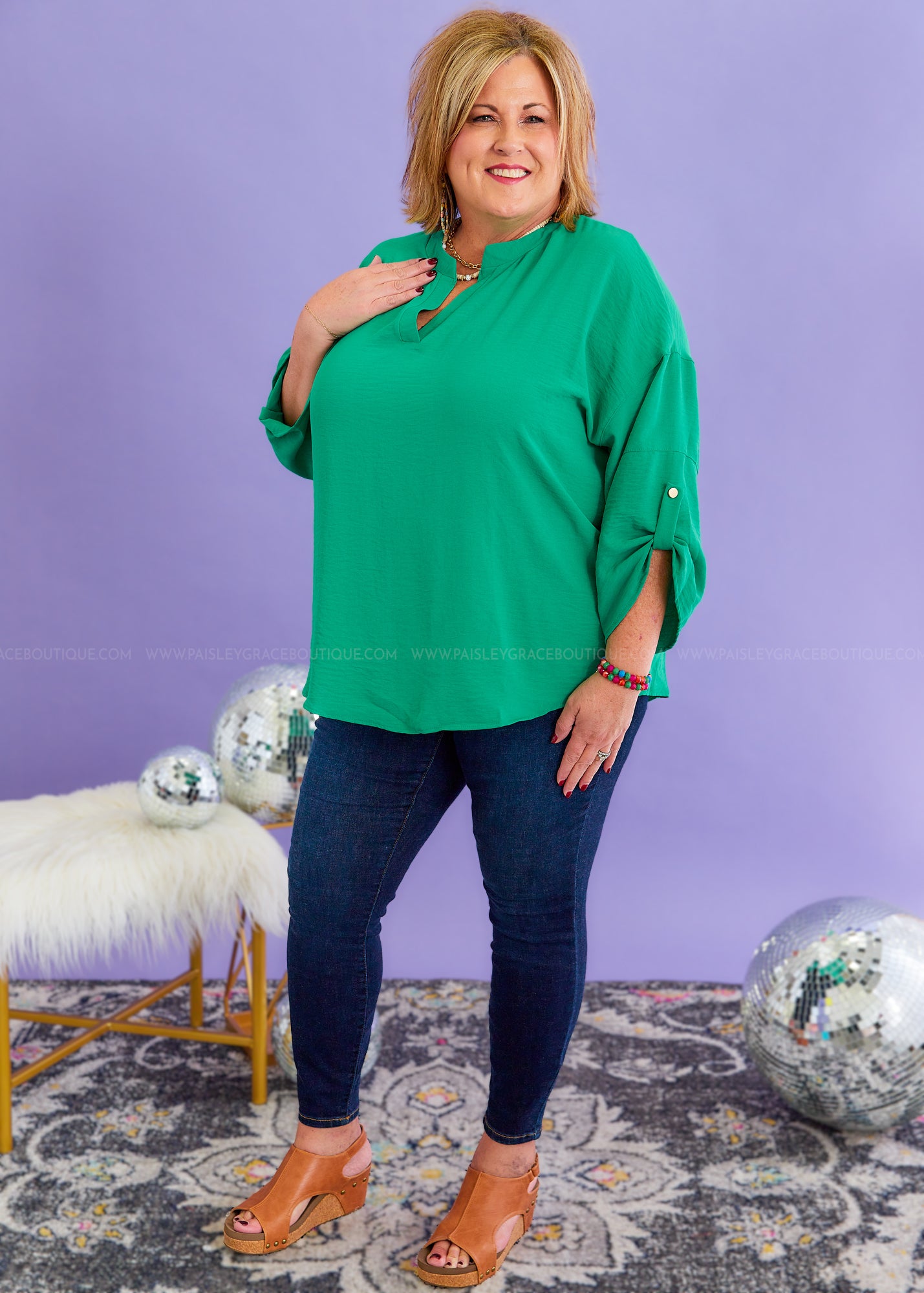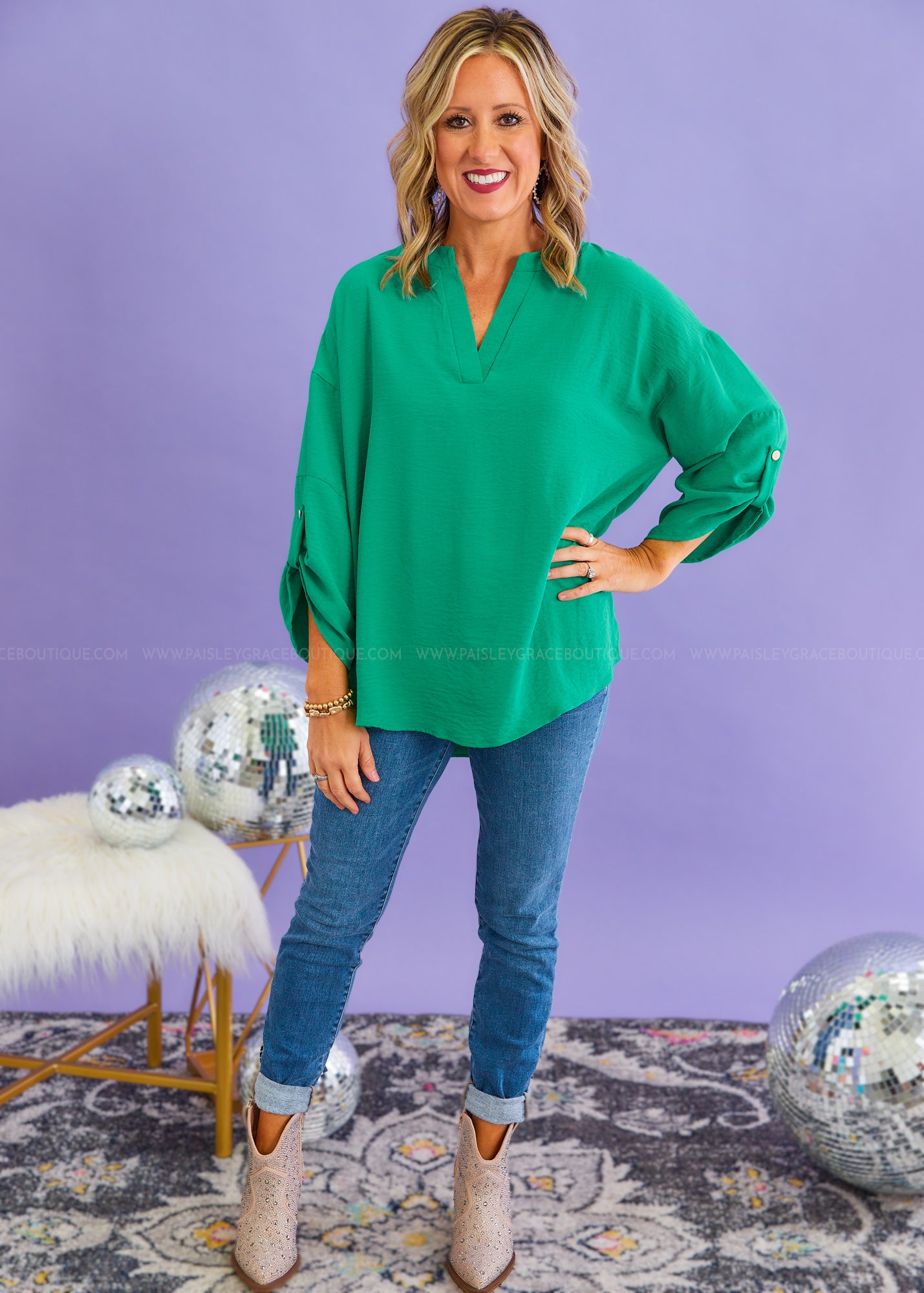 - V-Neckline | 3/4 Roll Tab Sleeves | Curved Hemline