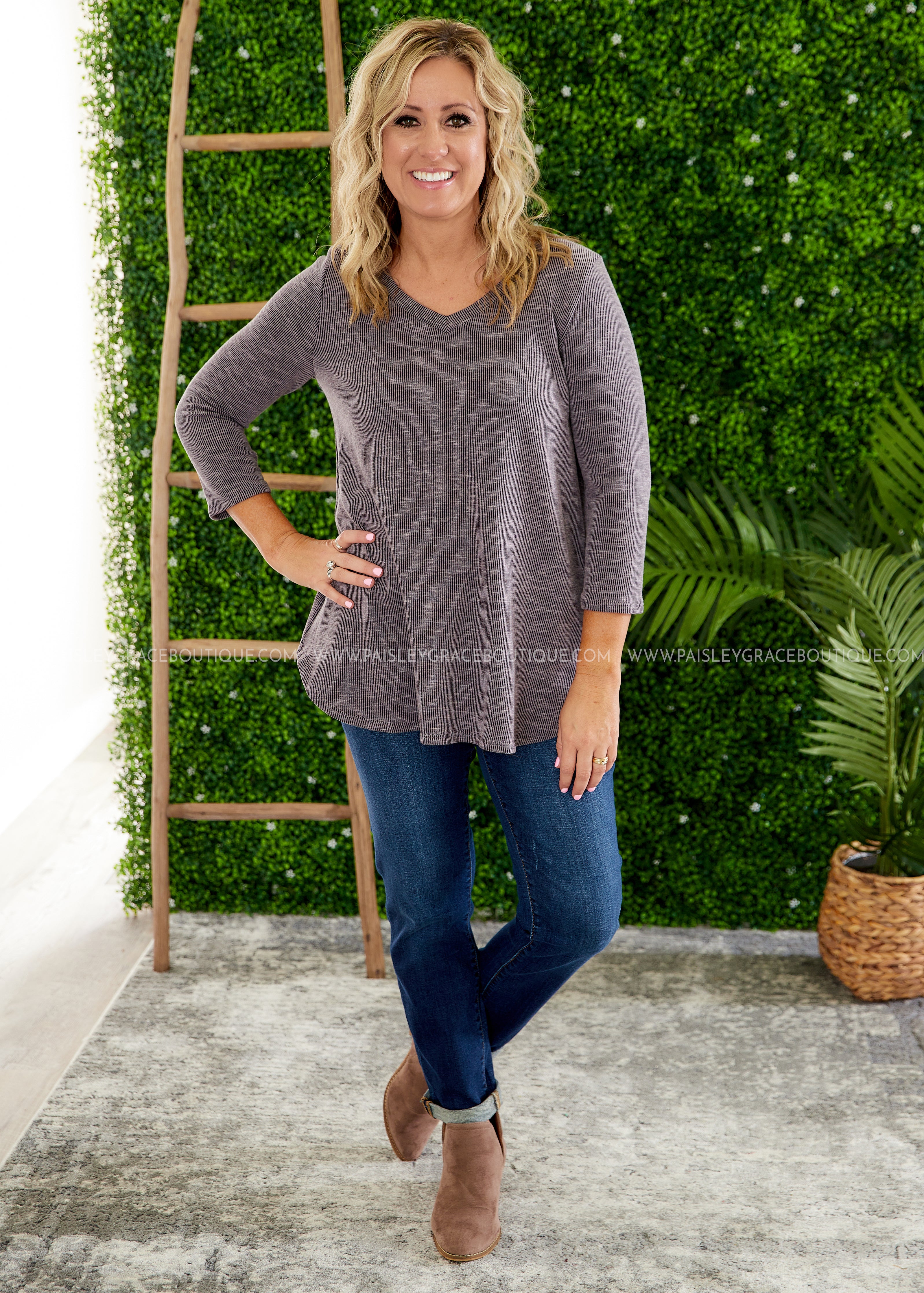 - V-Neckline; 3/4 Sleeves; Curved Hemline
