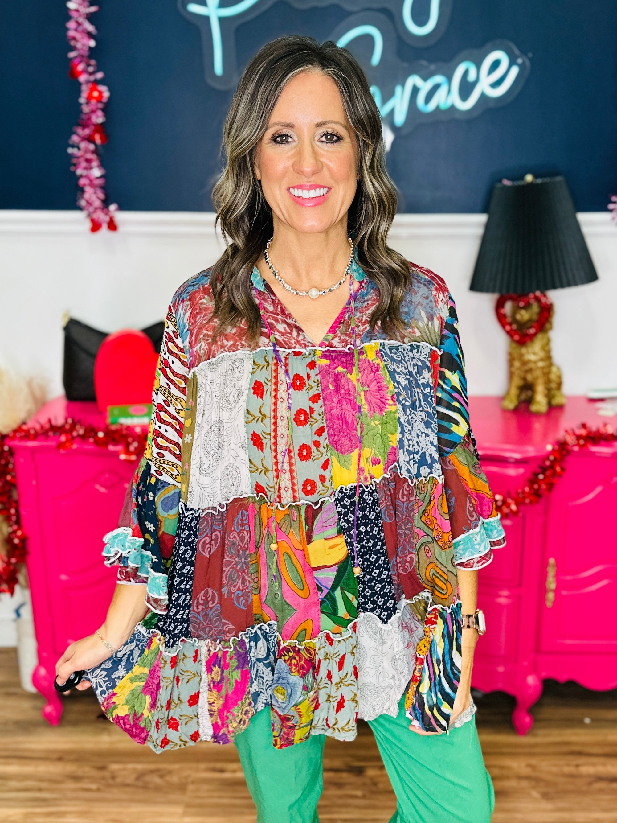 Designed with mixed-media patchwork panels and soft tiered frills, this tunic creates beautiful movement with every wear. It features a flattering V-neckline with delicate tie-up detail for an effortlessly feminine touch. The flowy silhouette, frill detailing, and breathable semi-sheer fabric offer all-day comfort with artistic charm.
