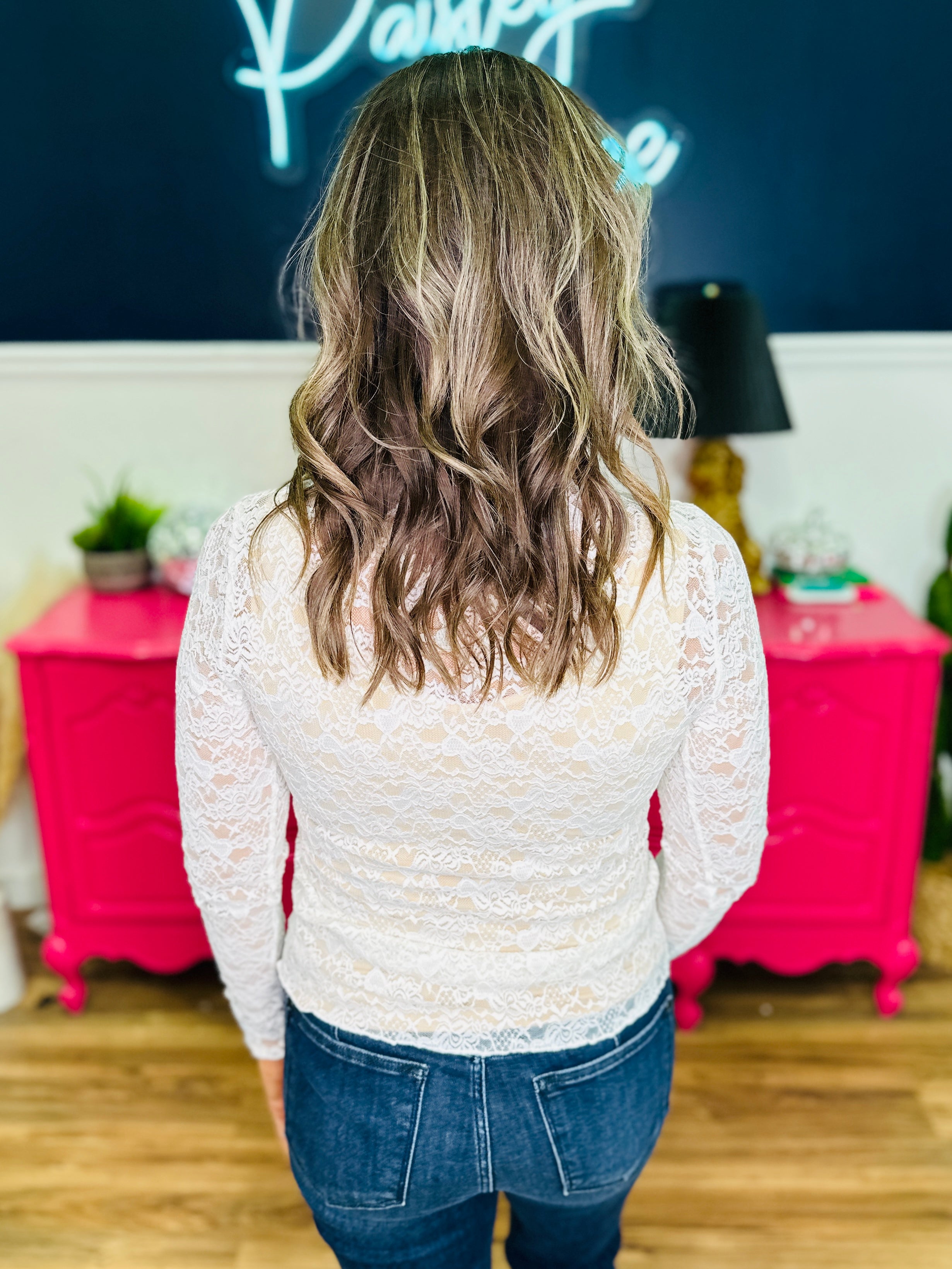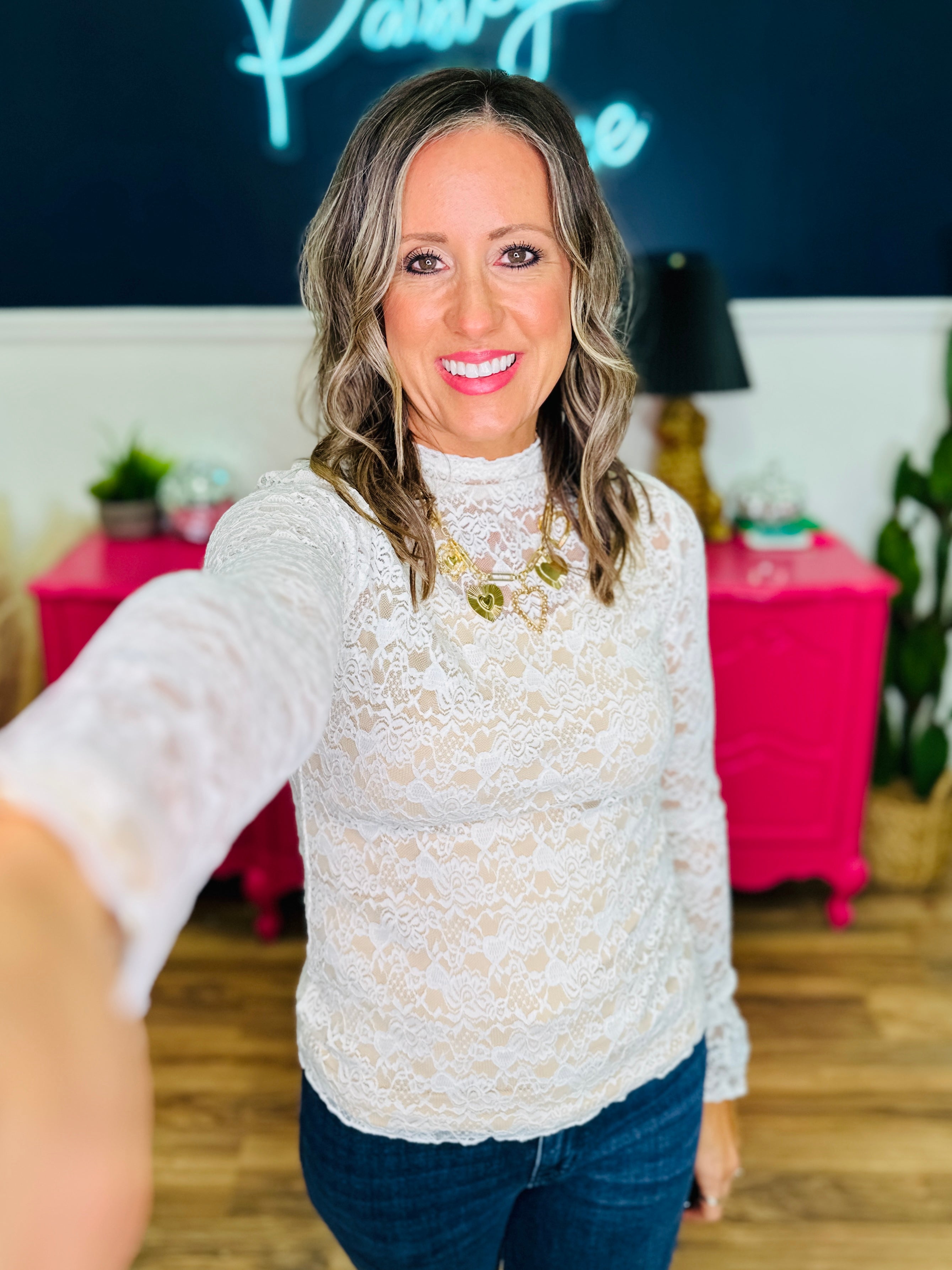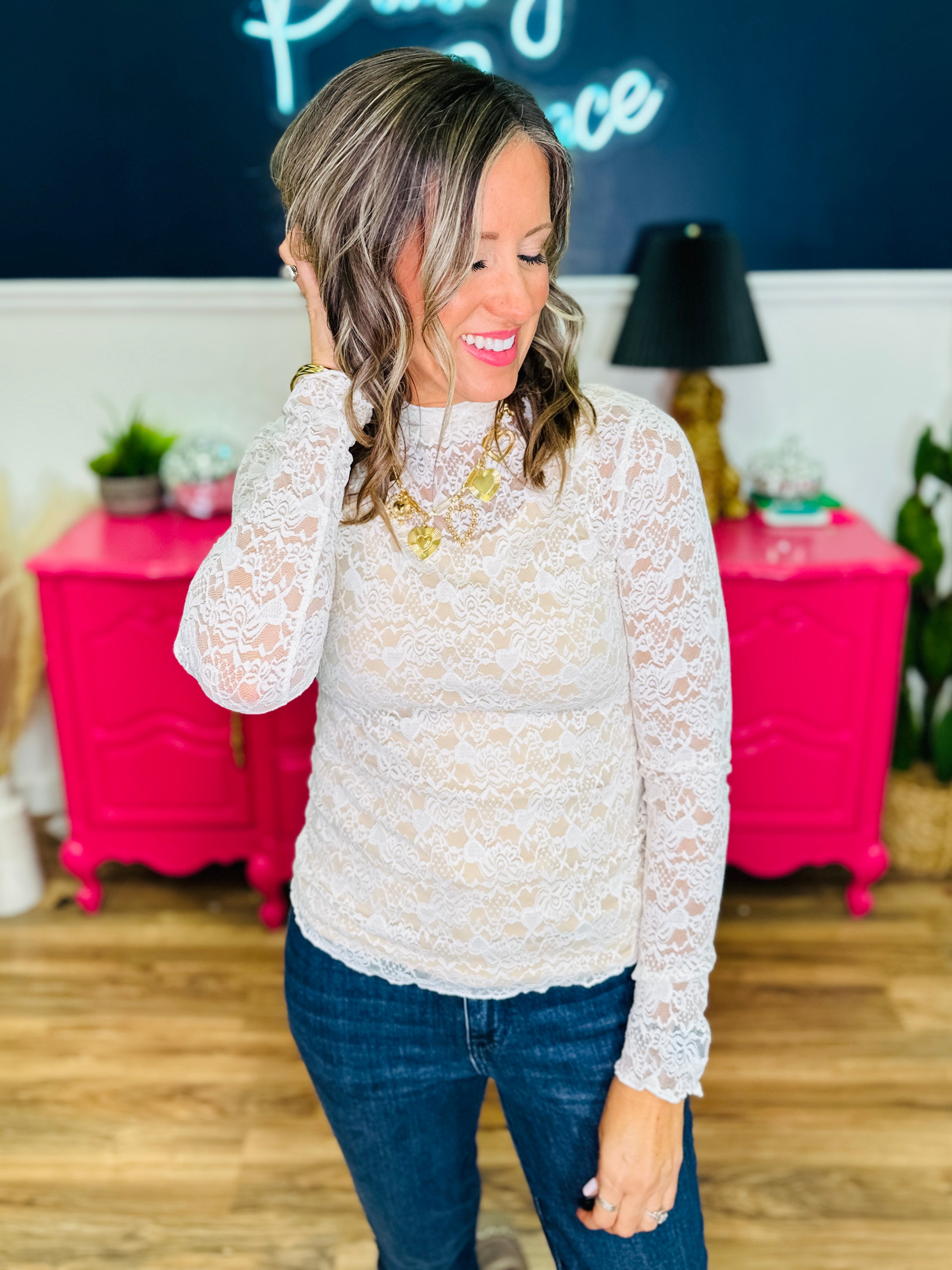 Bring a touch of romance to your look with this lace mock neck top. The delicate lace and long sleeves create a chic, feminine silhouette that’s perfect for layering or wearing on its own. Pair it with trousers for an elegant evening look or denim for a classy daytime vibe.