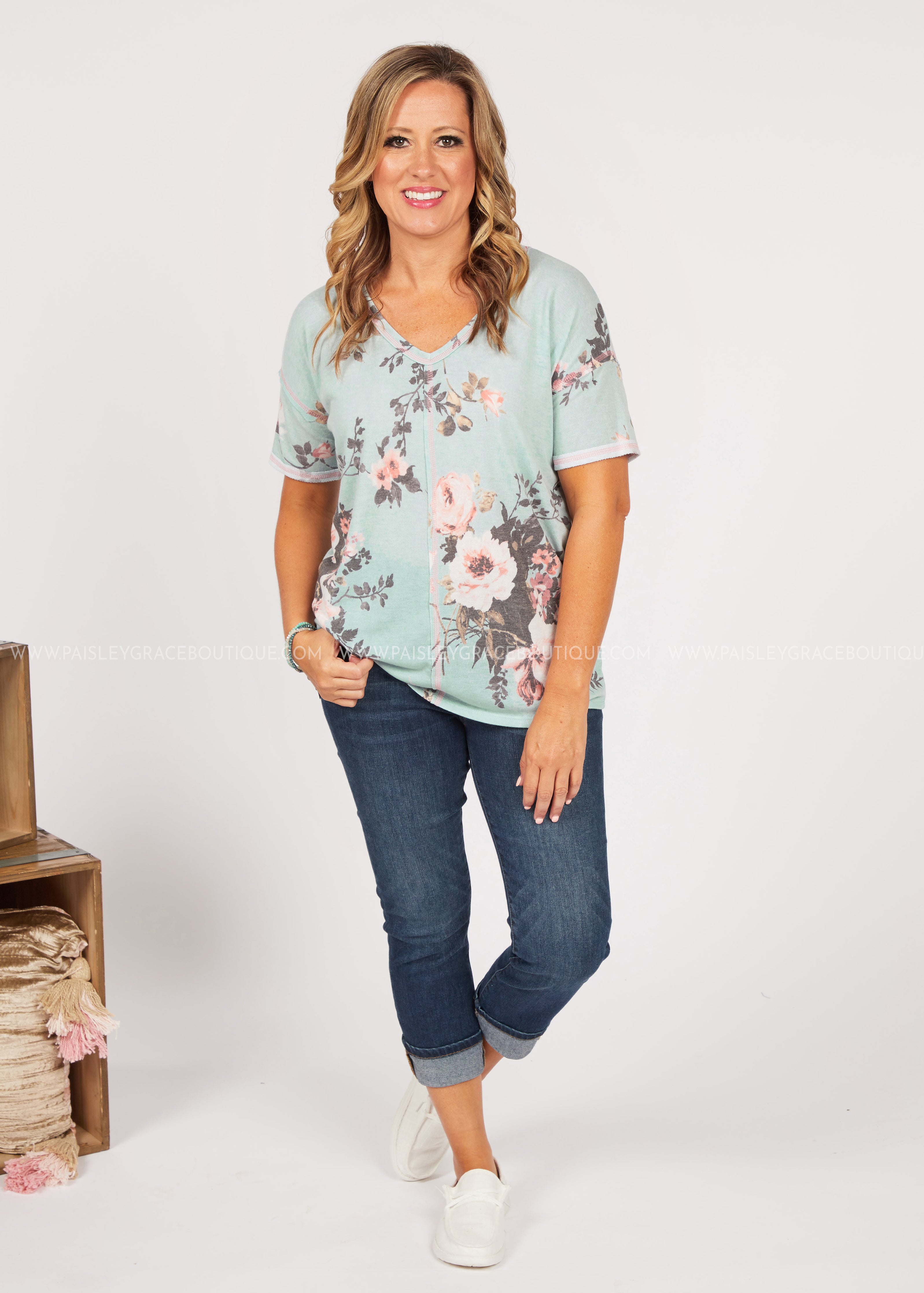 - Light Mint w/ Coral, Ivory, Charcoal & Mauve Floral Print; Coral Stitch Detailing