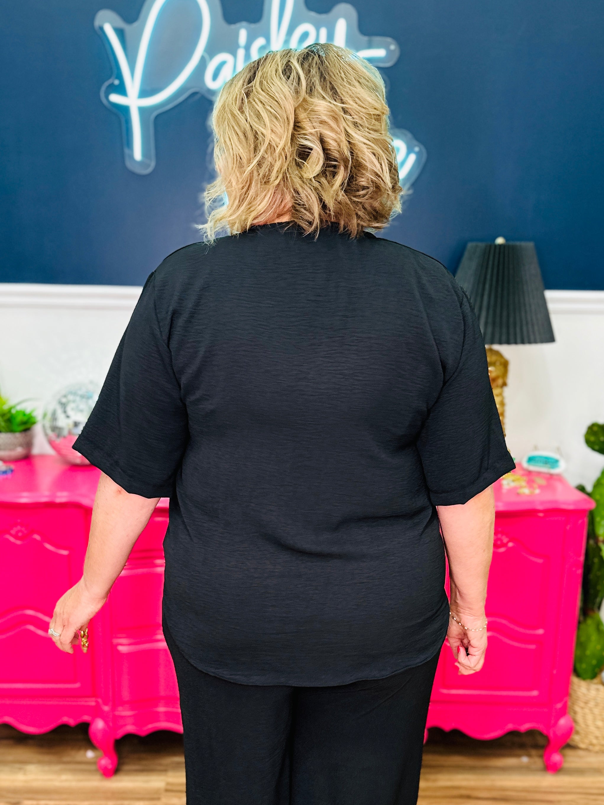 - Split Neckline | Short Sleeves | Curved Hemline
