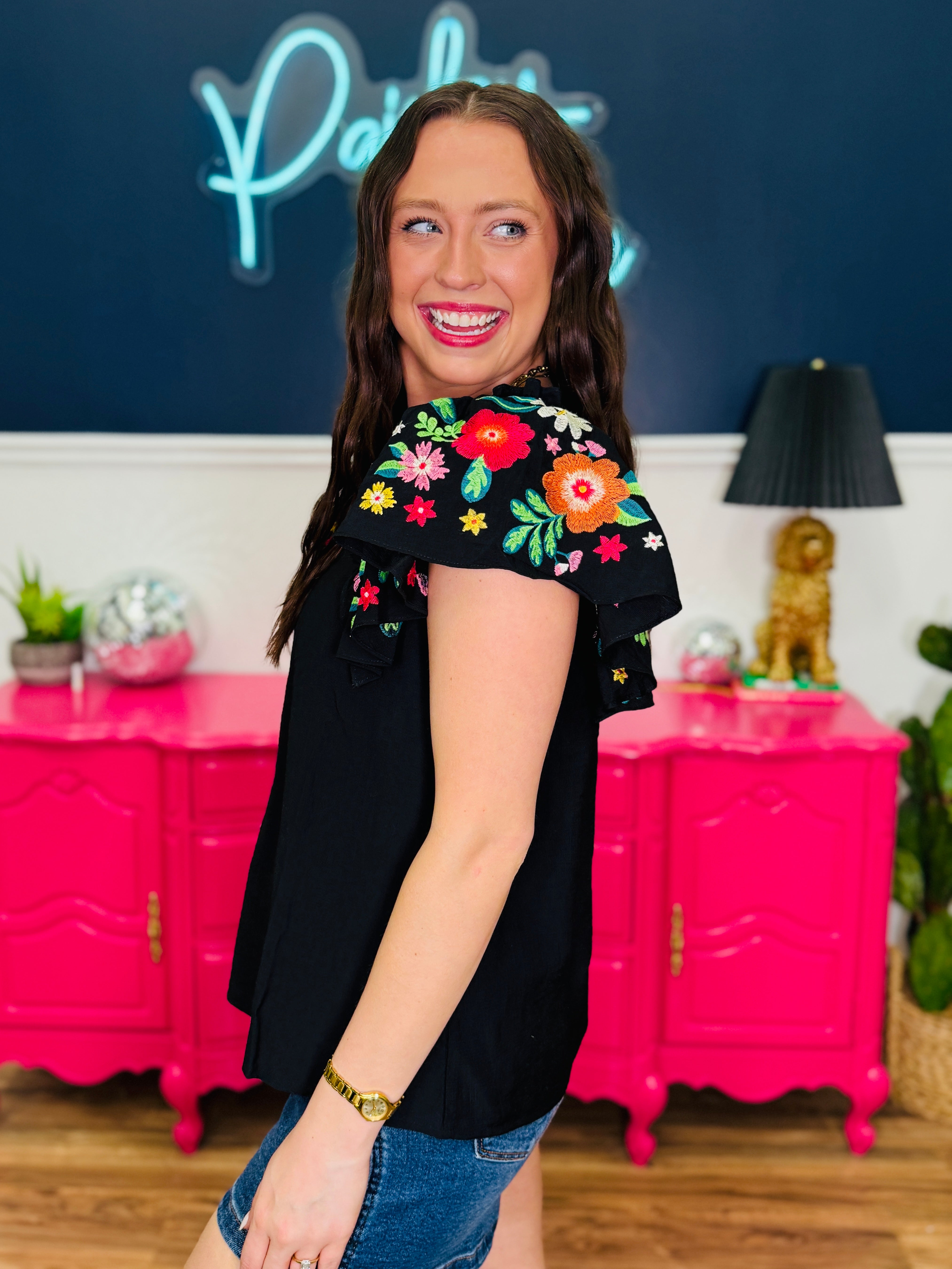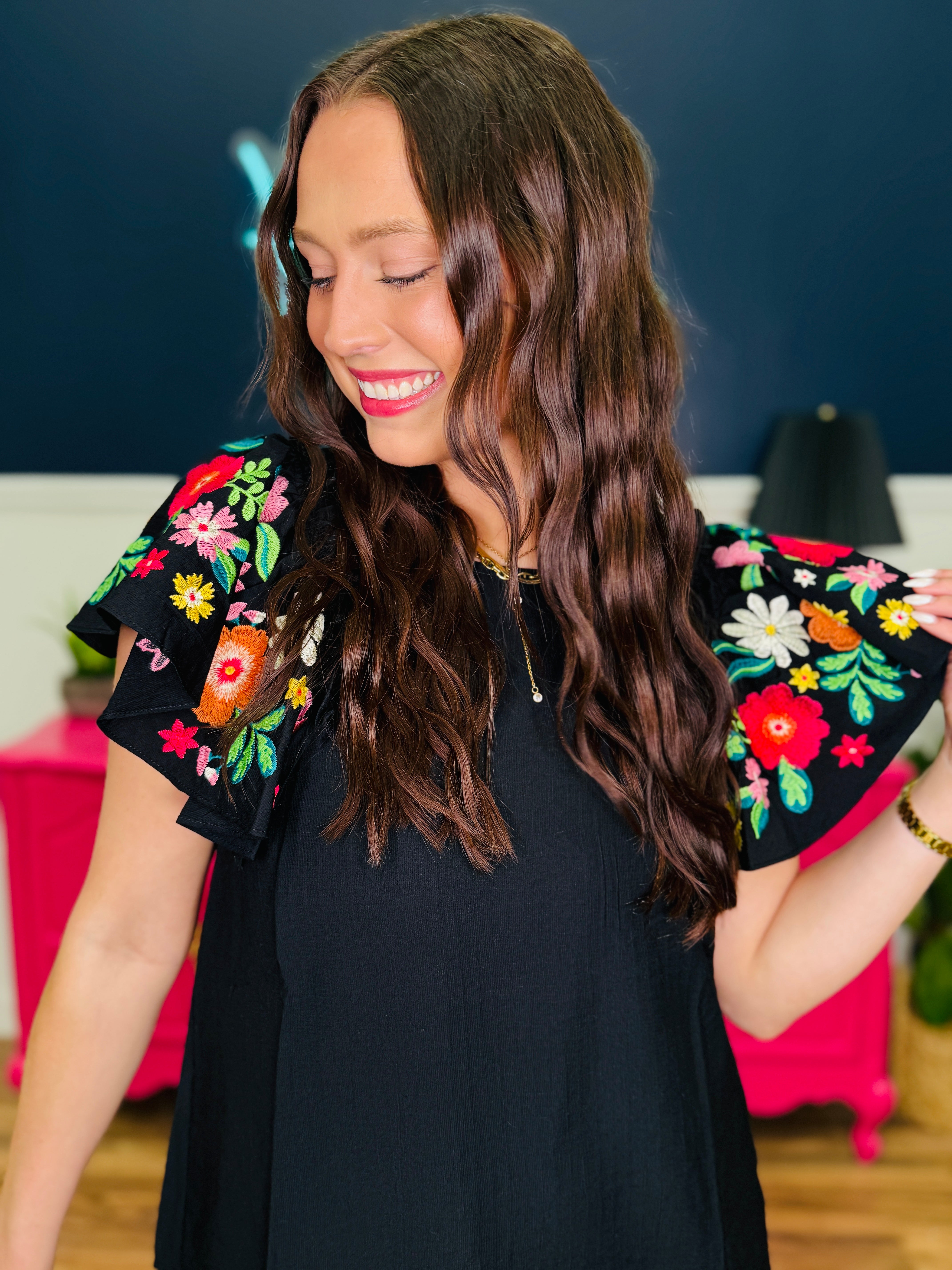 - Round Neckline | Short Flutter Sleeves | Curved Hemline