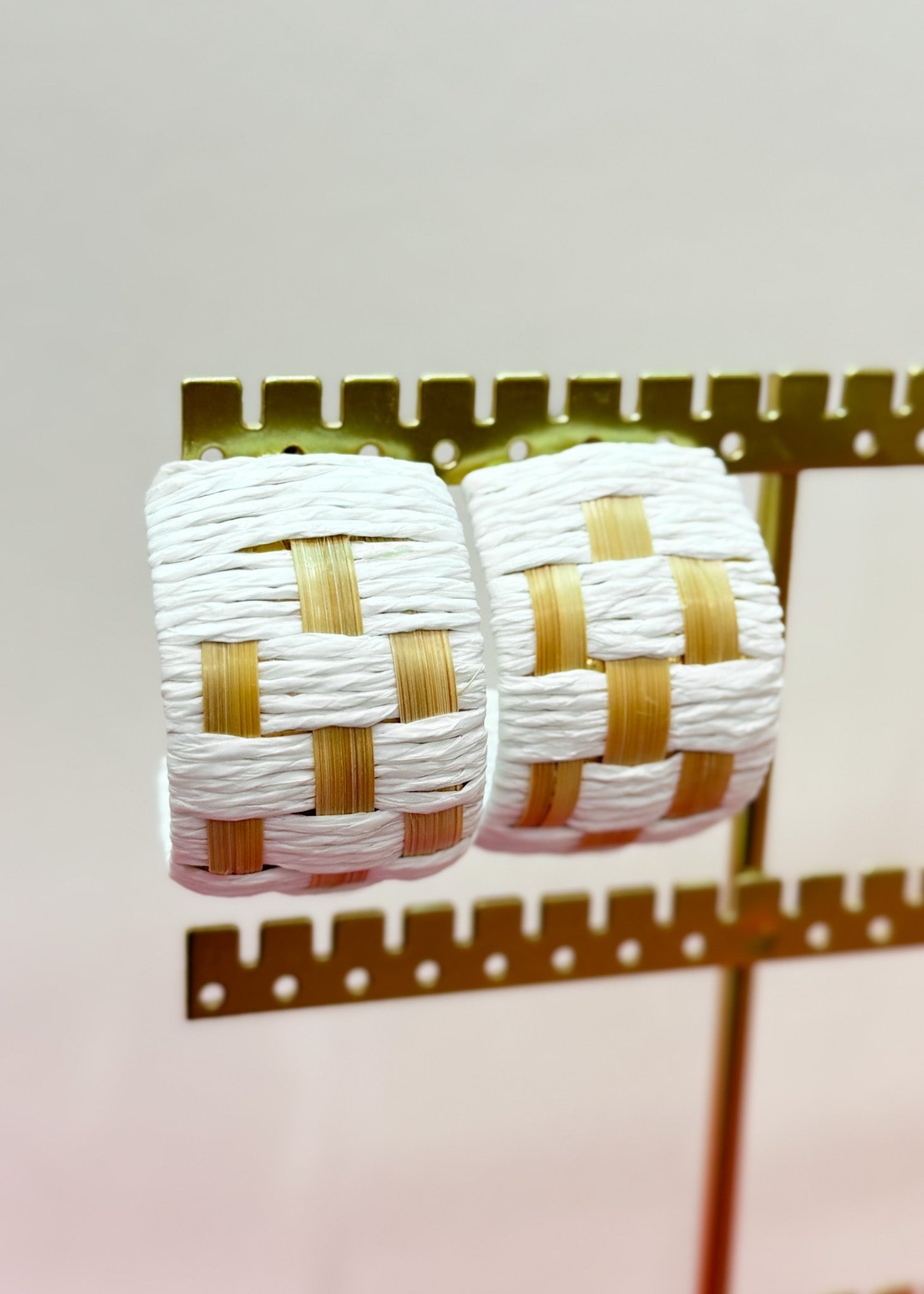 Featuring white, taupe & gold boho inspired woven hoop earrings.