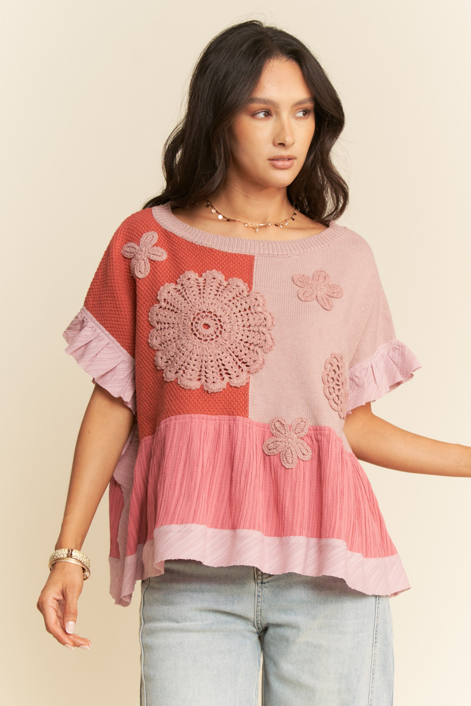 Sweater Textured Fabric Ruffle Detail Top