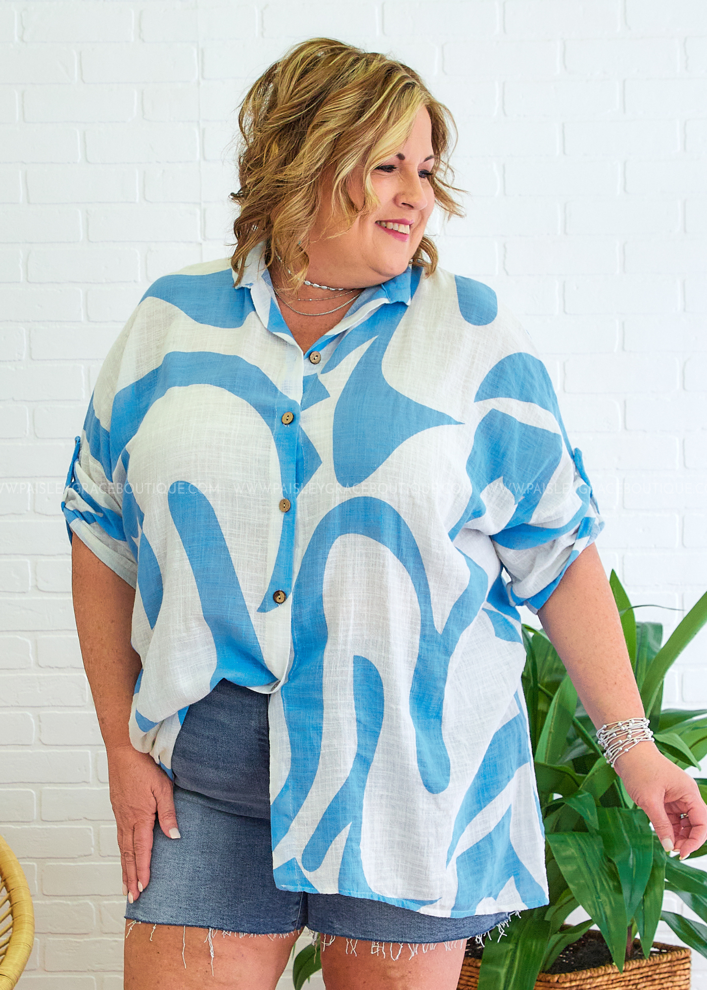 • Button Up Neckline | Roll Tab Short Sleeves | High-Low Curved Hemline