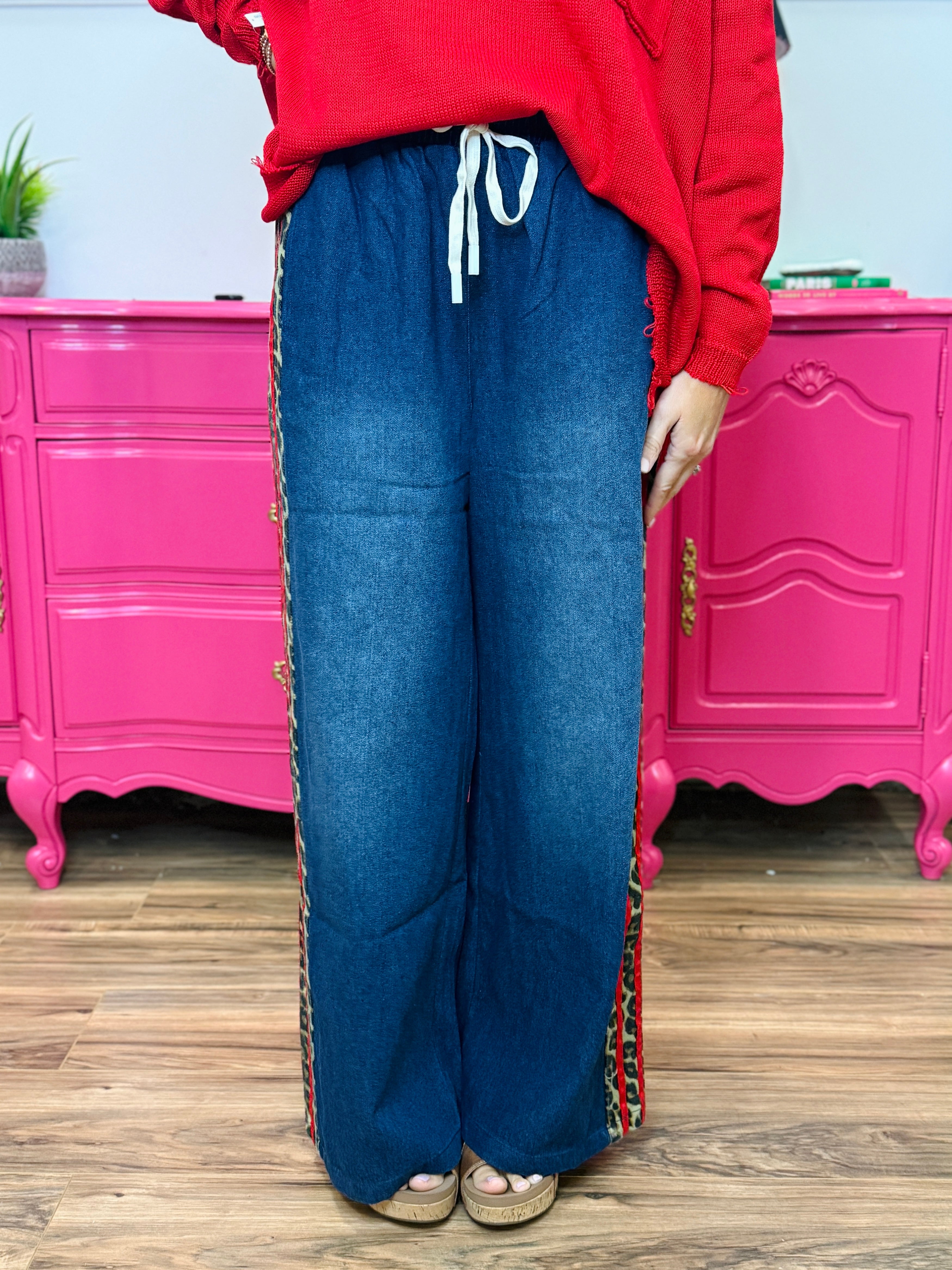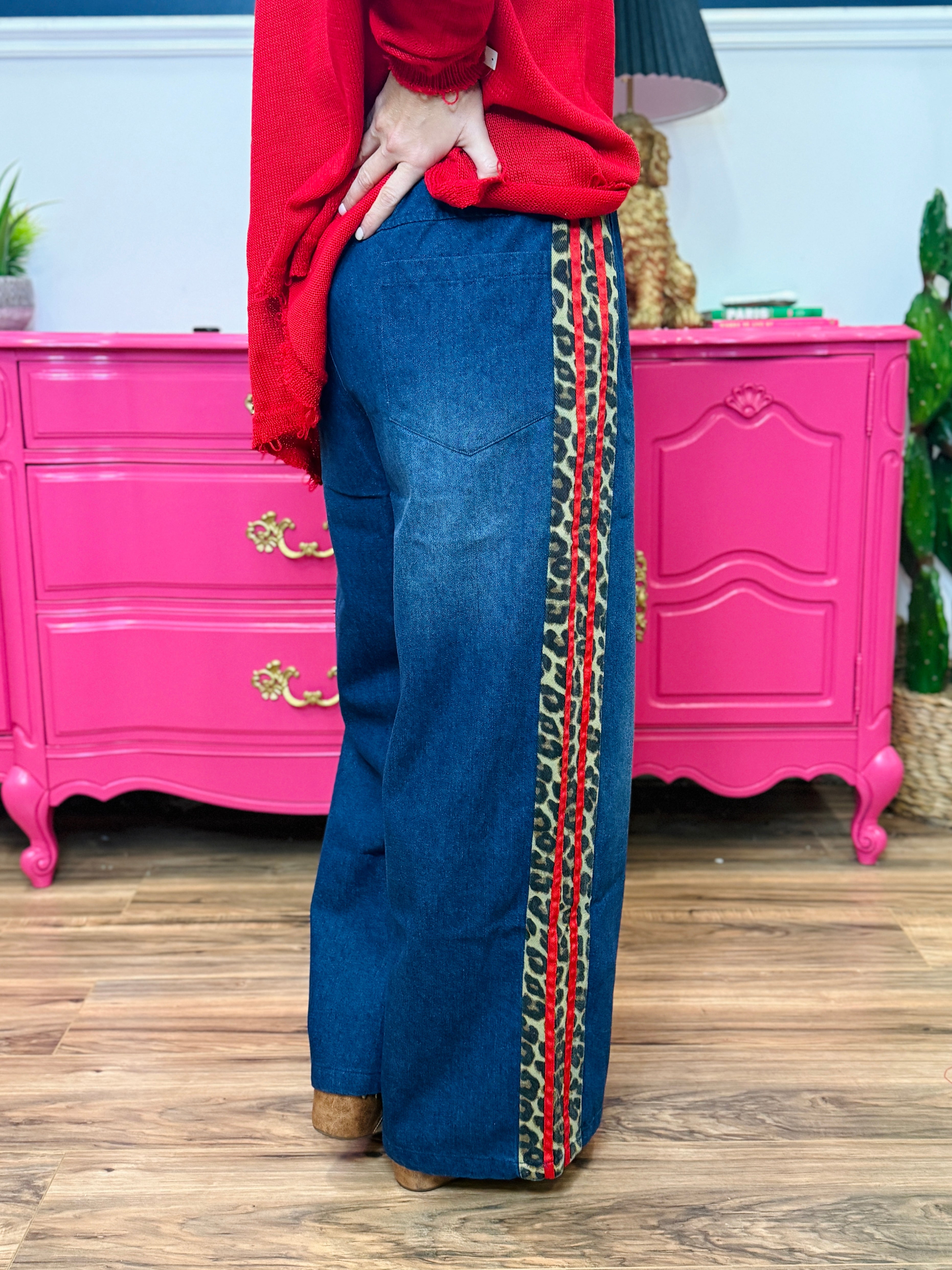 Denim Jeans With Leopard & Red Contrast - Dark Wash