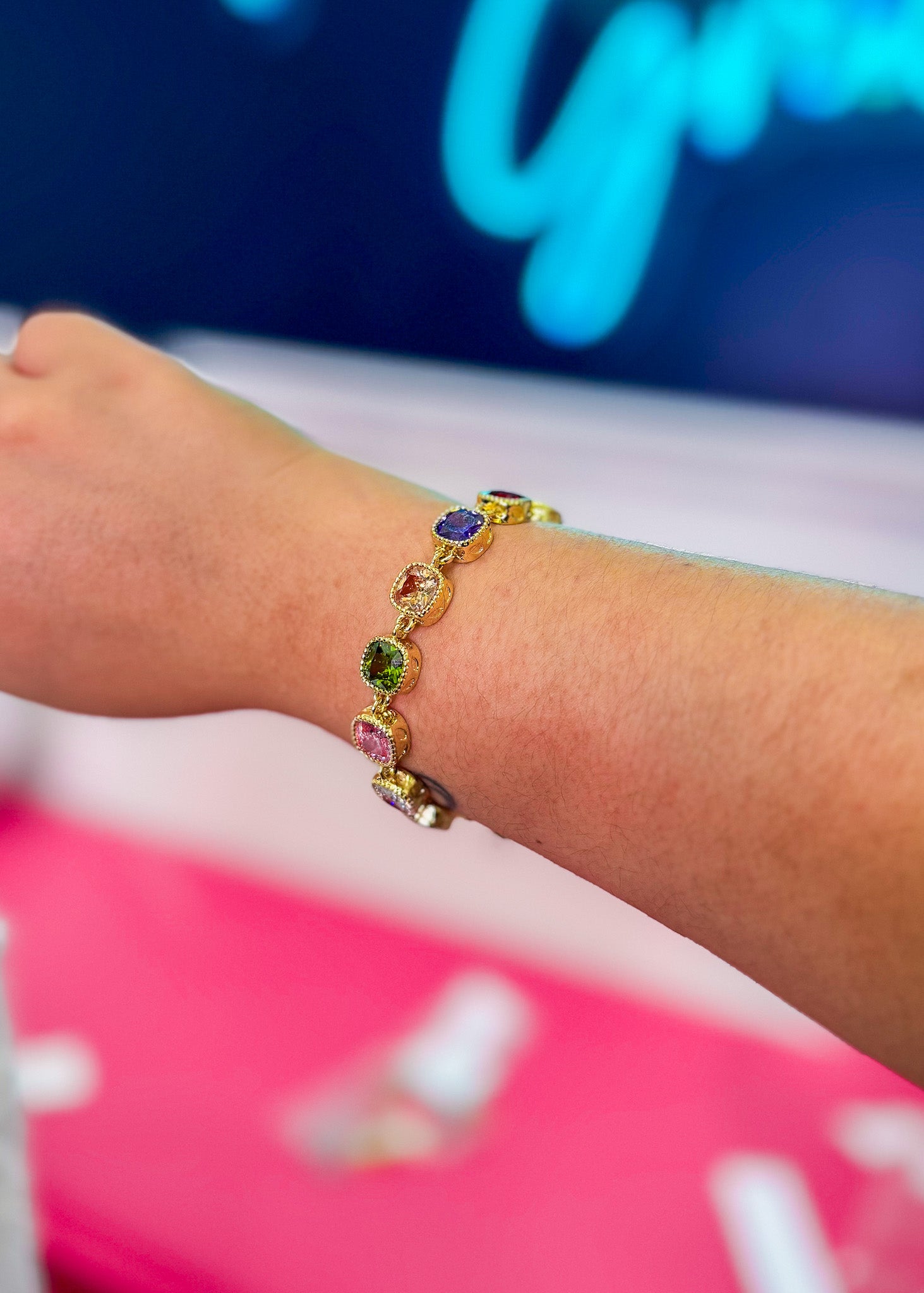 Featuring a gold tone bracelet with multicolored cubic zirconias crystals. Designed with a toggle clasp with two circular links for adjustable fit.