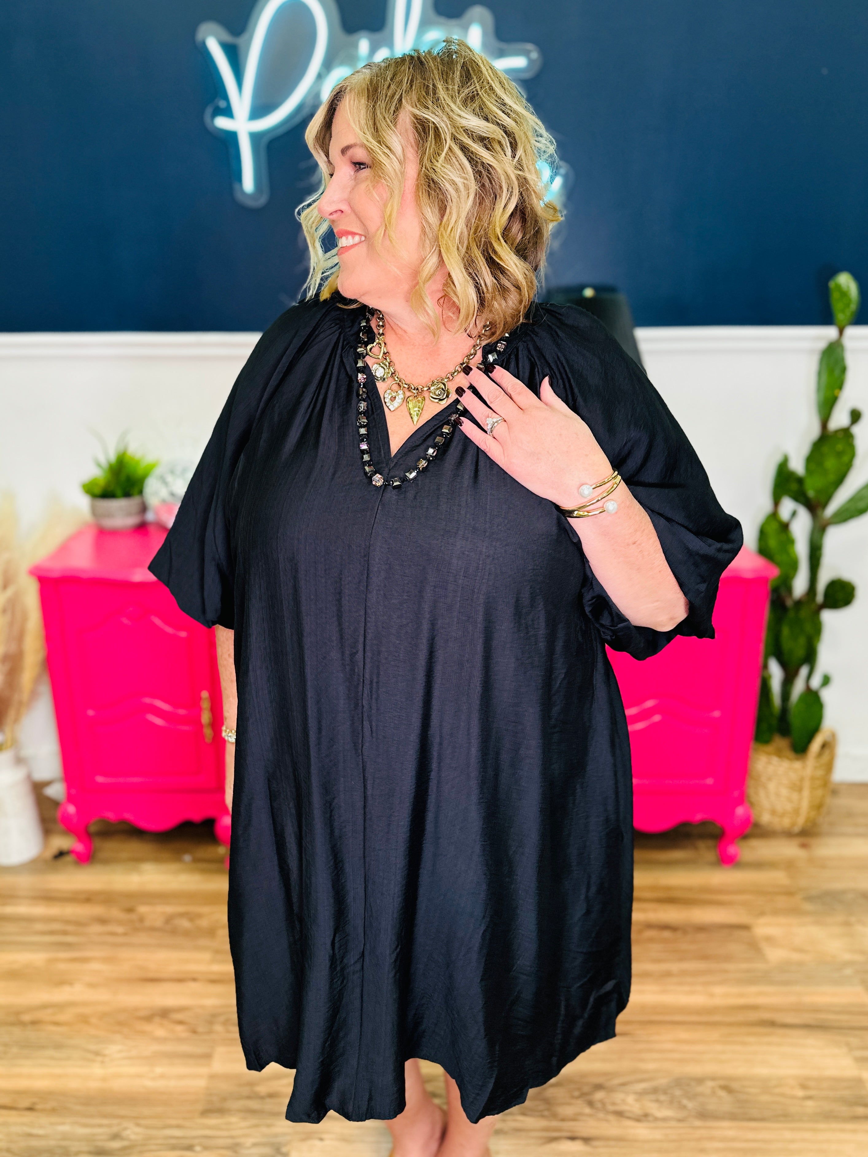 - V-Neckline | Mid-length Bubble Sleeves | Straight Hemline