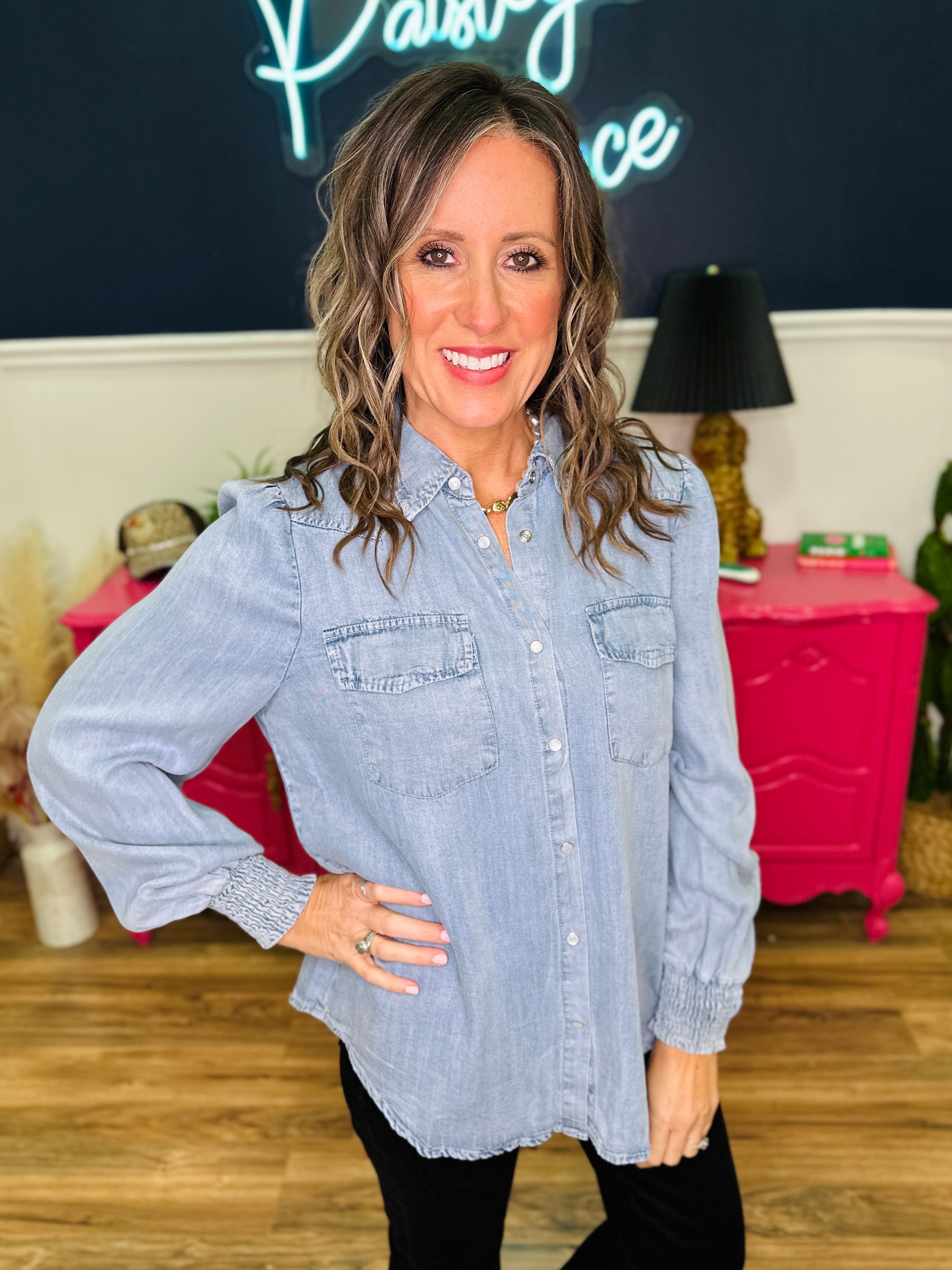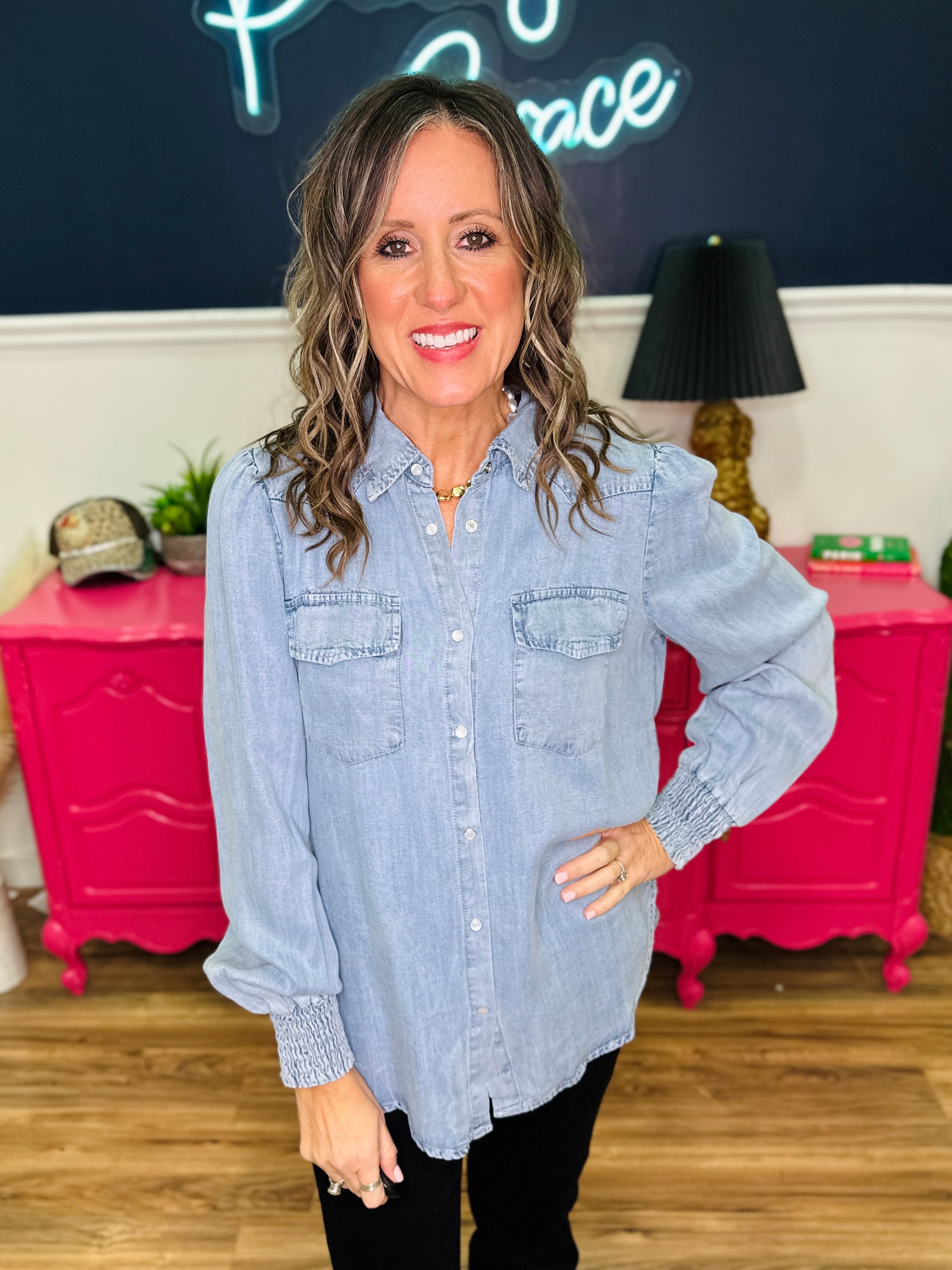 - Collared Neckline | Full-length Sleeves w/ Smocked Cuffs | Curved Hemline