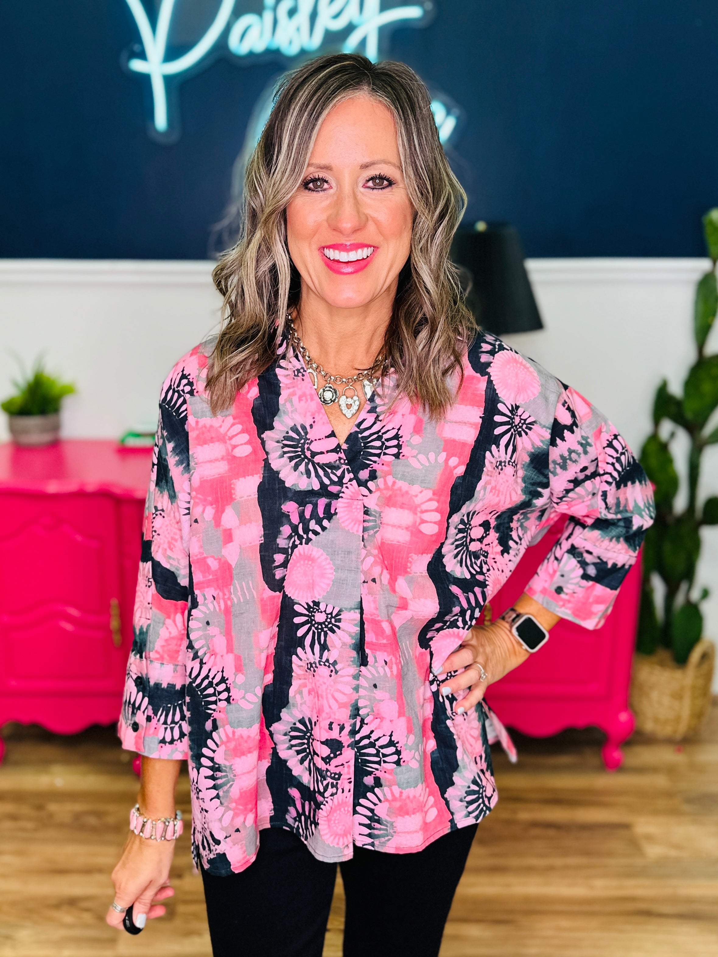 - Collared V-Neckline | 3/4 Dolman Sleeves | High-low Hemline