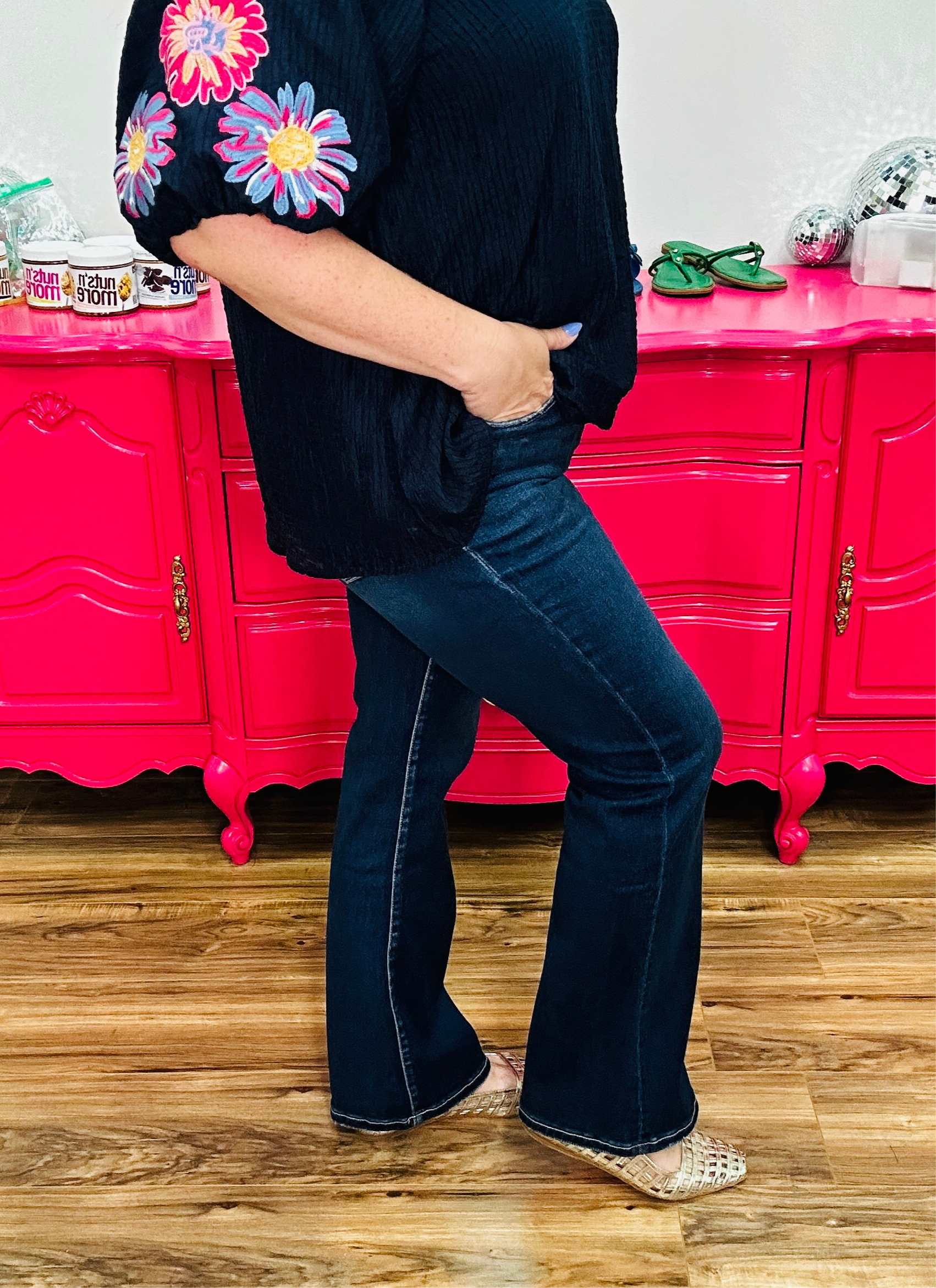 These mid-rise jeans hug your curves just right and flare out with a playful boot cut, complete with a chic back slit for a little extra flair. Perfect for turning heads and dancing through your day with confidence and comfort.