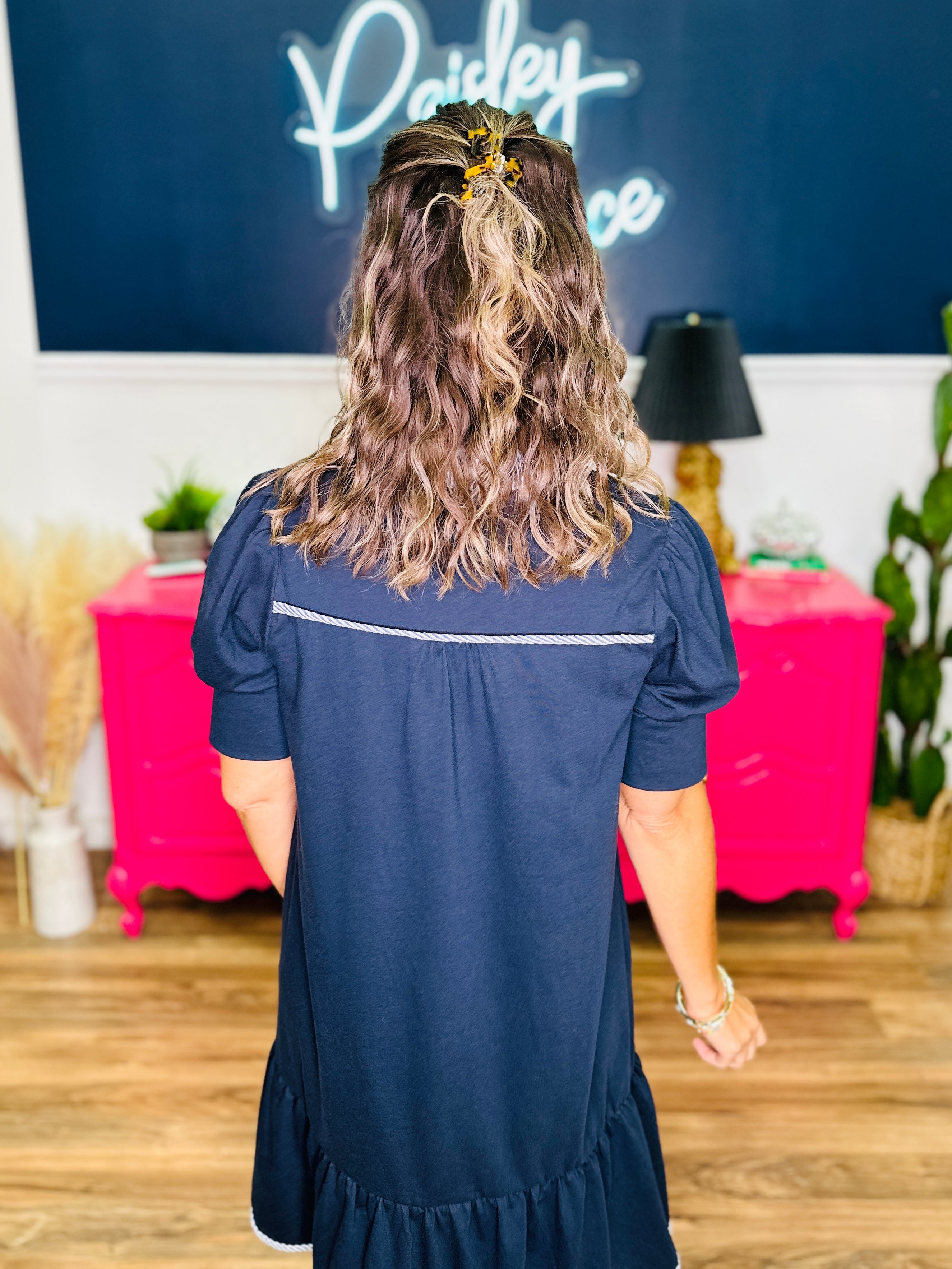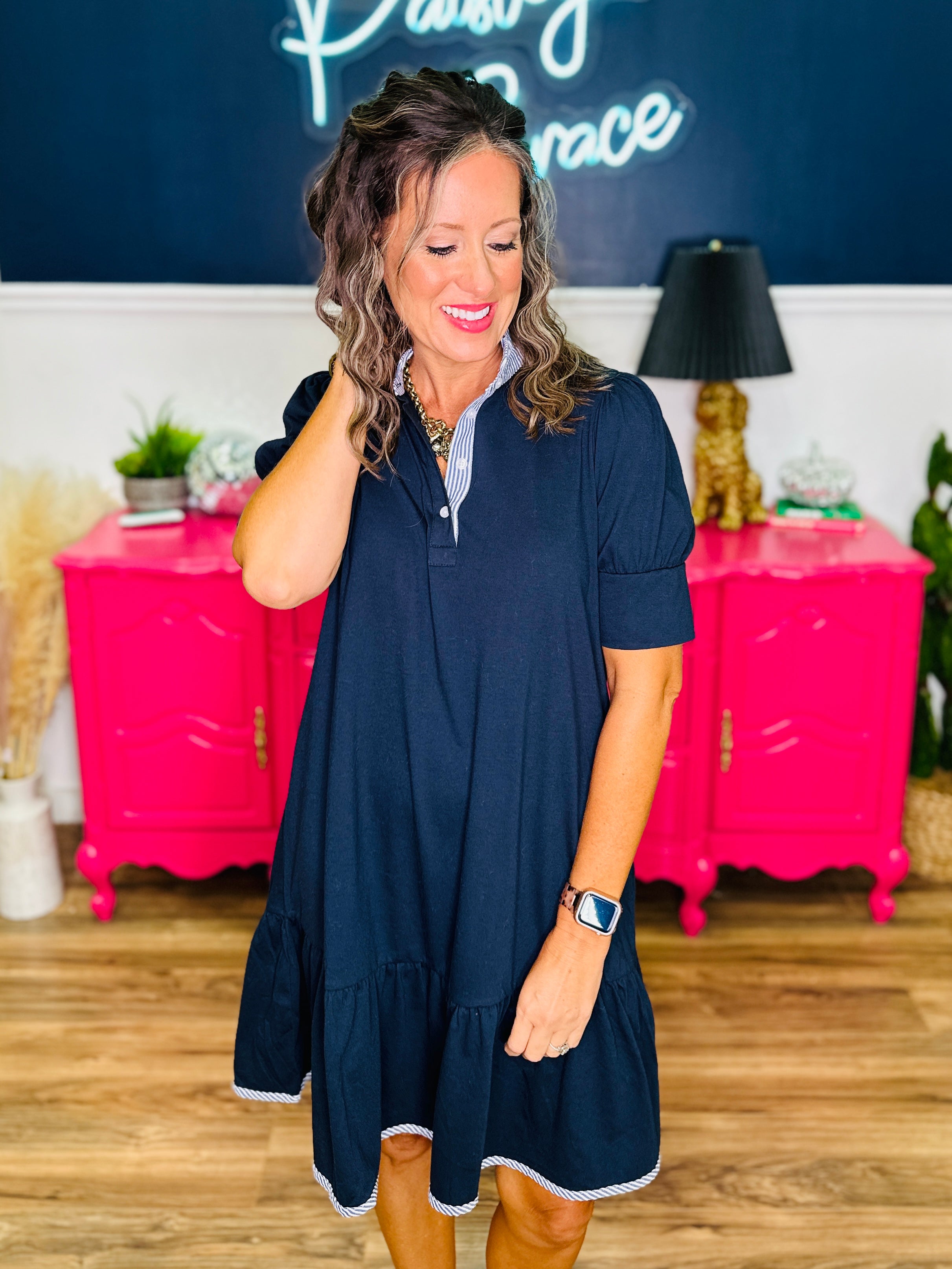 - Navy & White - Contrast Stripe Neckline & Hem