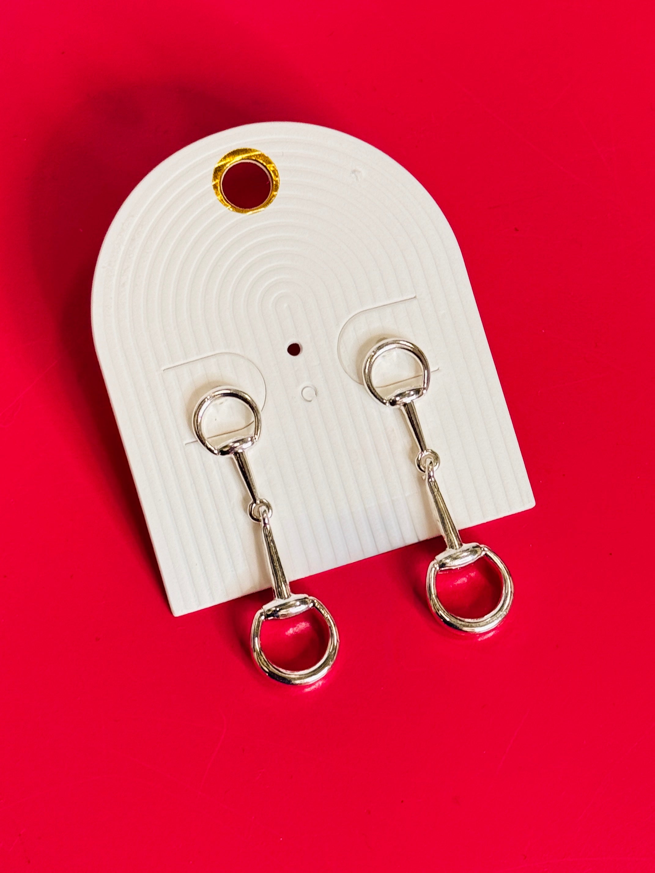 Featuring long silver horse bit dangle earrings.