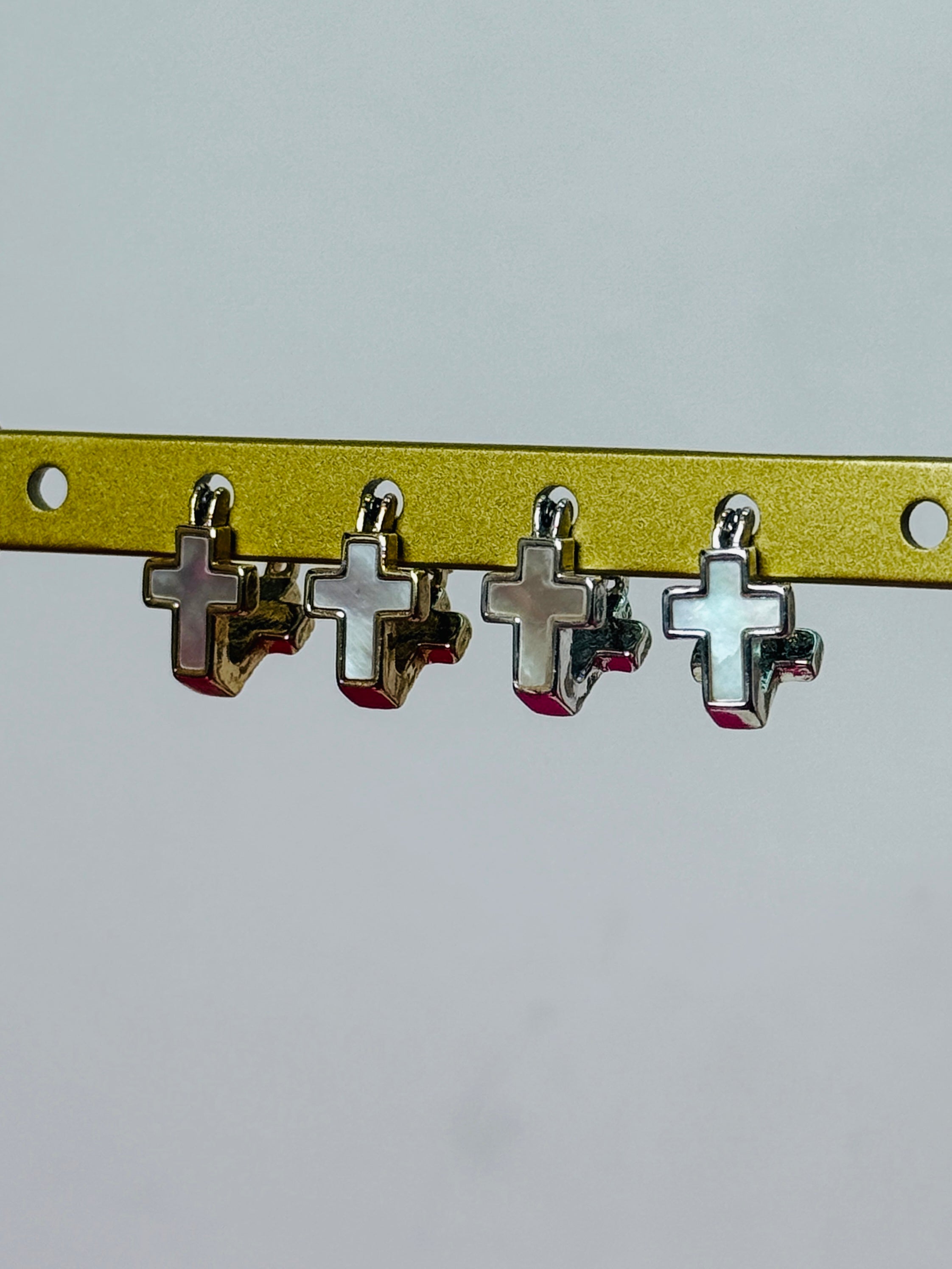 Featuring small cross huggie earrings with a pearlescent finish.