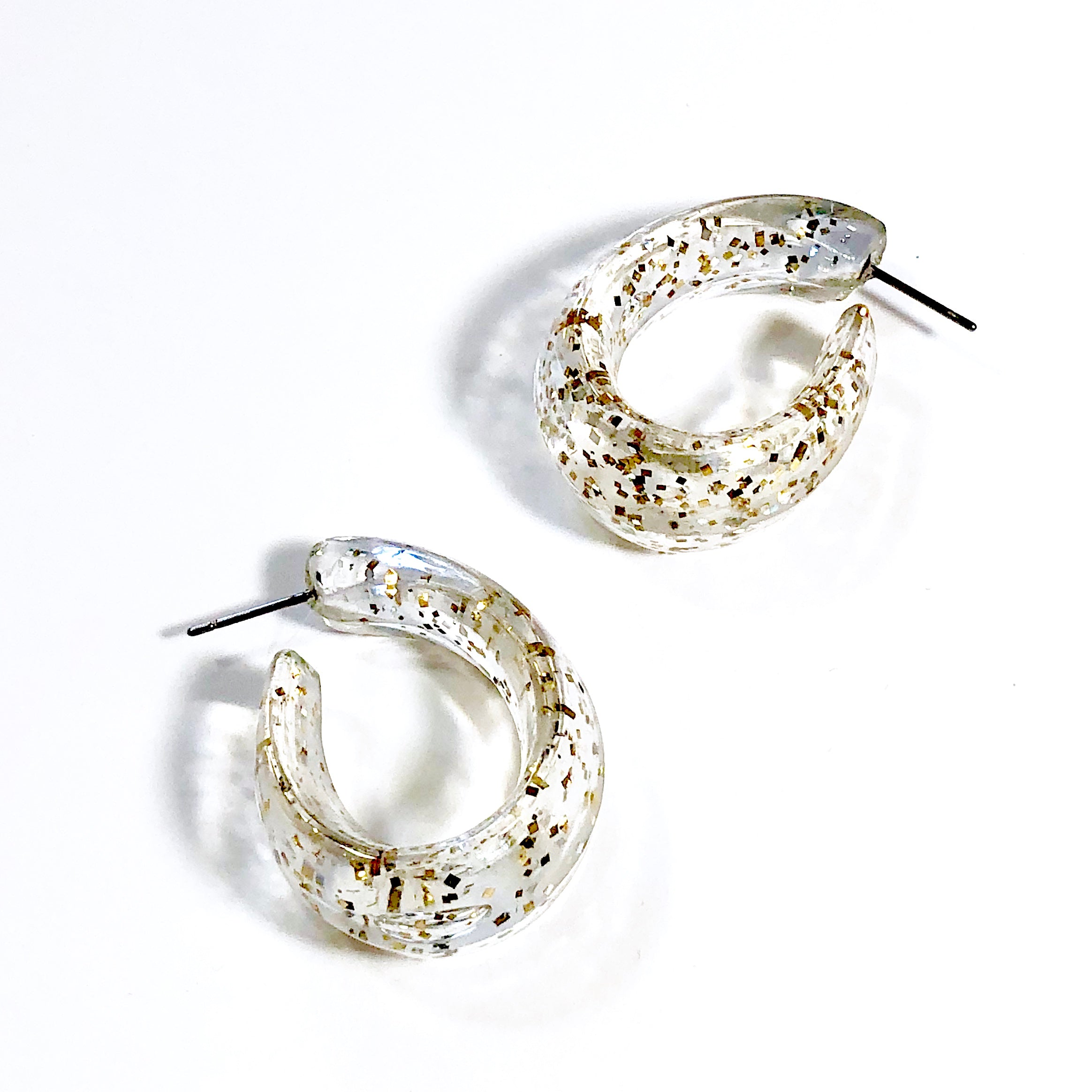 Metallic gold or blue glitter glistens within clear acrylic in these very vintage oval shaped hoop earrings. Each measures about 1.5 inches in length in a great light weight but chunky style.