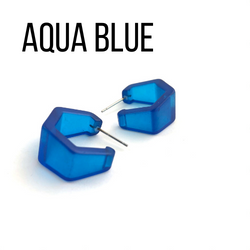 Hexagon-shaped hoop earrings in a wide & tapered shape known as the Hexagon Geo Hoop. Unlike other Hex Hoops in our collection, this is a wider hoop with a taper on each end. Each geometric shape has a faceted edge and measures about 1" or 24mm in diameter and 12mm in width at the widest point. Available in lots of fun colors.