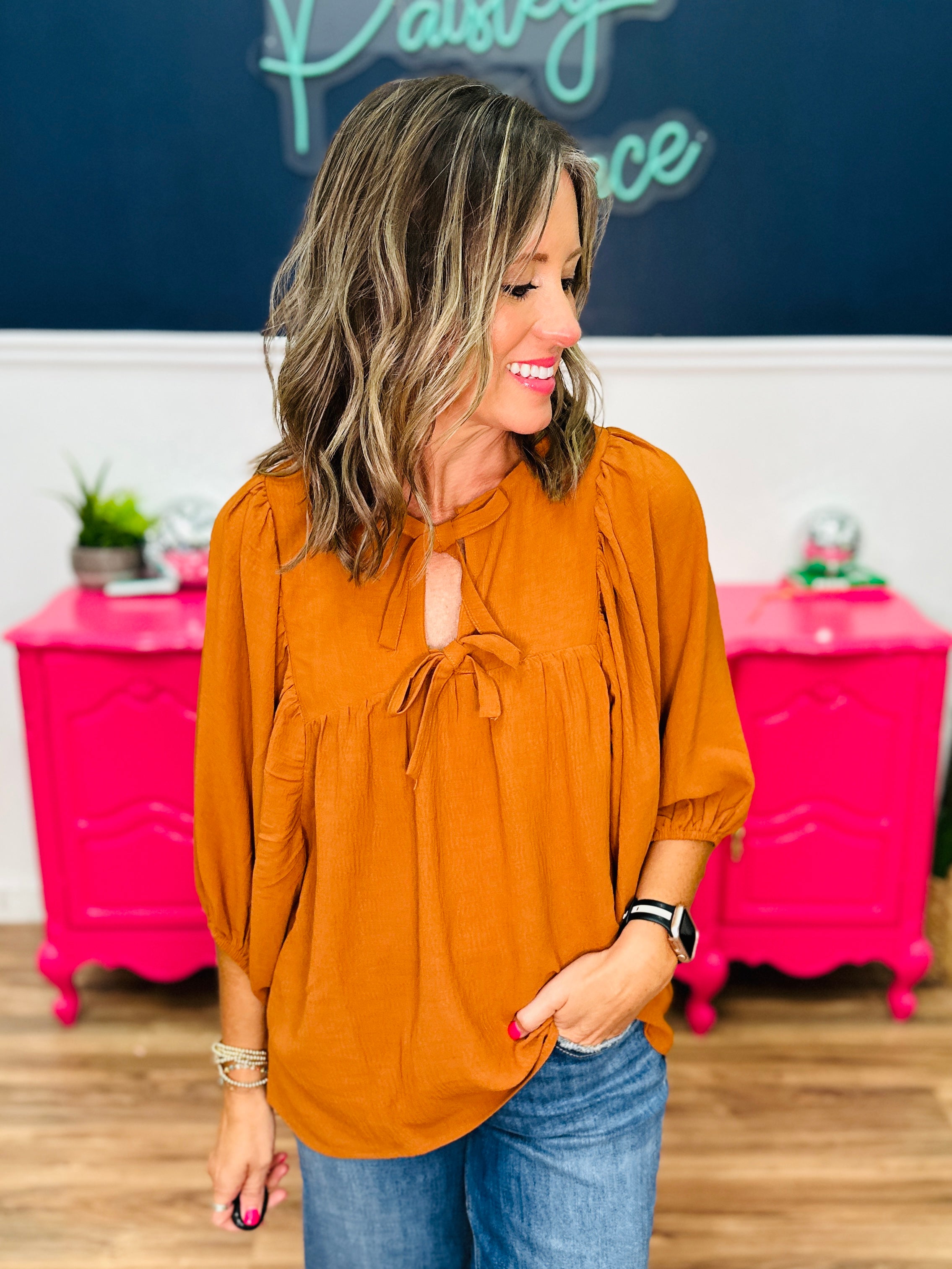 - Front Tie Ribbon Neckline | 3/4 Batwing Sleeves | Straight Hemline