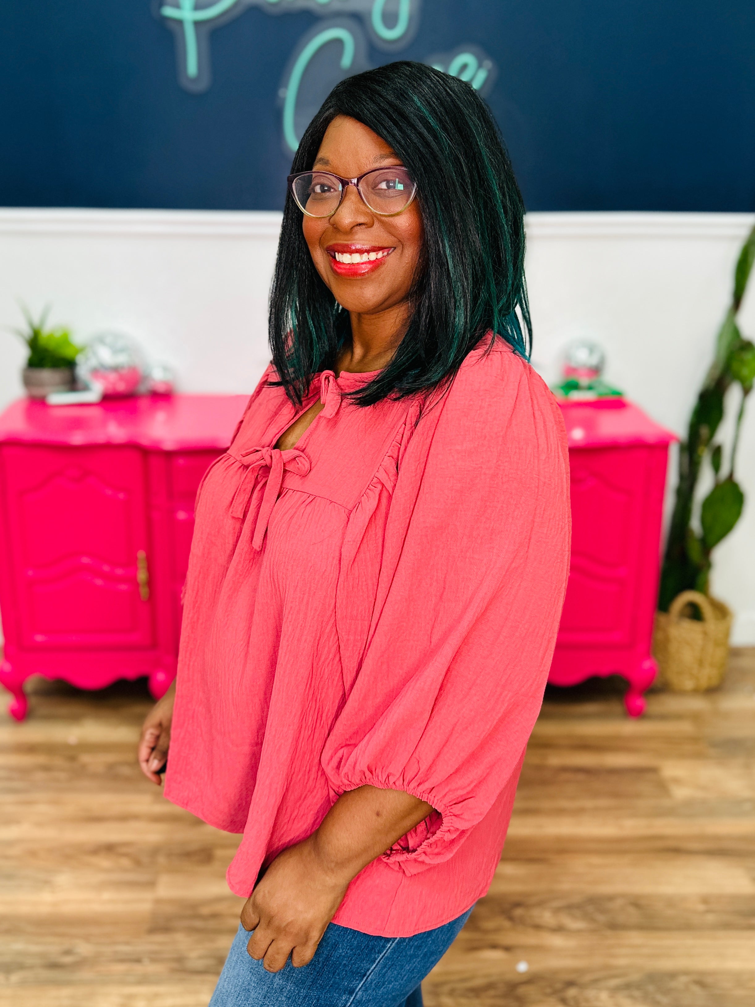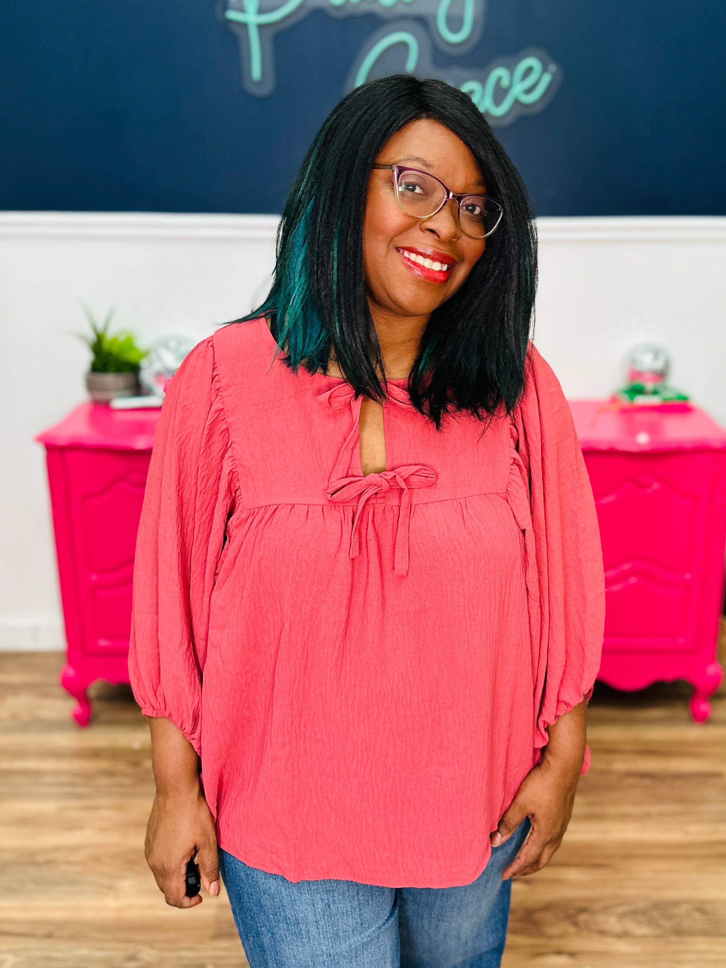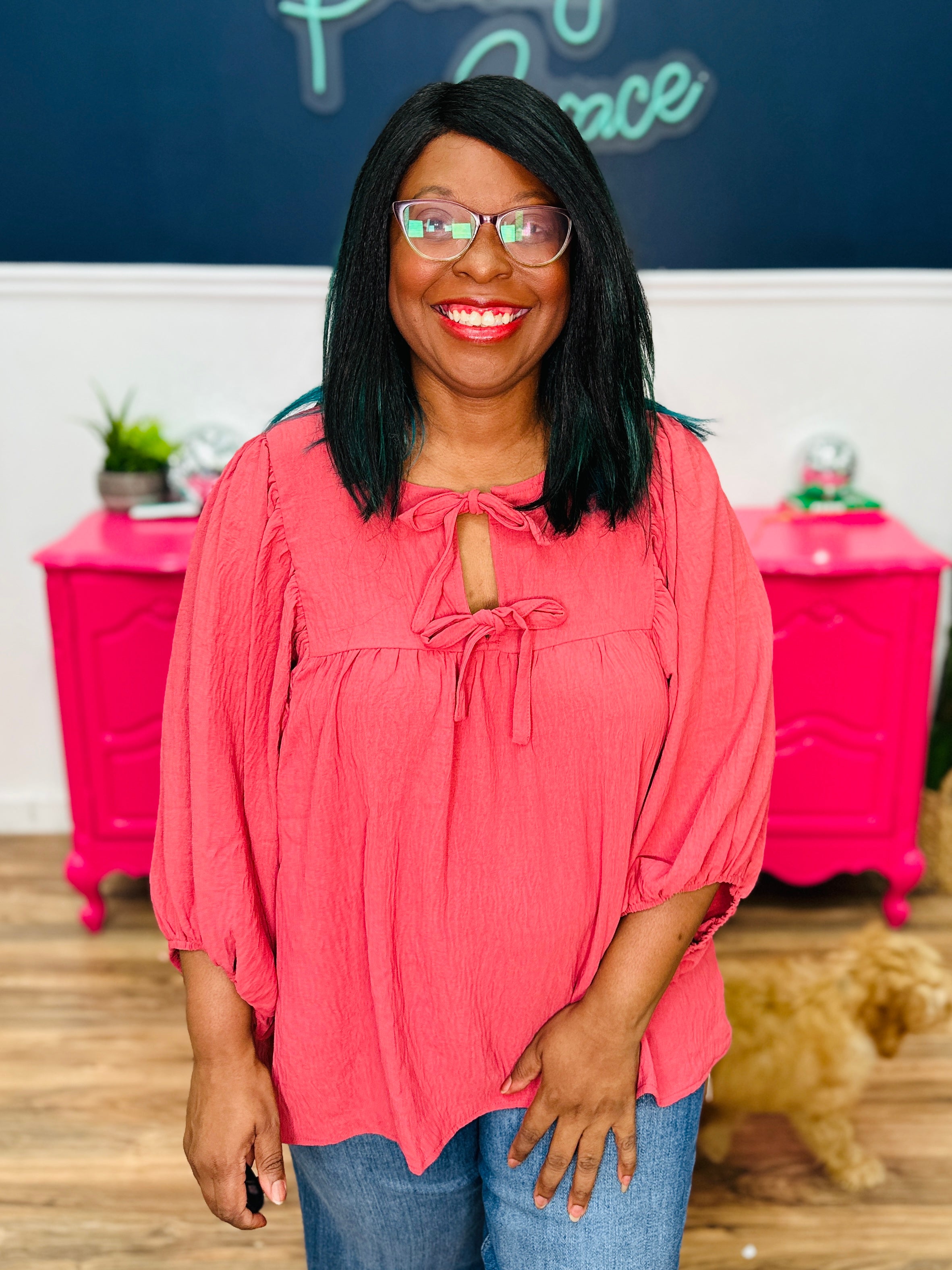 - Front Tie Ribbon Neckline | 3/4 Batwing Sleeves | Straight Hemline