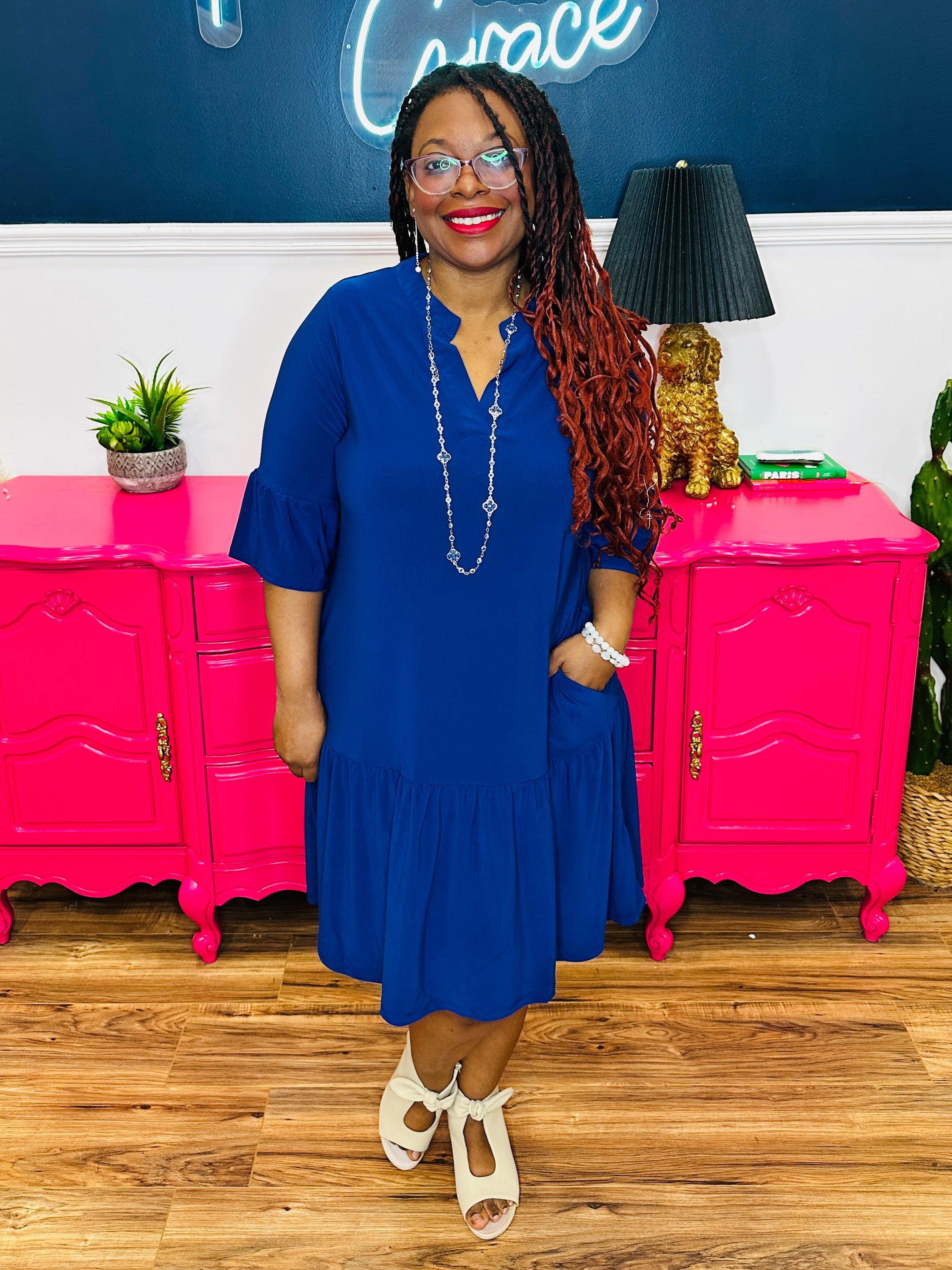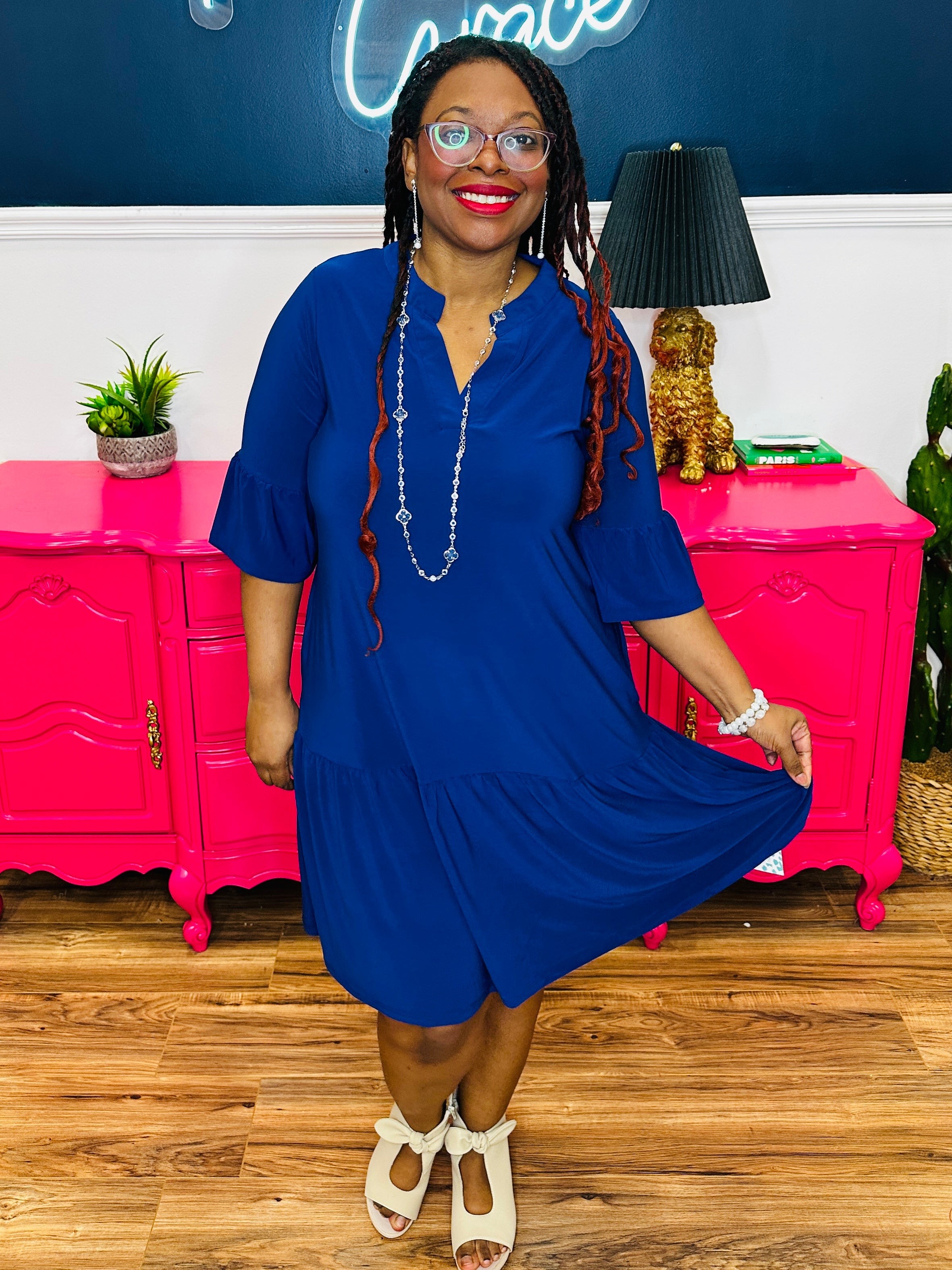 - Collared V-Neckline | 3/4 Sleeves | Tiered Hemline