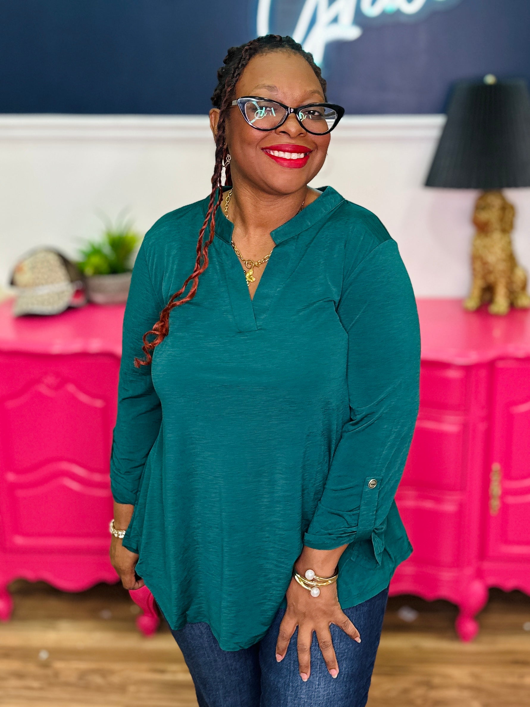 • Lizzy Style Neckline | 3/4 Roll Tab Sleeves | Curved Hemline