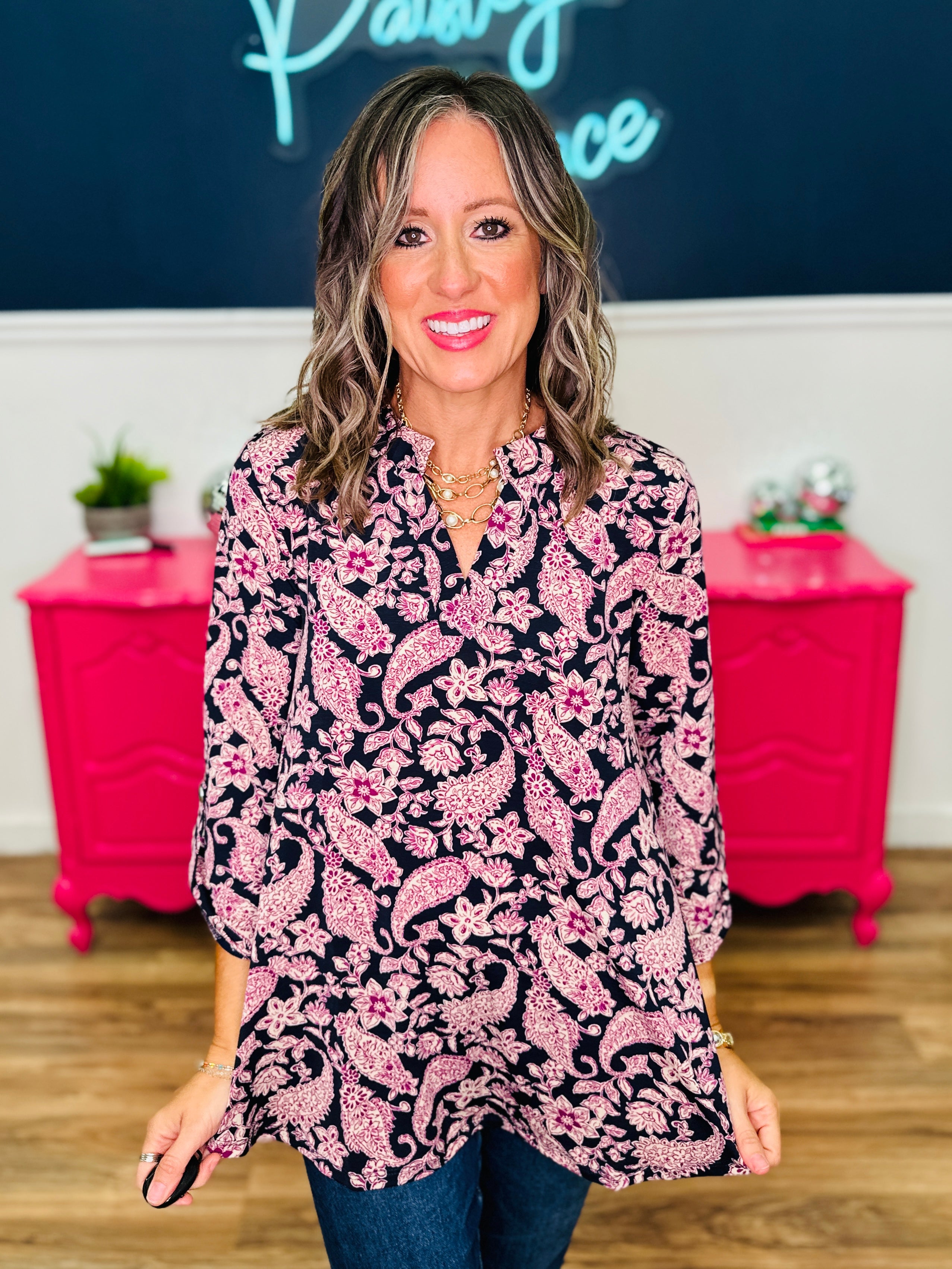 - Lizzy Style Neckline | 3/4 Roll Tab Sleeves | Curved Hemline