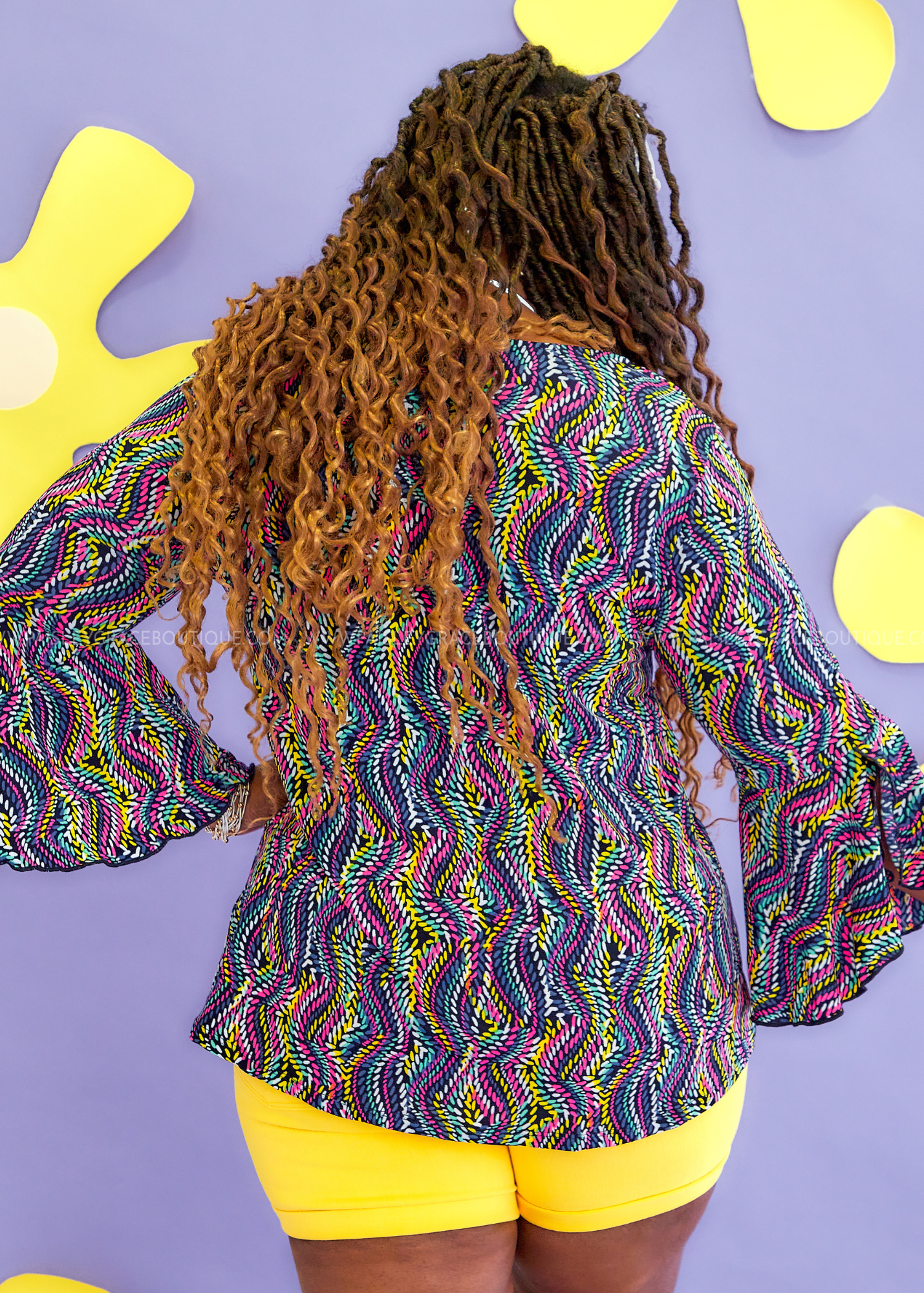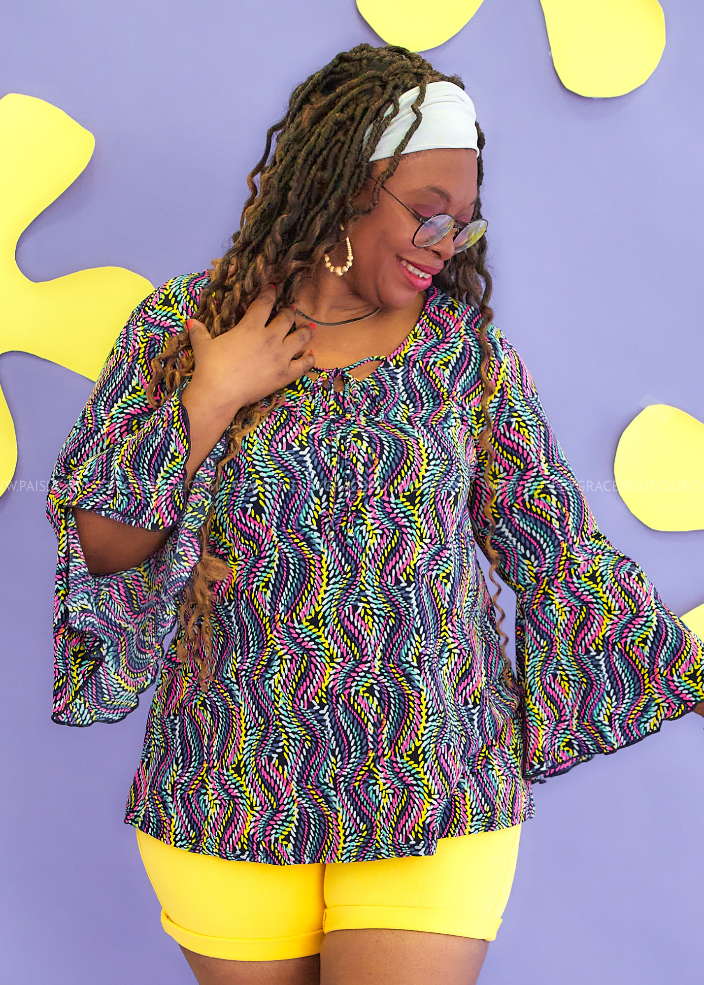 - Keyhole Neckline | 3/4 Bell Sleeves | Curved Hemline