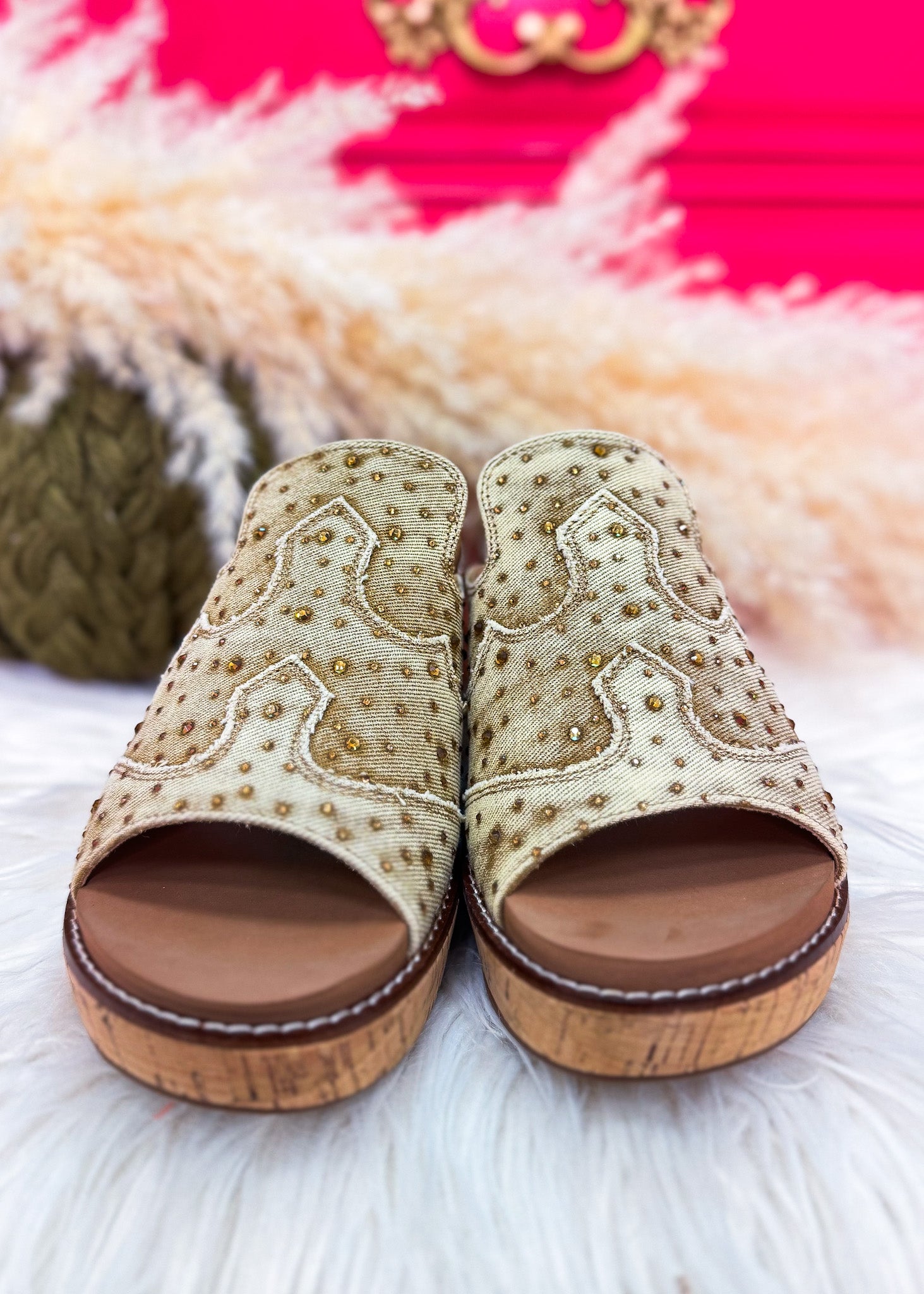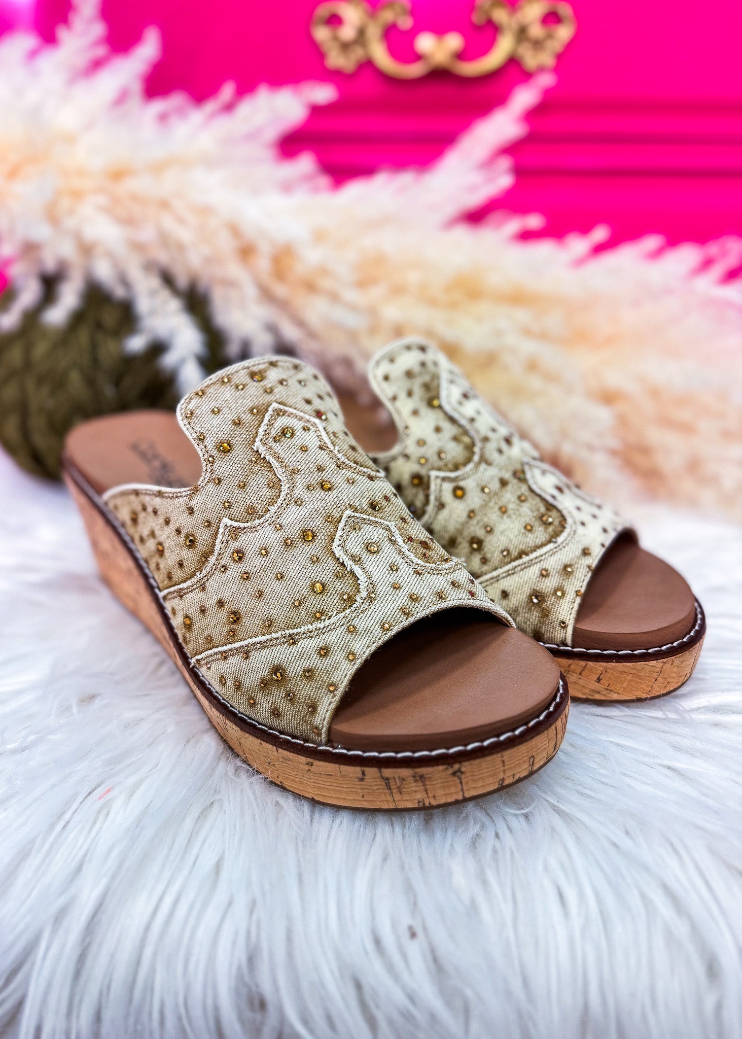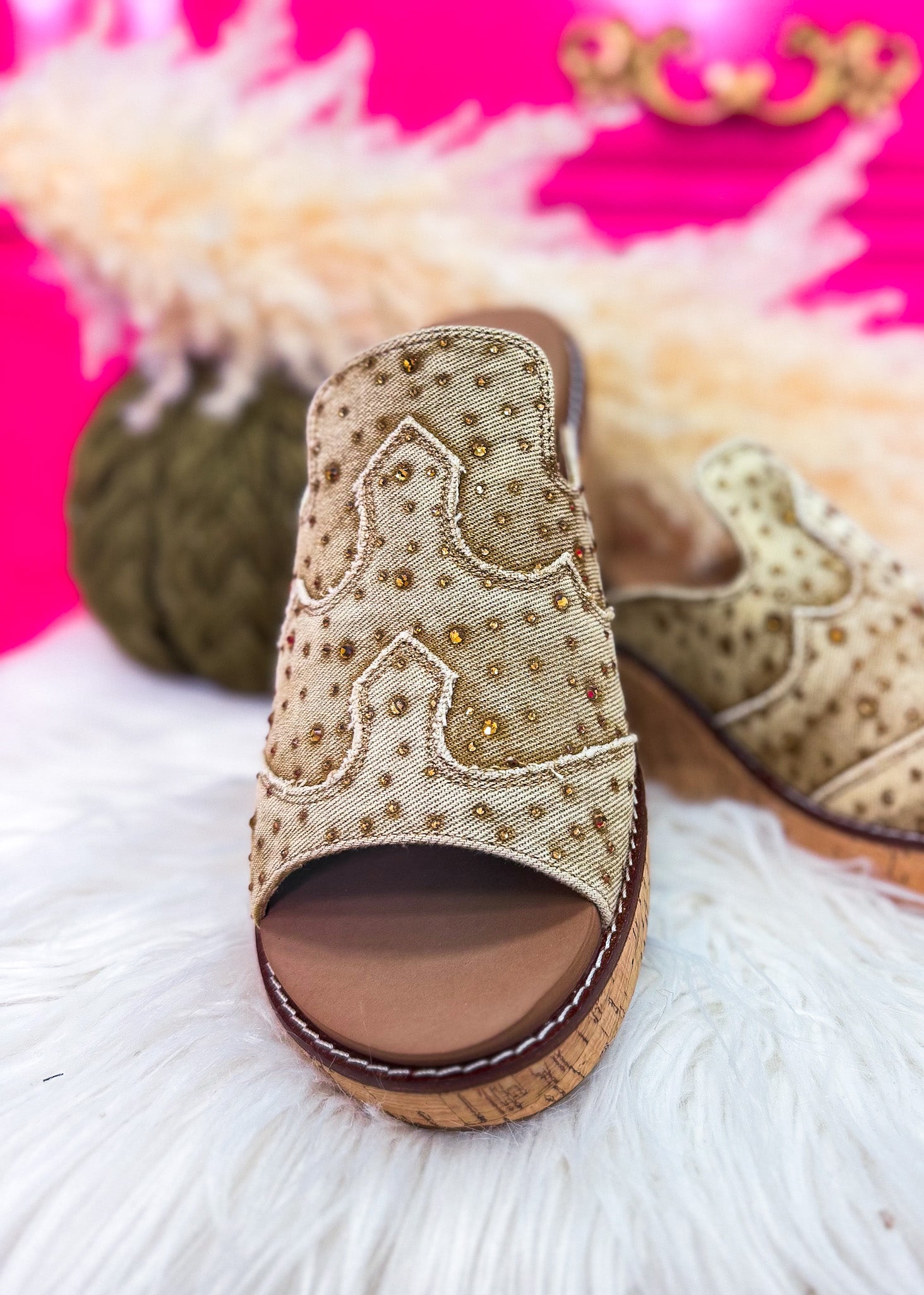 Shine on in these Corky’s wedge mules! A mineral-washed tan upper with sparkling rhinestones gives laid-back glam, while the cork platform keeps things comfy and light. Just slip them on, and you’re ready to glow from day to night.