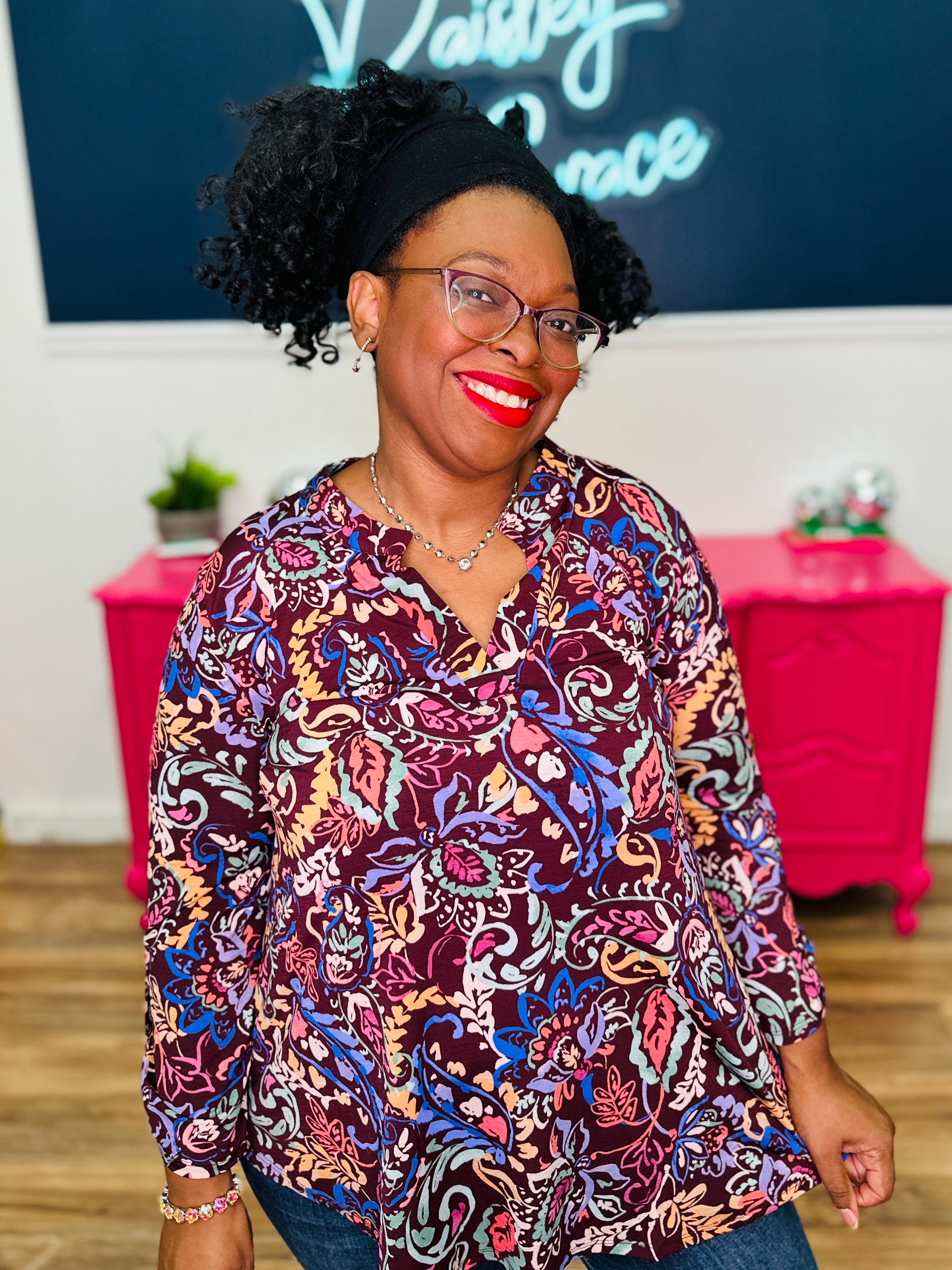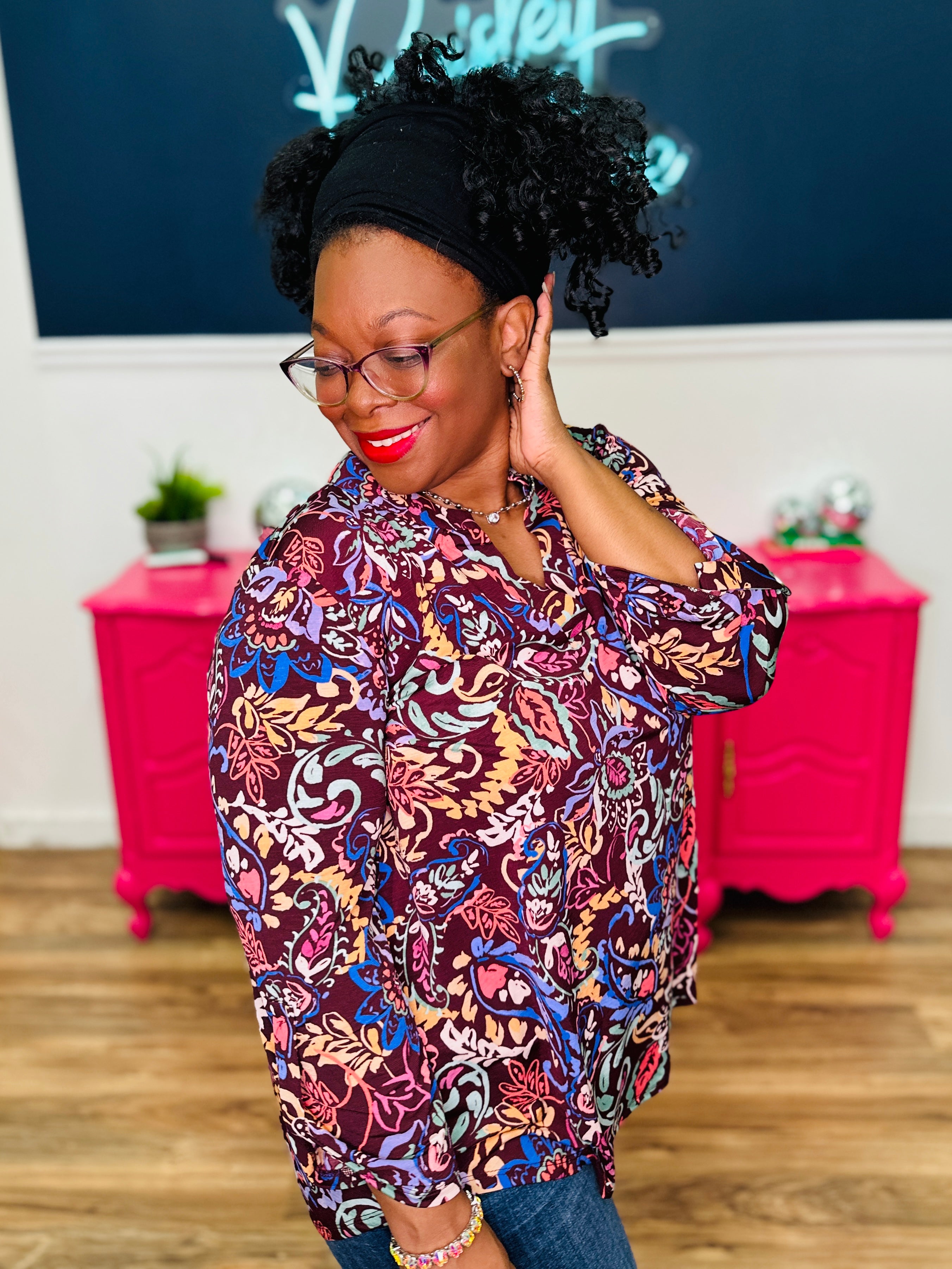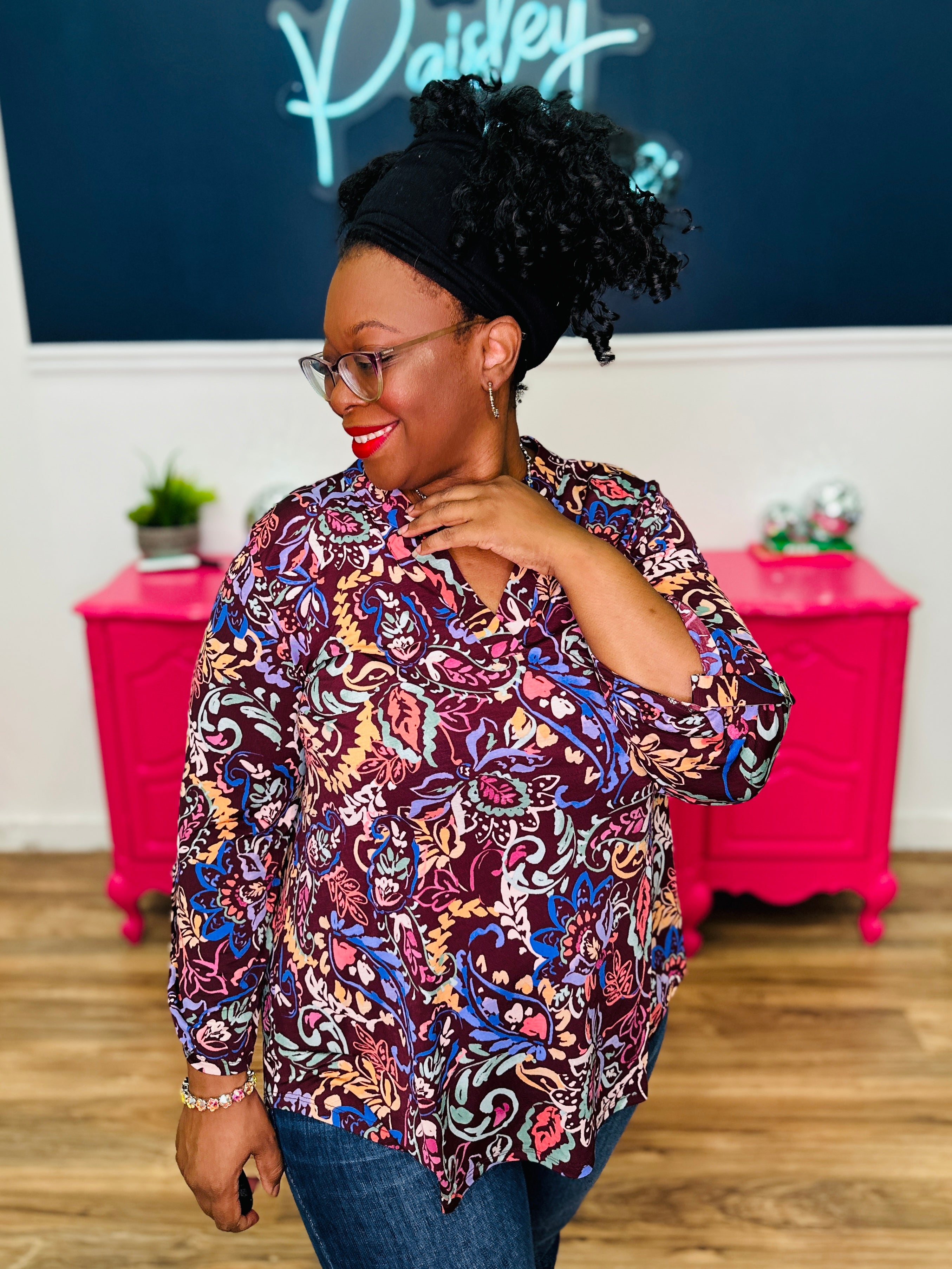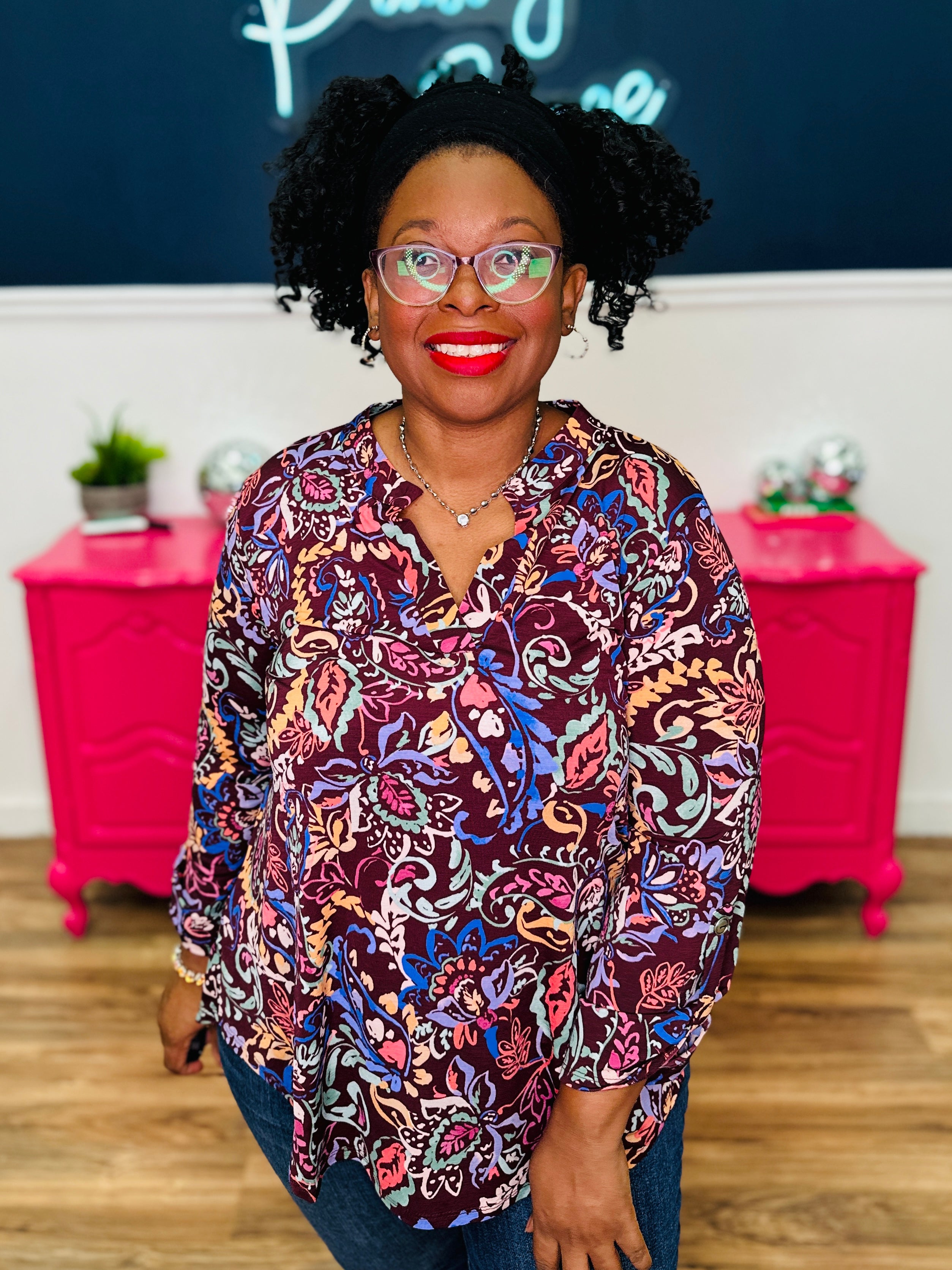 • Lizzy Style Neckline | 3/4 Roll Tab Sleeves | Curved Hemline