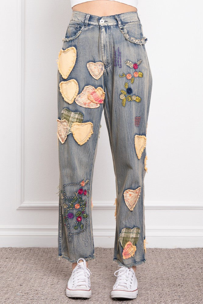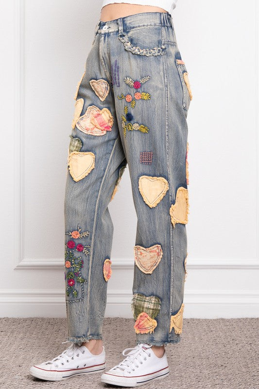 These adorable heart patchwork jeans feature a full-length relaxed boyfriend fit that's both stylish and comfortable. The elastic back waistband provides the perfect amount of stretch, while the zipper and button closure ensures a secure fit. Crafted from mid-weight denim with charming frayed leg openings, these garment-washed jeans will become your new favorite casual staple.
