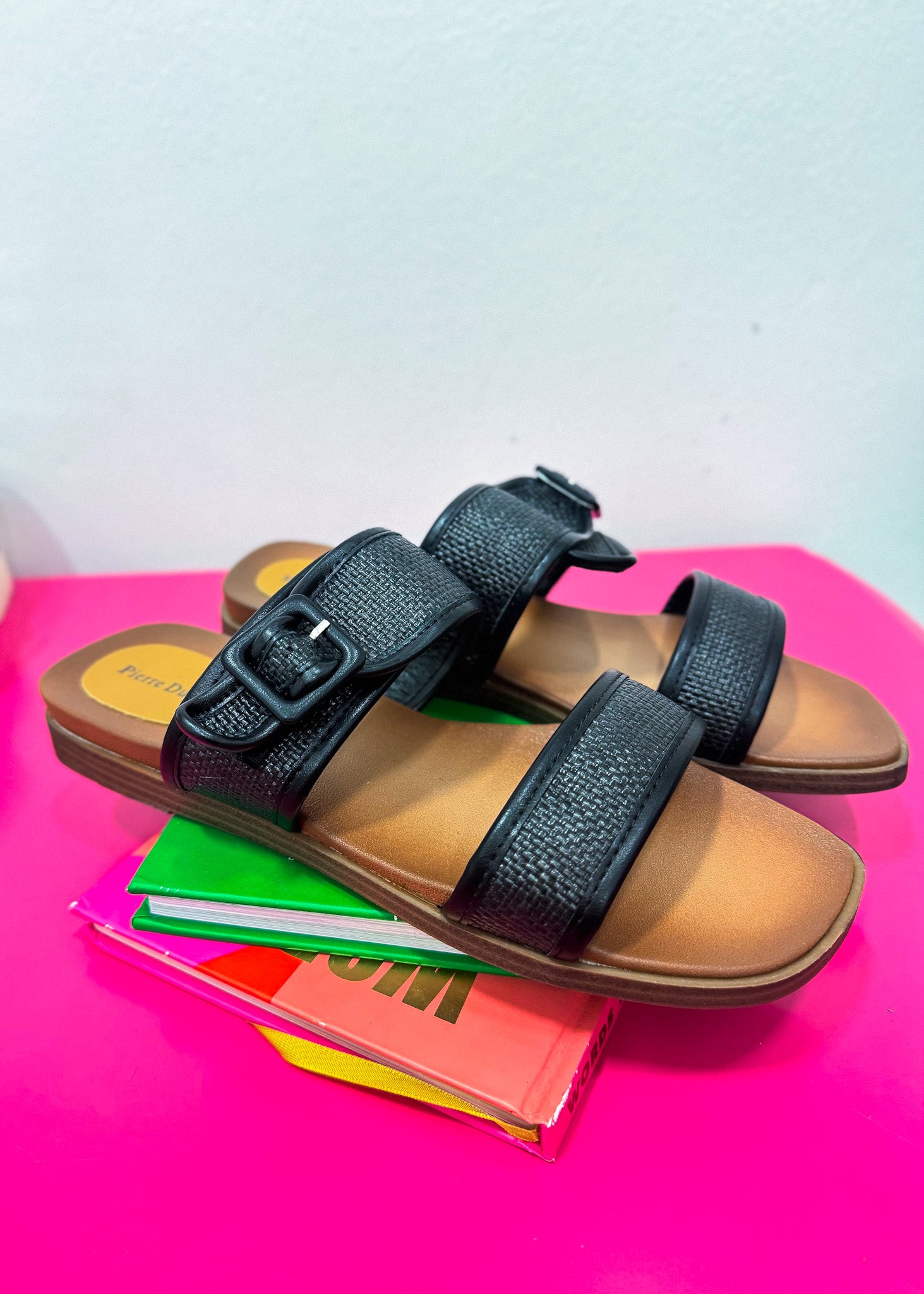 Say hello to your new favorite slides — the Karlie Sandals! With chic black woven double straps, a polished buckle accent, and ultra-cushioned soles, these beauties bring the perfect blend of edge and ease. Whether you're dressing up denim or keeping it casual, Karlie’s got your back (and your feet).