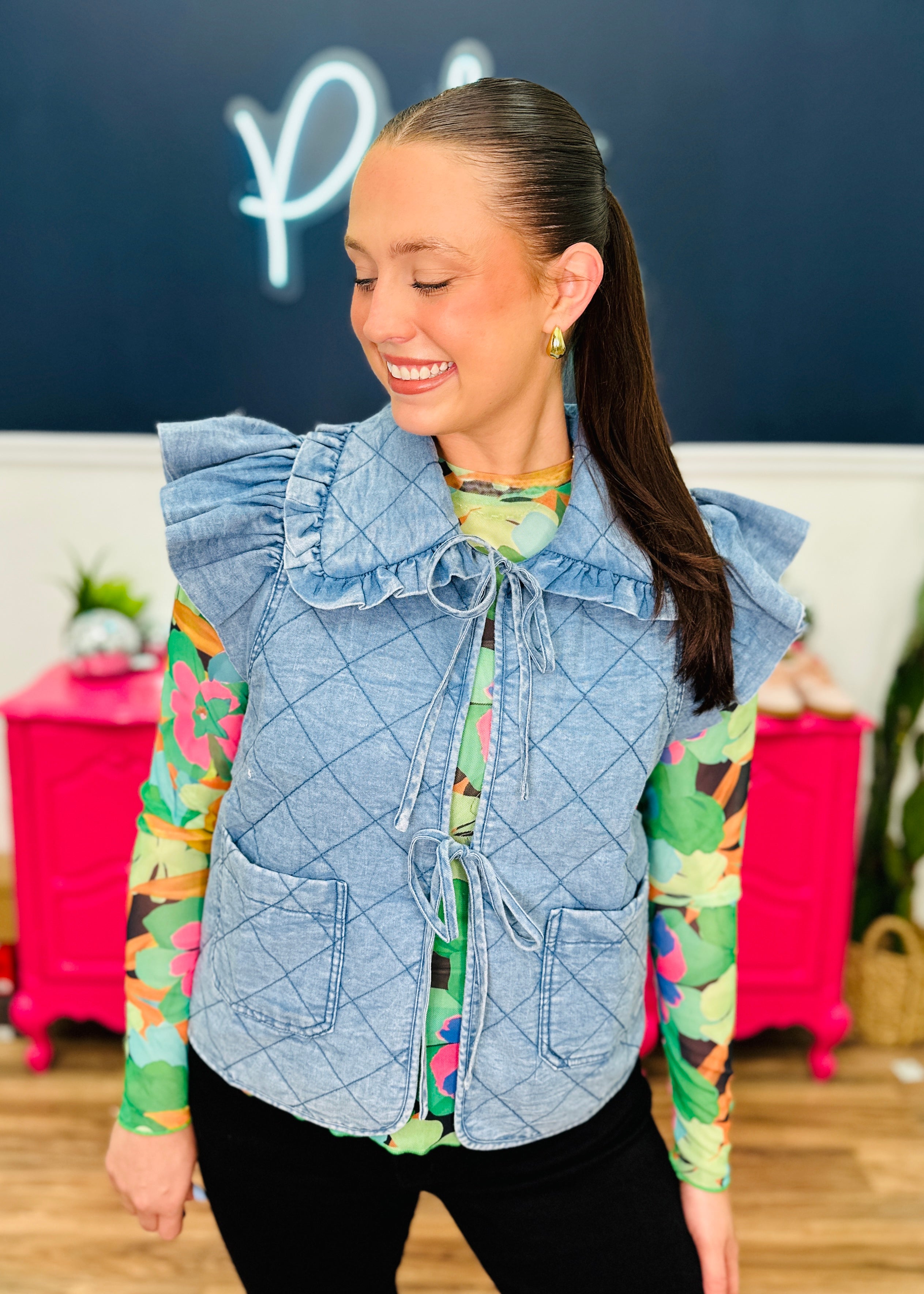 • Tie Front | Ruffled Peter Pan Collar | Cap Ruffle Sleeves | Straight Hemline
