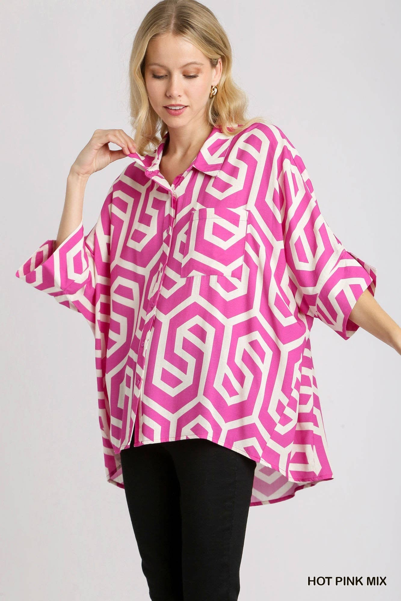 - Collared Neckline | 3/4 Split Sleeves | High-low Hemline