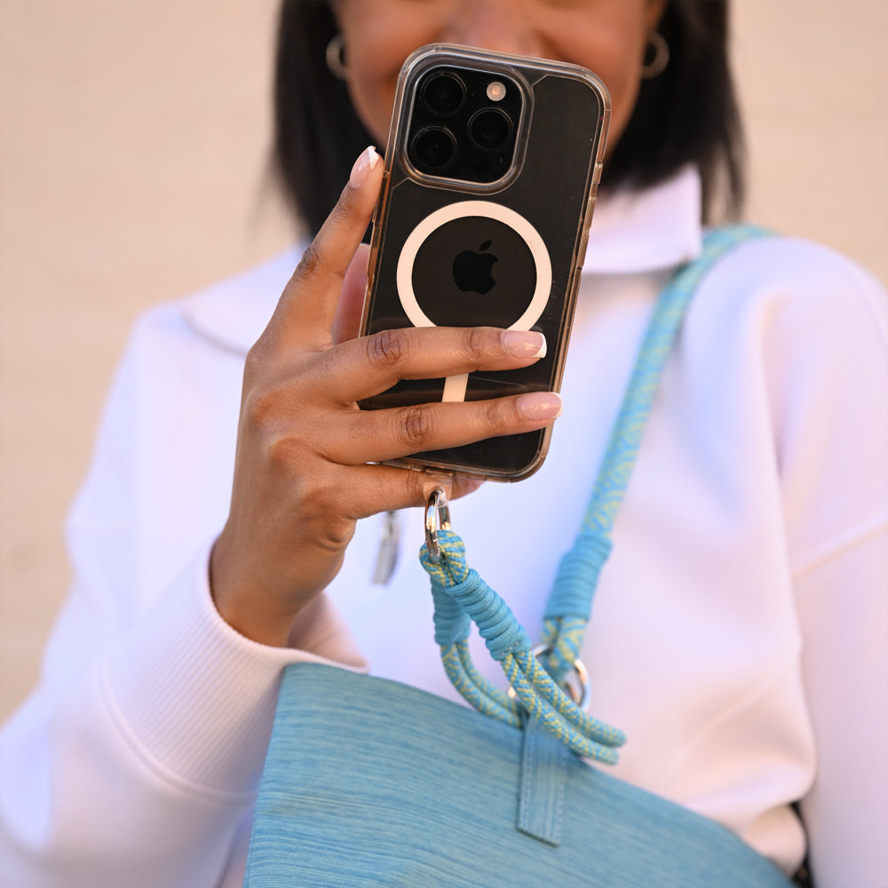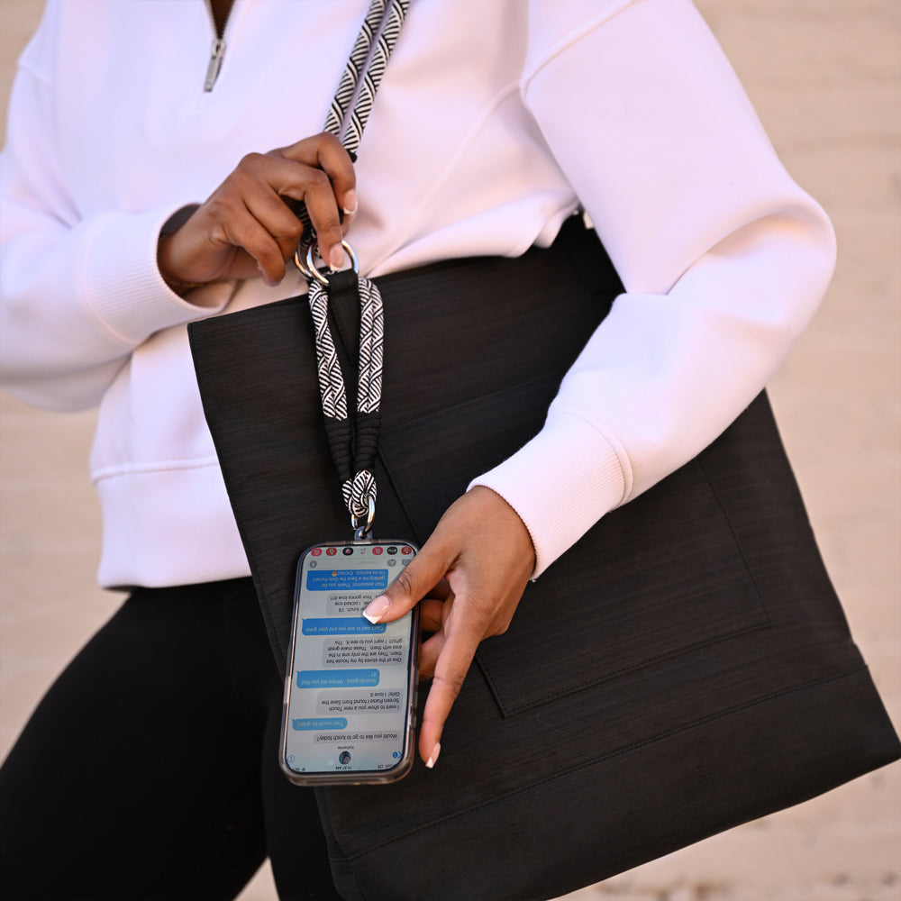 Who says you can't take it with you? Our new Active Tote makes it easy! Soft rope shoulder strap, main interior pocket large enough to carry your laptop. Two interior pockets, one open with magnetic snap closure, and one zippered. Thoughtful design that includes interior Key Chain Fob and a color coordinated wristlet with phone card. Wristlet can be worn separately, or conveniently hung from the tote's shoulder strap. Place the phone card in your phone case, slip the phone into the exterior front tote pocket and go!