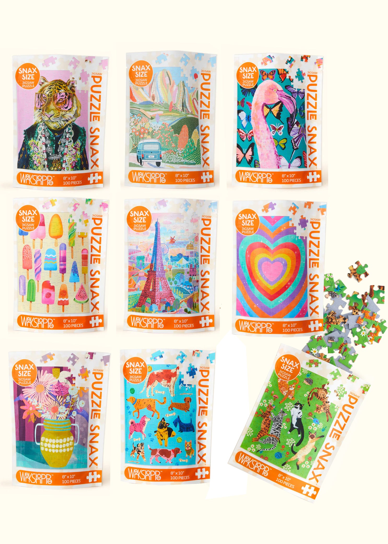 Explore the world of puzzles with this snack-sized 100-pc set! Including fun artwork, these jigsaw marvels give you the satisfaction of a full-size puzzle without the stress. Cleverly constituted with 100% recycled paper board and made with non-toxic ingredients, they're ready to take on and share with friends--all stored in a resealable pouch. Get ready to piece together some fun!