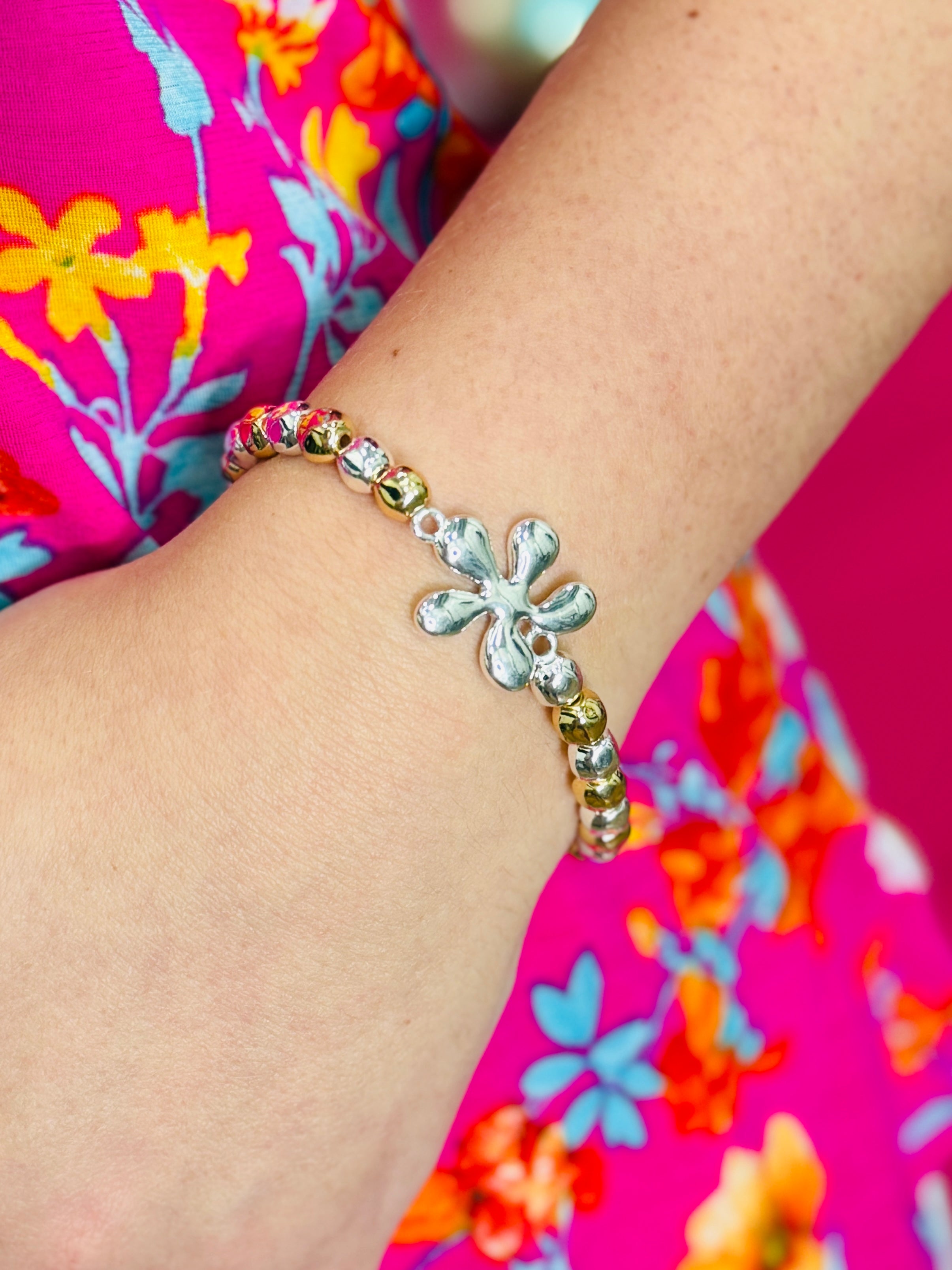 Featuring a two-tone beaded bracelet with silver flower bead detail.