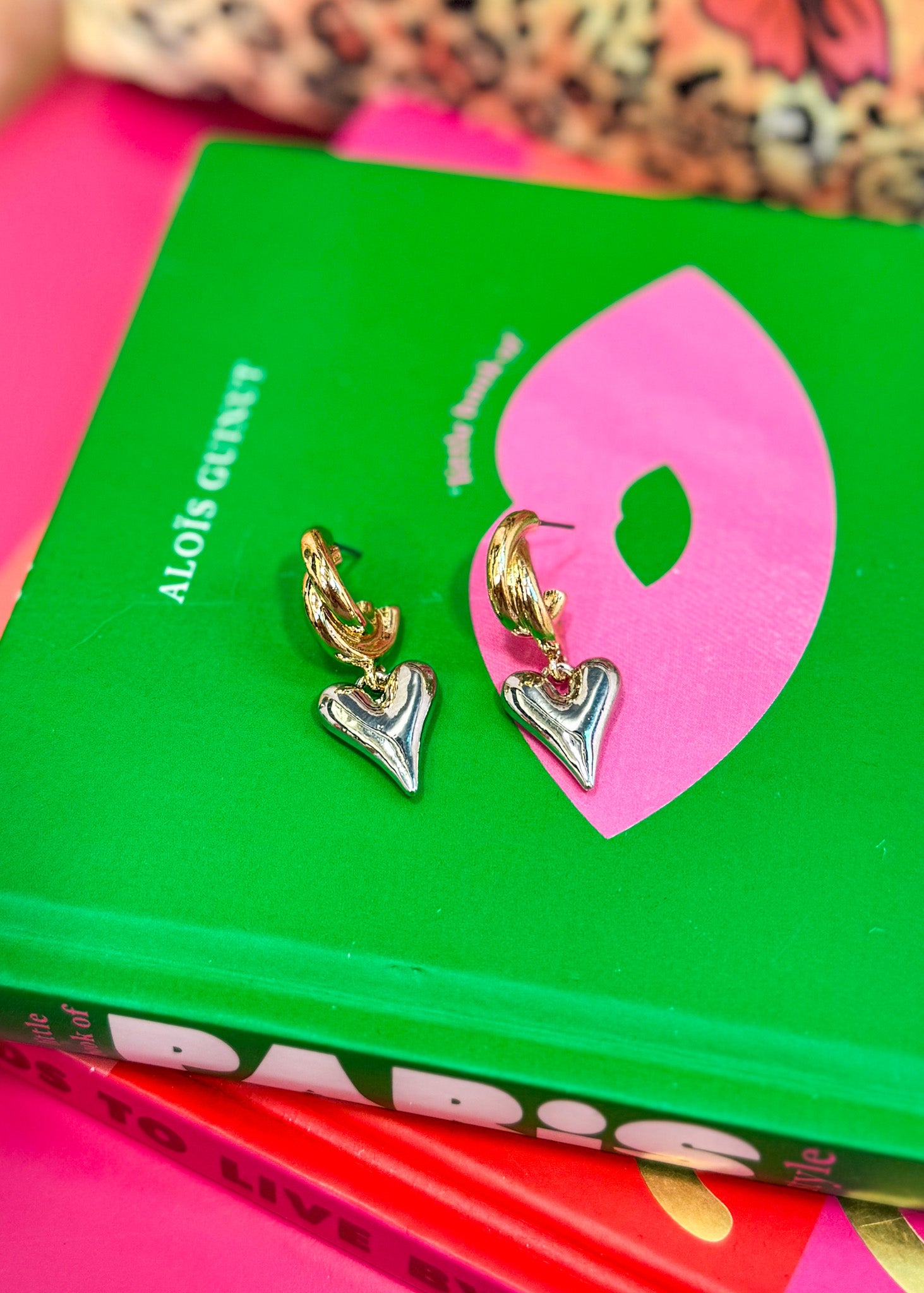 Featuring two-tone hoop earrings with heart charms.