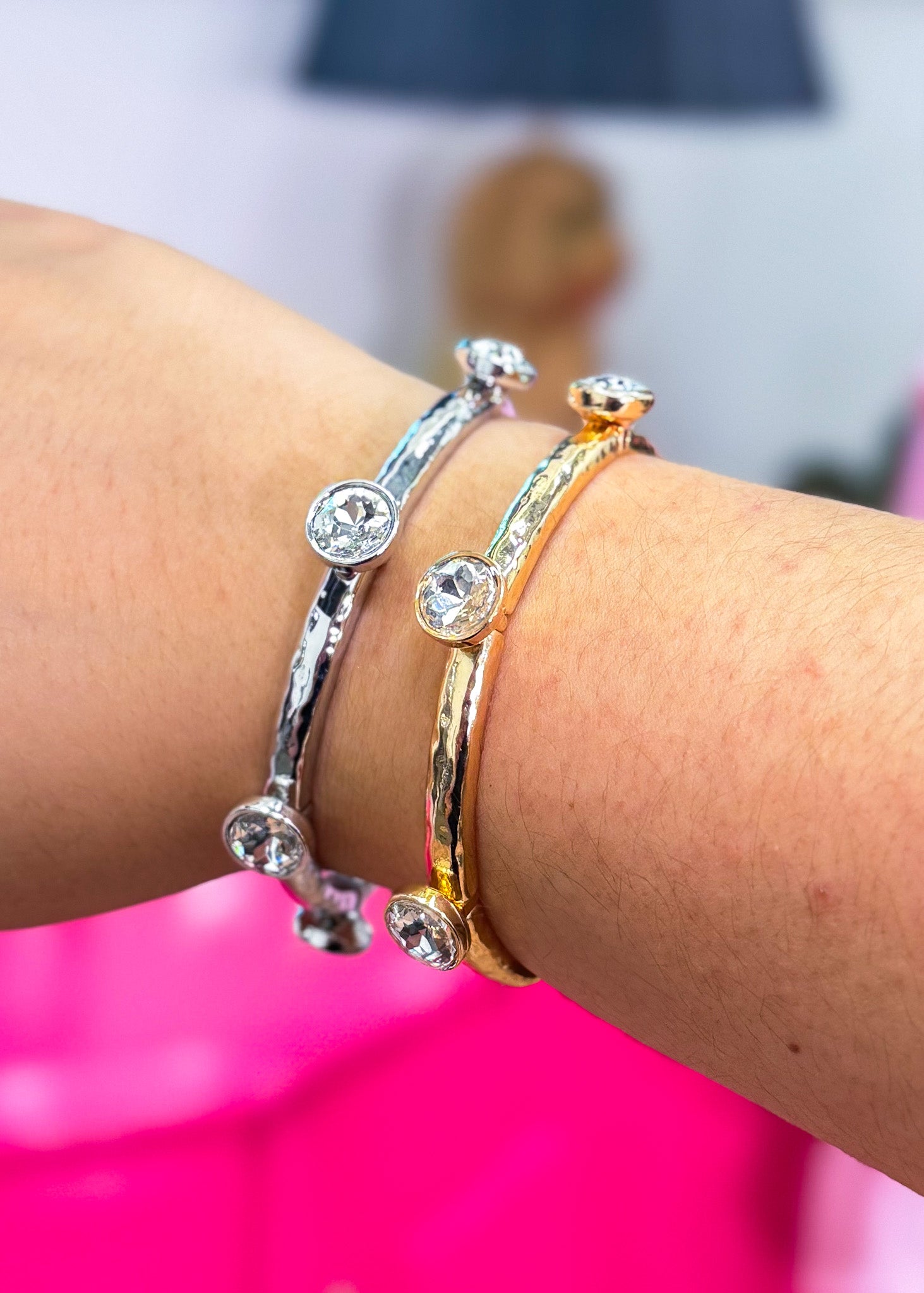 Featuring sparkly clear crystal accented stretch bangle bracelets. Available in gold or silver.
