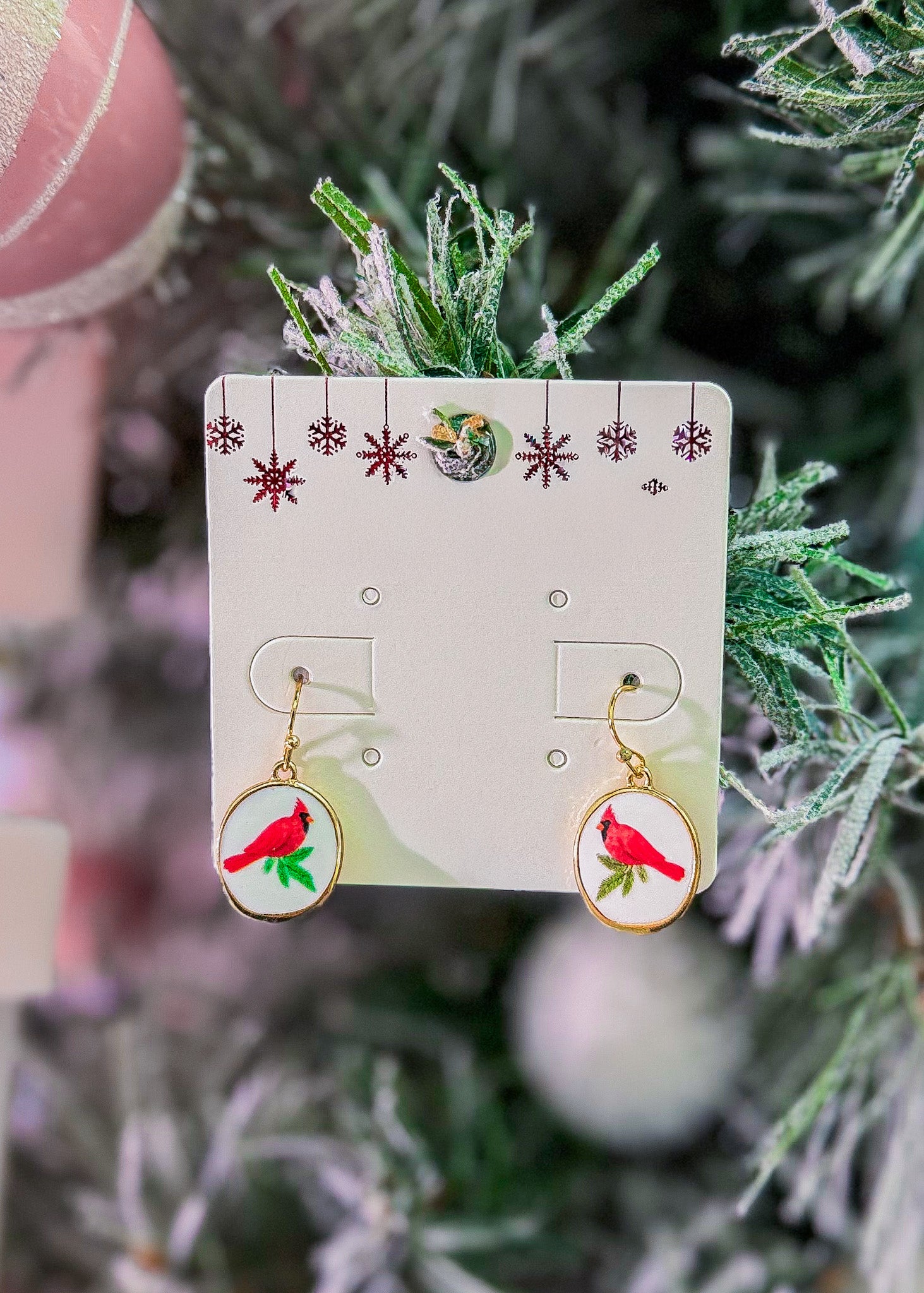 Featuring small round red cardinal earrings.