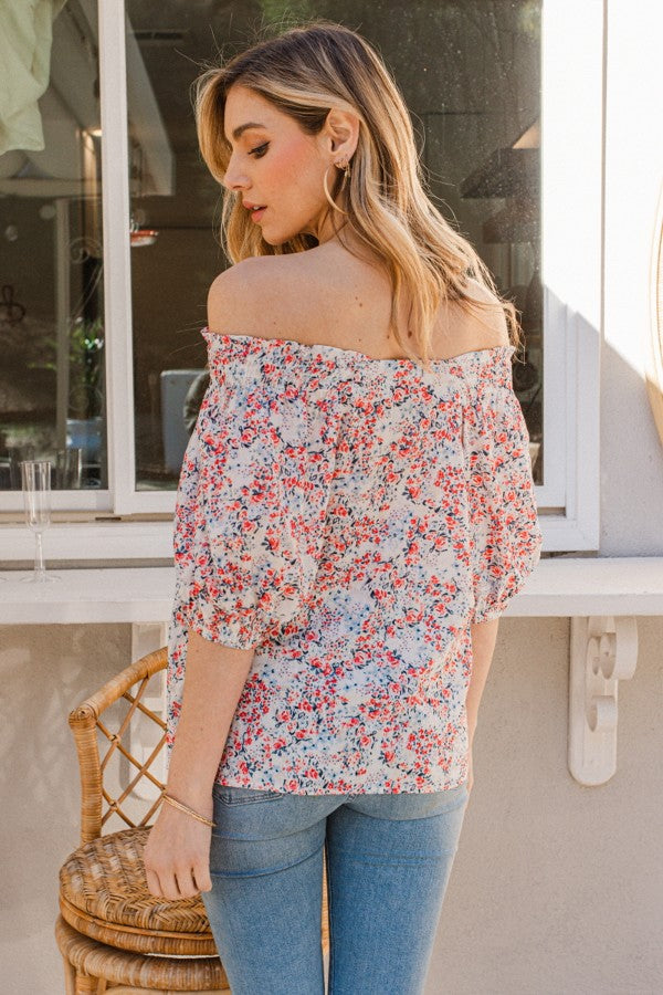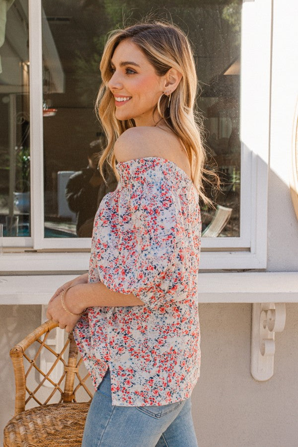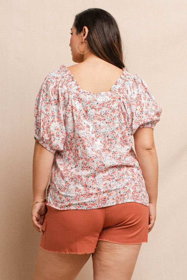 Smocking Detail On Shoulder, Puff Short Sleeve, Floral Print Woven Blouse