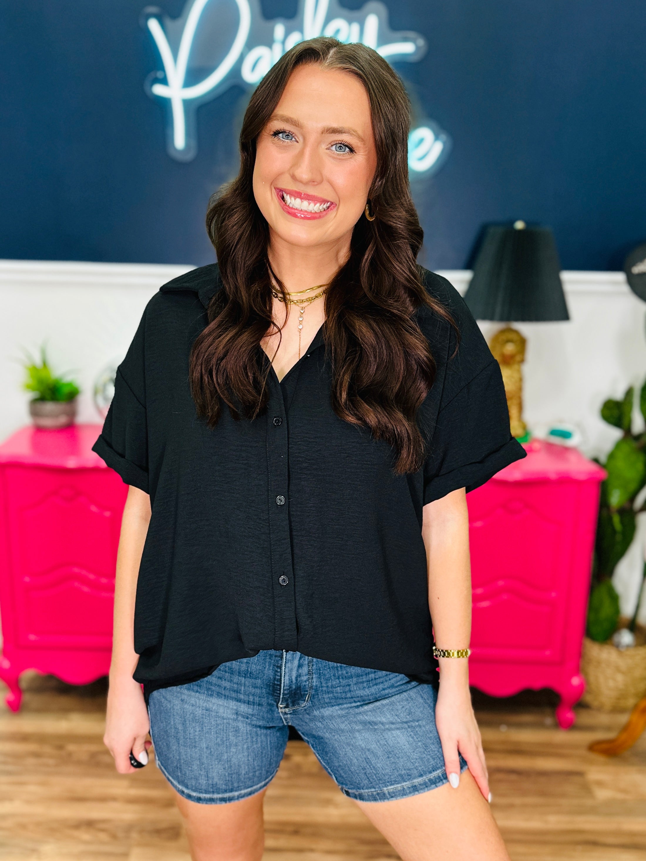 - Collared Neckline | Short Drop-shoulder Sleeves | Curved Hemline