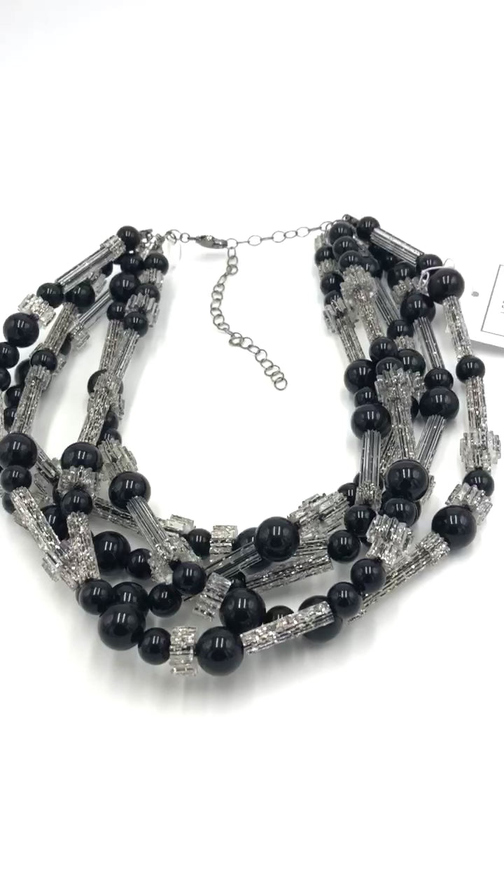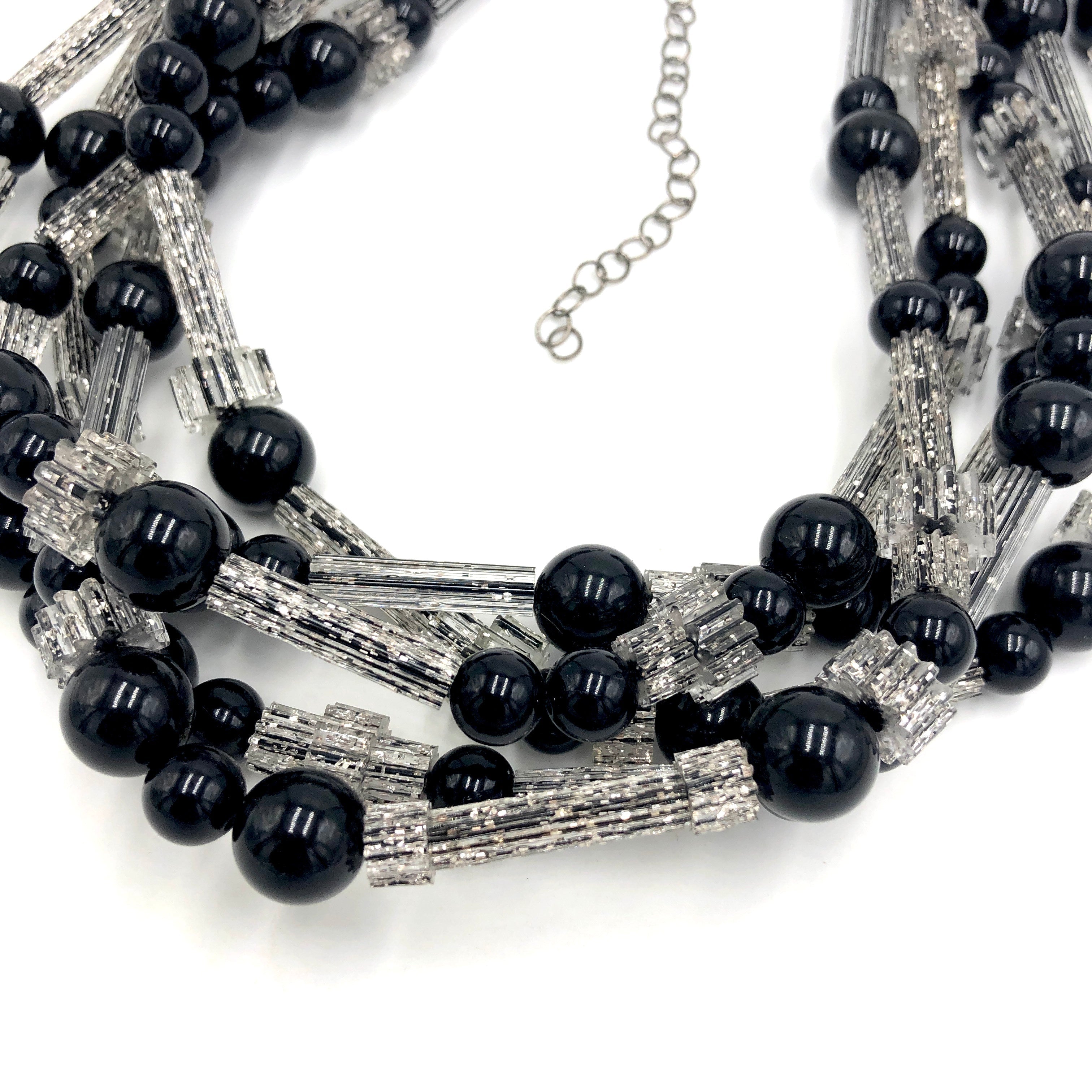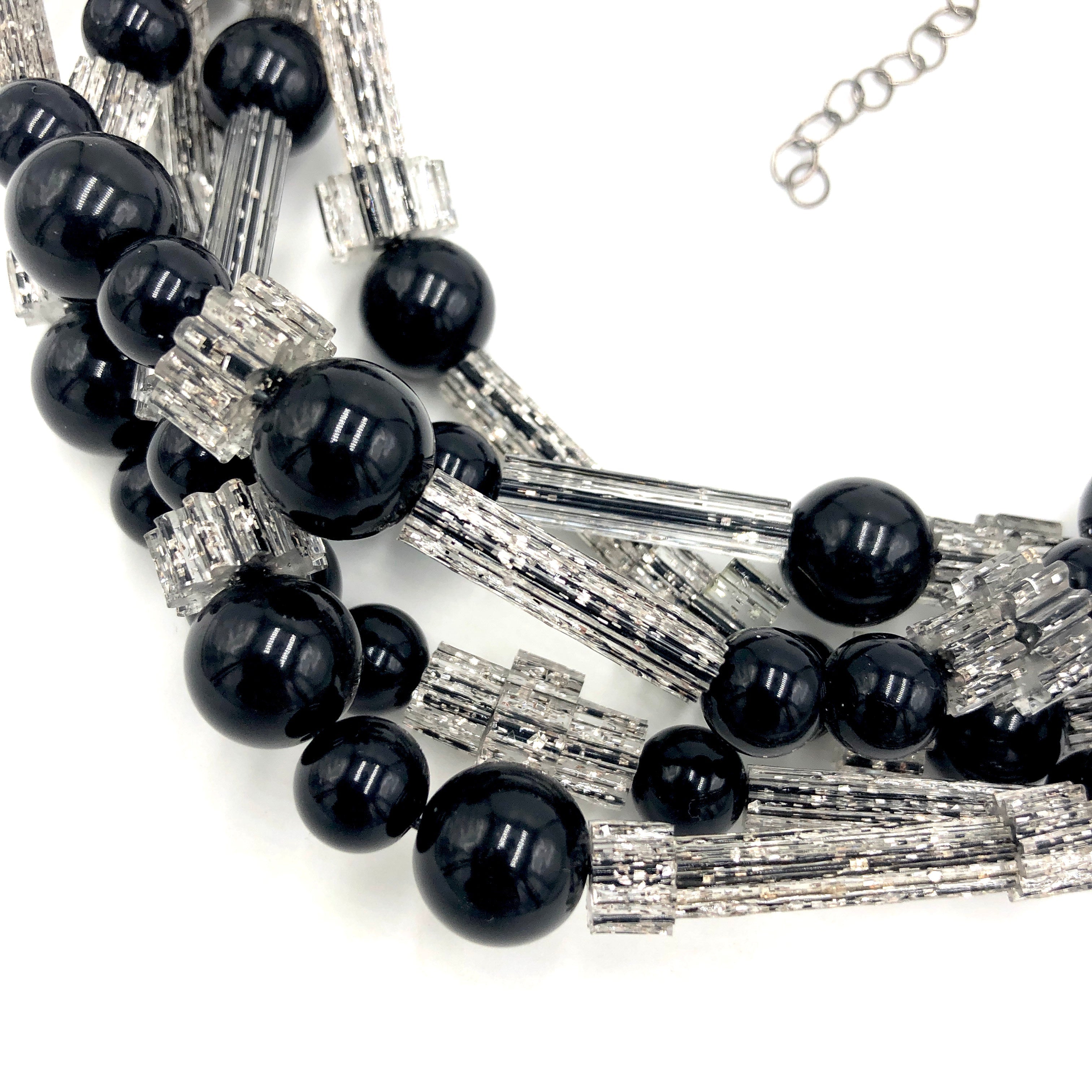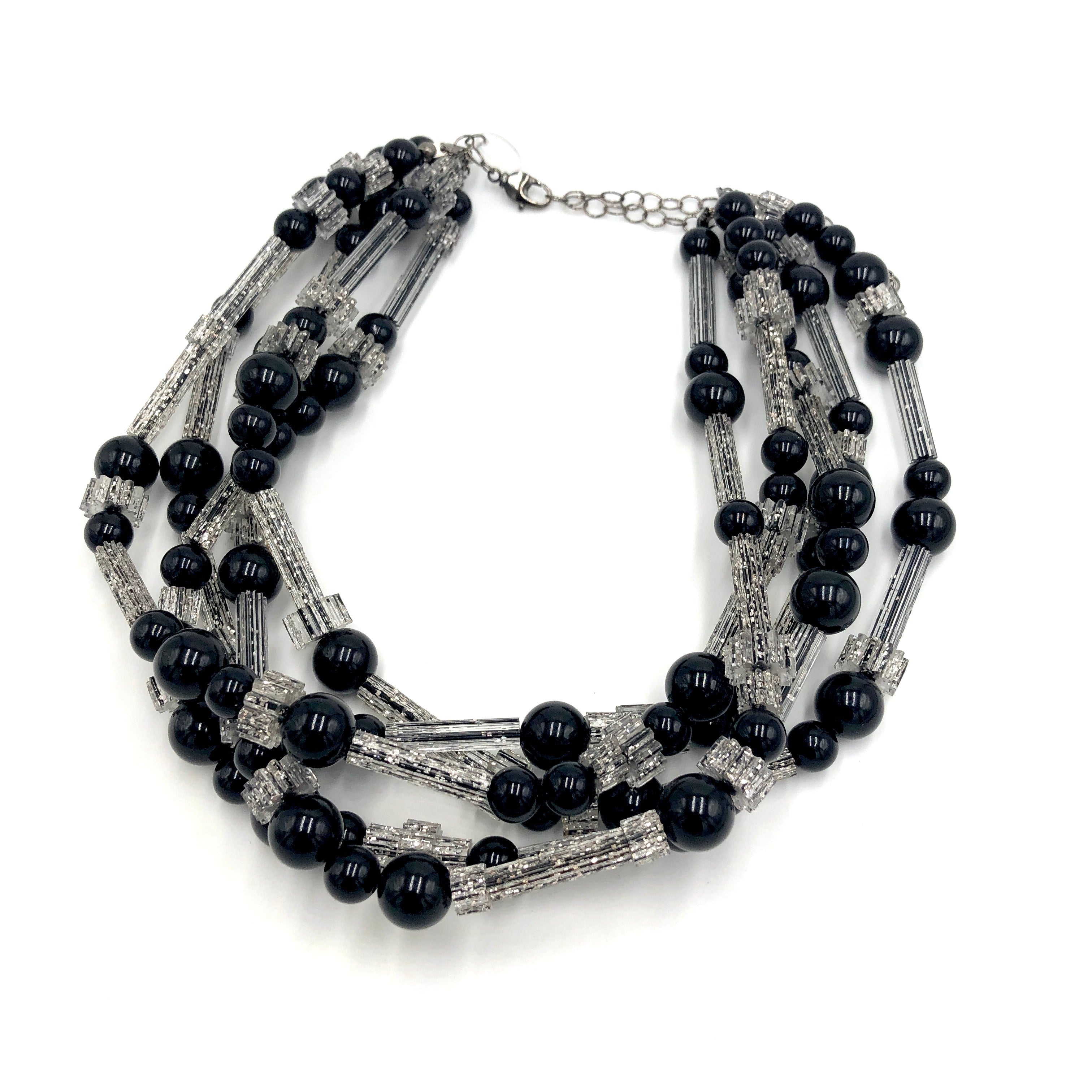 From our archives. Incredibly rare vintage sparkle beads meet pops of black. The beads in this necklace are varied in shape & size for a great, textured look. The necklace measures 15.5-16" at its shortest + a 6" extender. Lightweight and fun to wear: a classic style that will outlast trends.