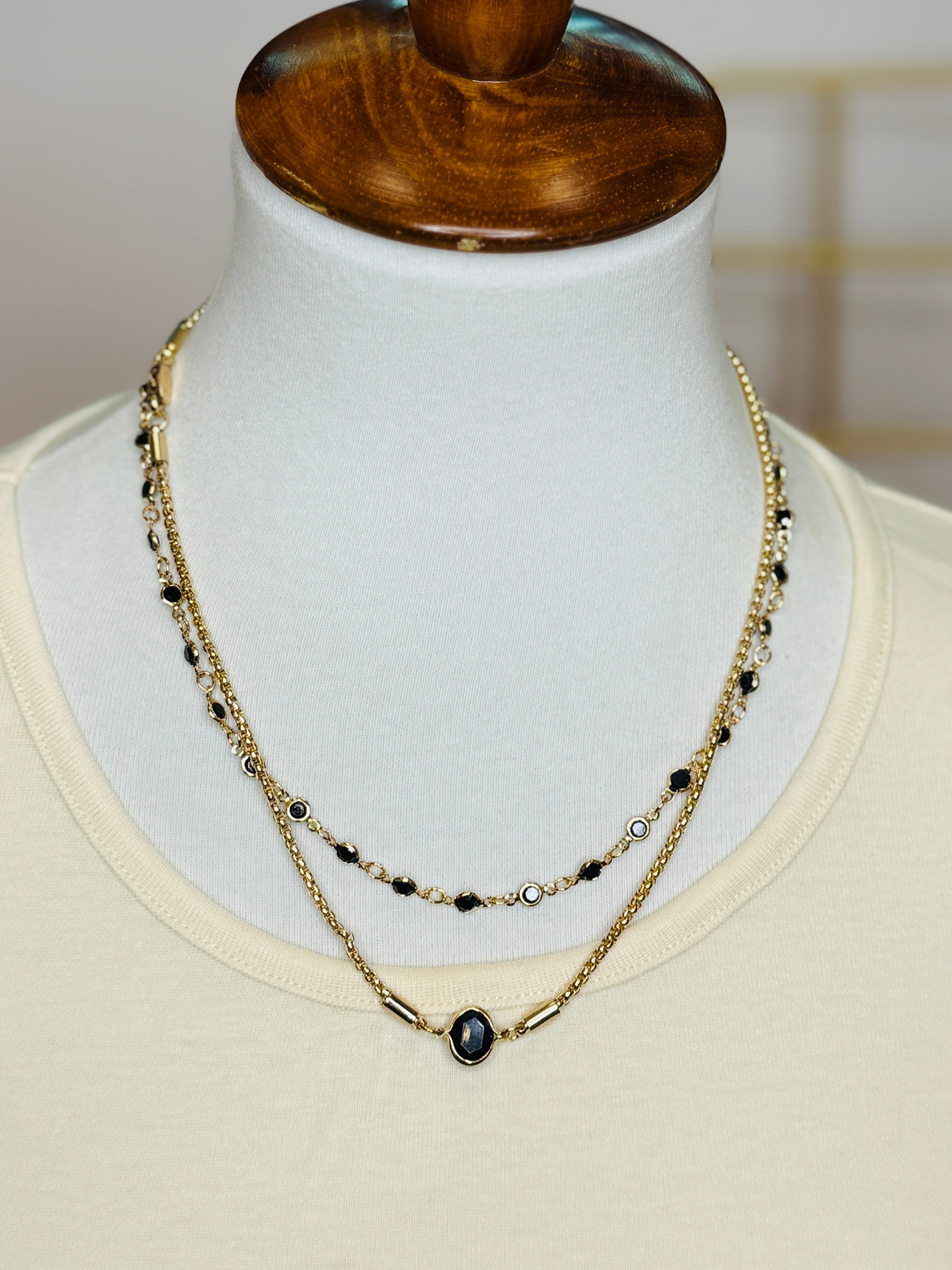 Featuring a a two-piece set of gold necklaces with crystal details.