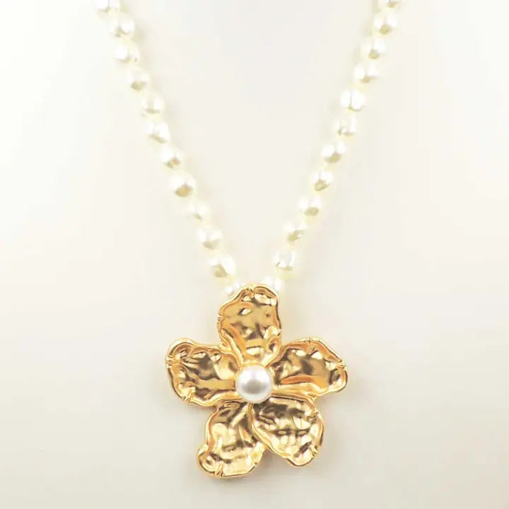 A timeless statement piece featuring lustrous freshwater pearls paired with a bold hammered gold flower pendant. The organic texture of the flower adds artisan charm while the adjustable chain allows for versatile layering. Perfect for dressy occasions or elevating everyday outfits