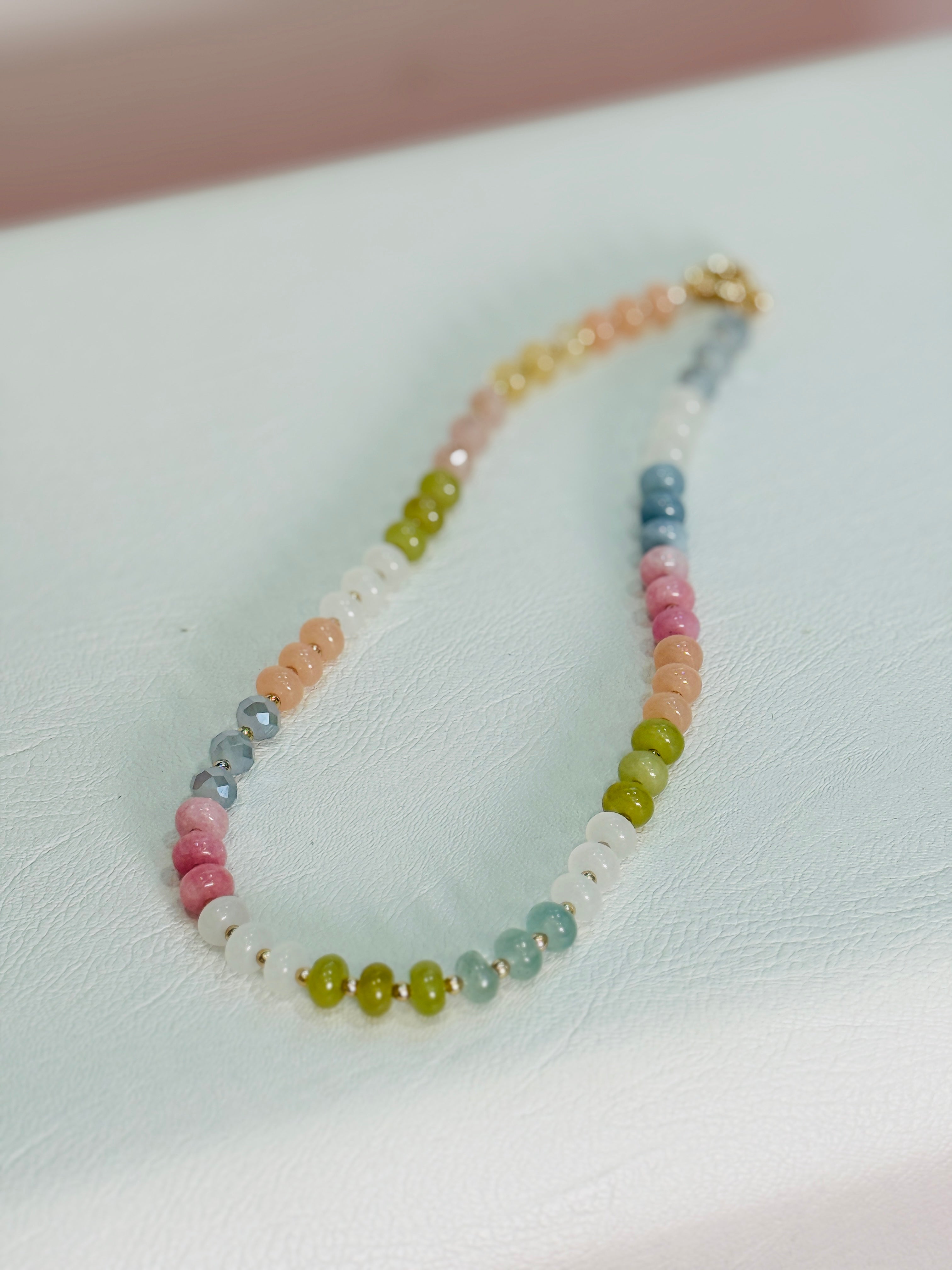 Playful, colorful, and effortlessly feminine, the Marsha Necklace features a beautiful strand of multi-tone round beads accented with subtle shimmer. The soft blend of colors makes it easy to pair with a variety of outfits, while the lightweight design keeps it comfortable for all-day wear. Perfect for layering with your favorite chains or wearing alone for a delicate pop of color, this necklace adds a cheerful, polished touch to any look.