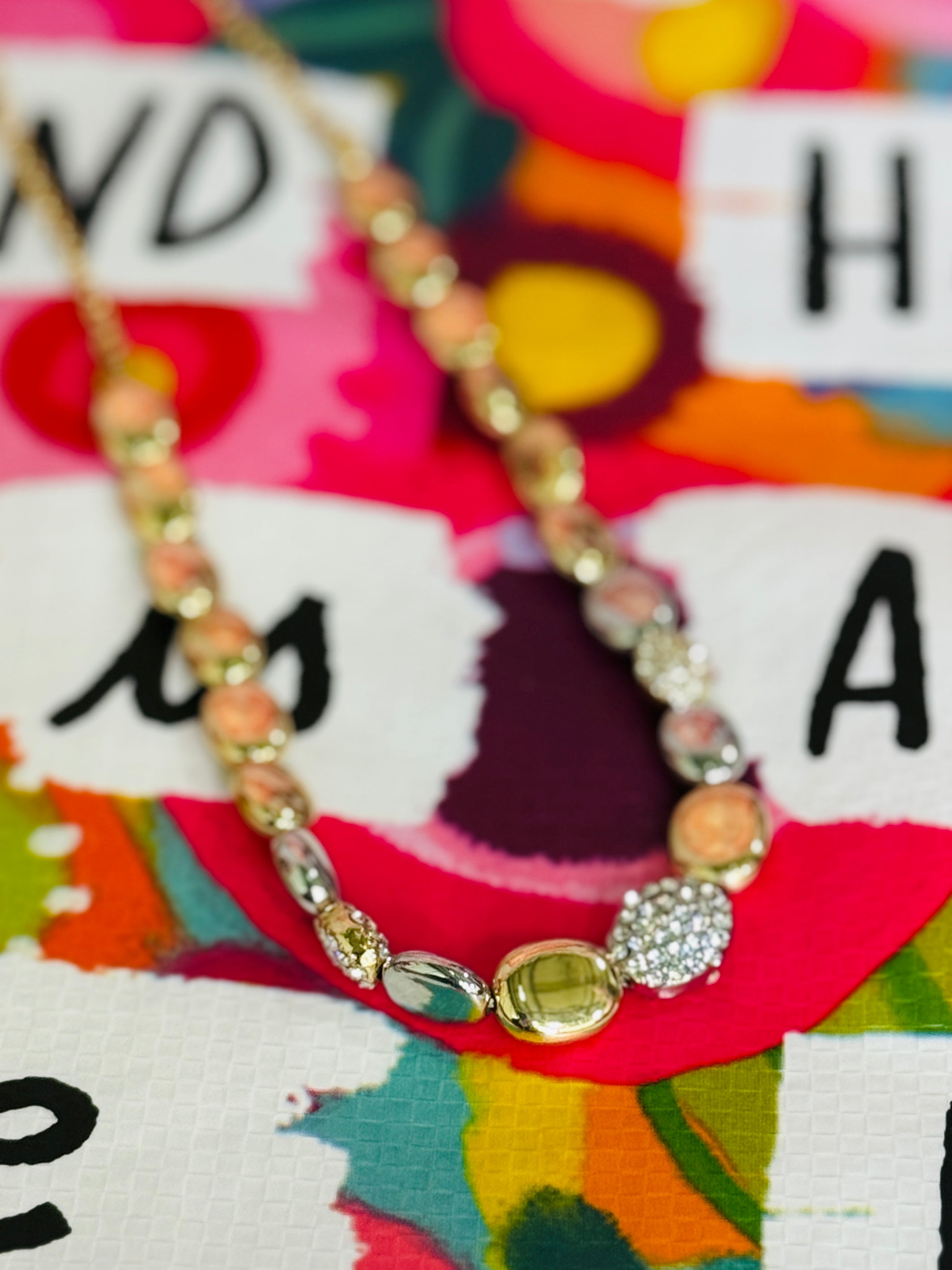 Featuring a chain necklace with smooth oval and crystal beads. Available in Gold or Silver.