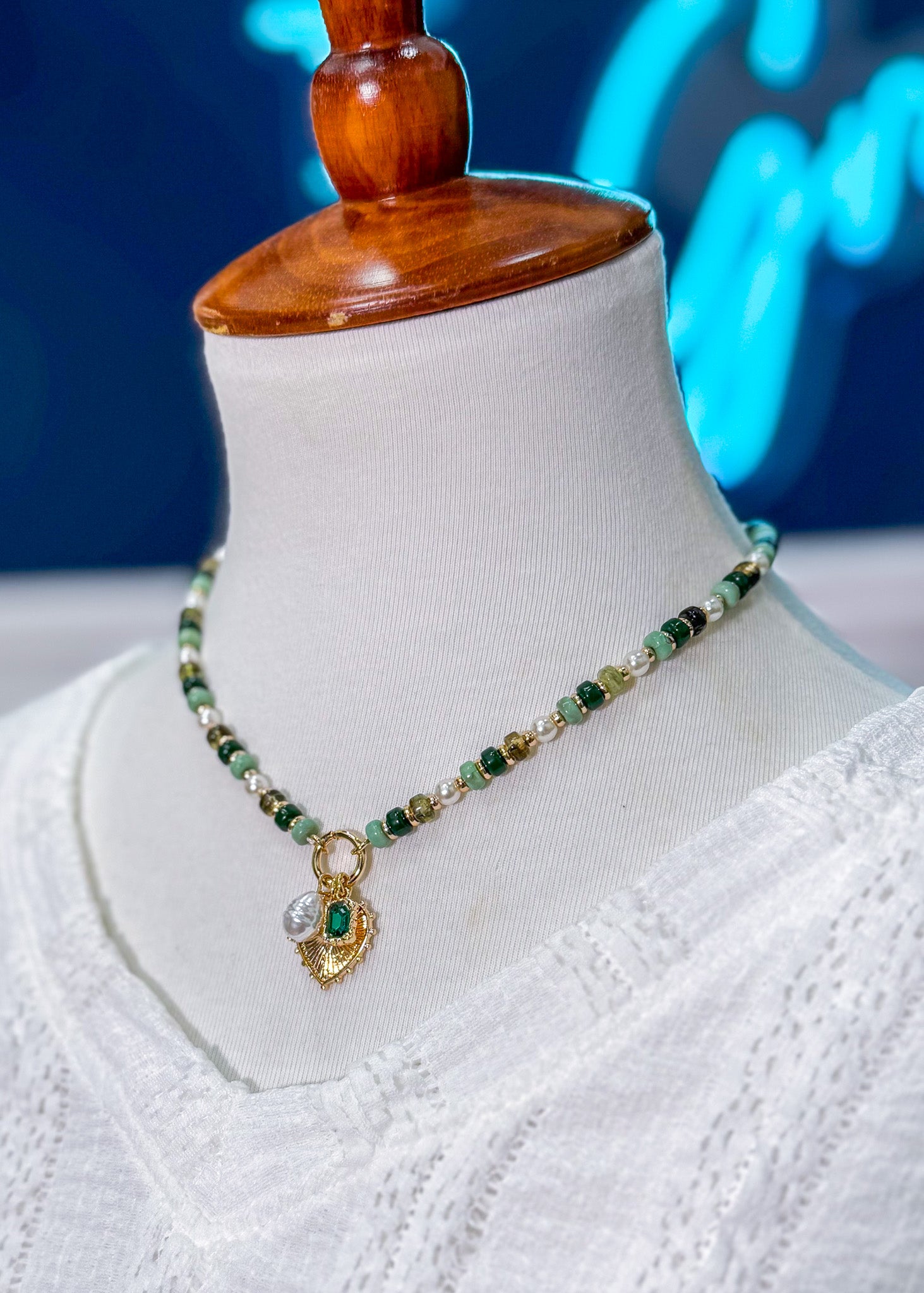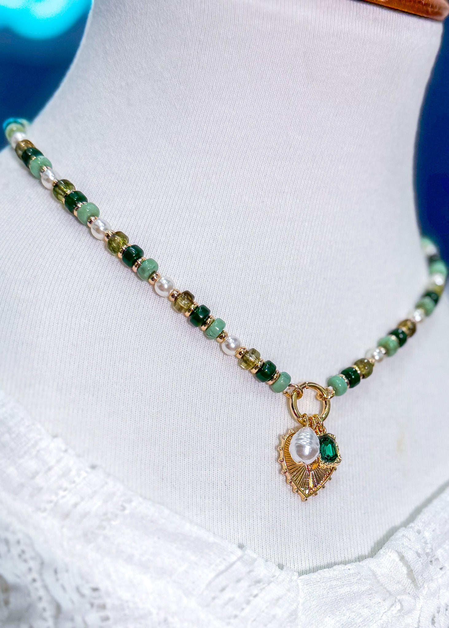 Featuring a green and gold beaded necklace with a heart, pearl and green gemstone charms.