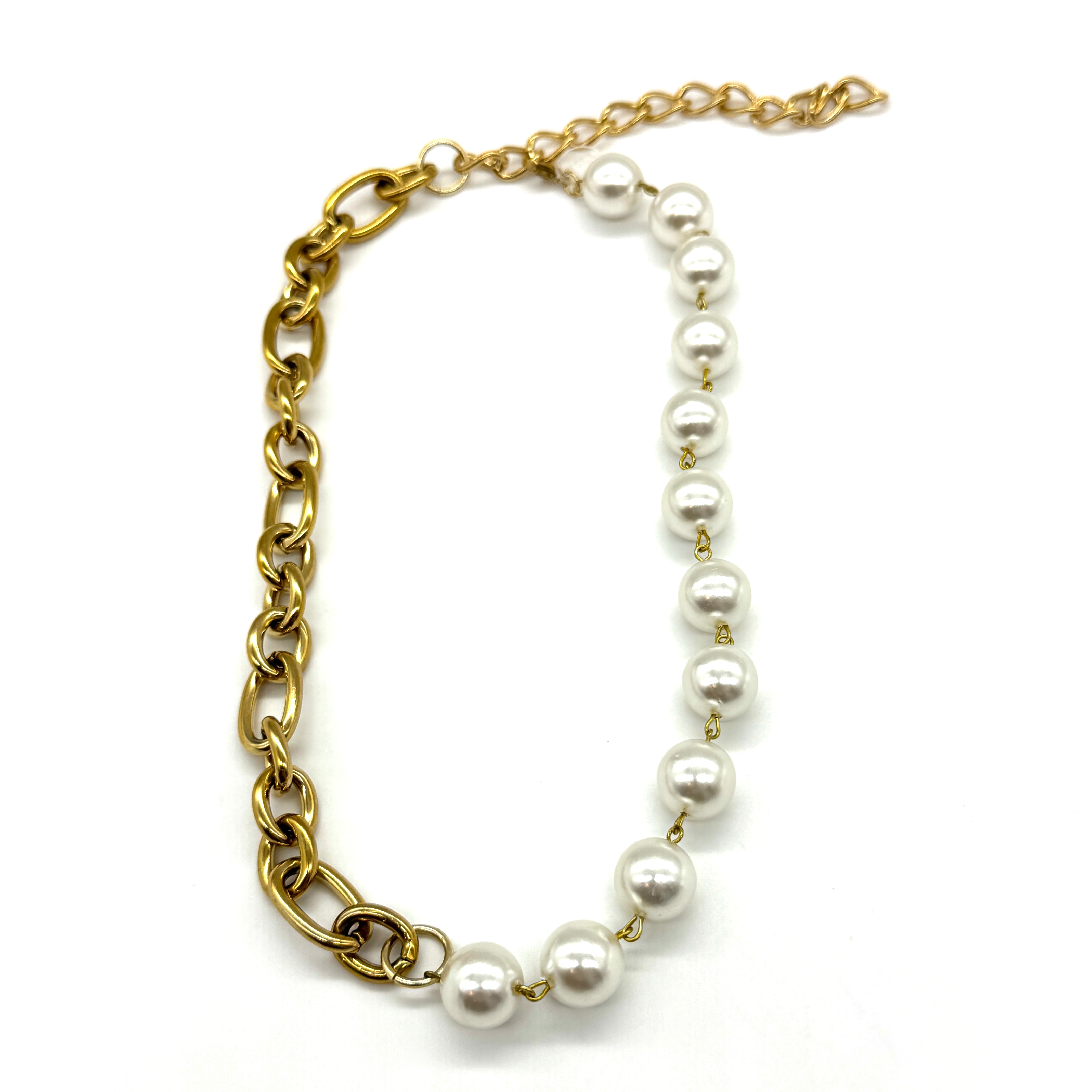 Asymmetrical necklace with vintage resin pearls & chunky chain