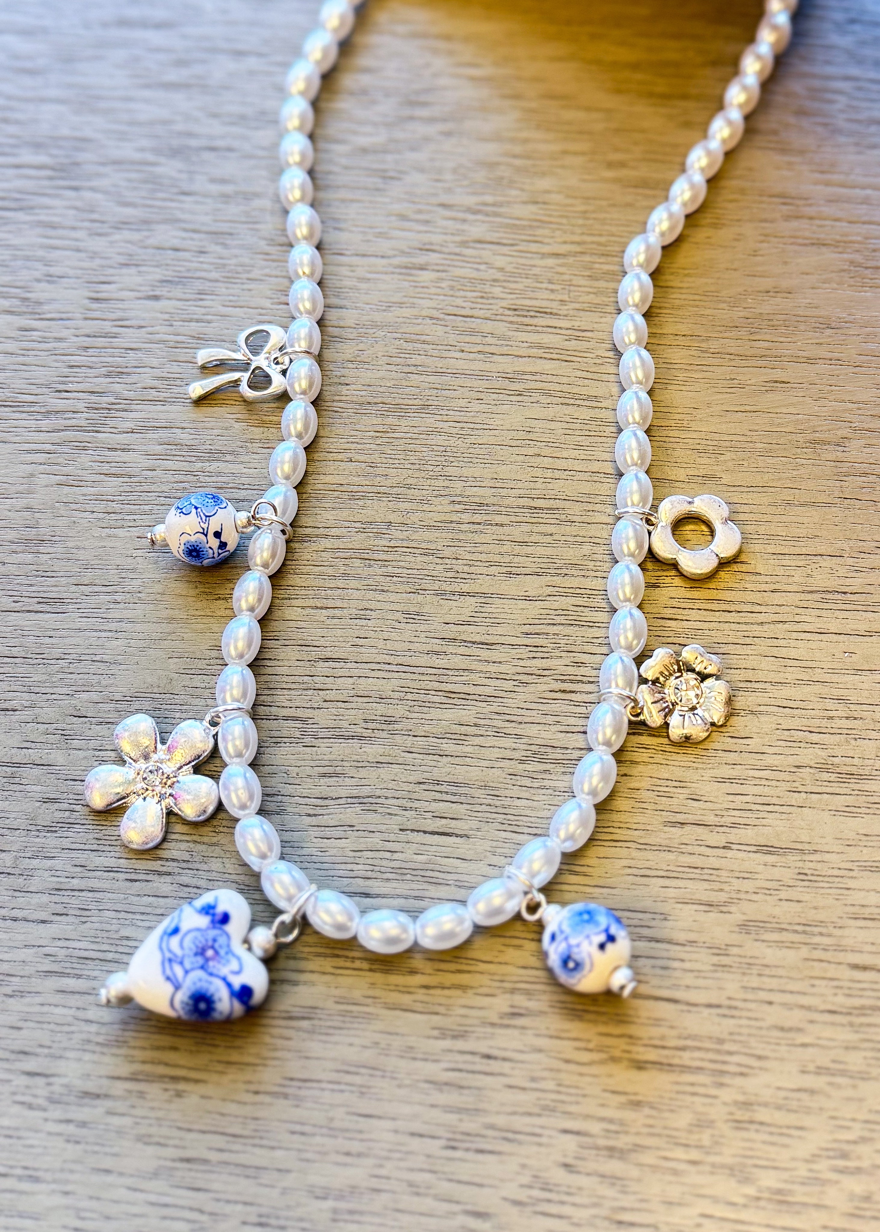 Featuring a pearl necklace with gold and silver with blue porcelain charms.