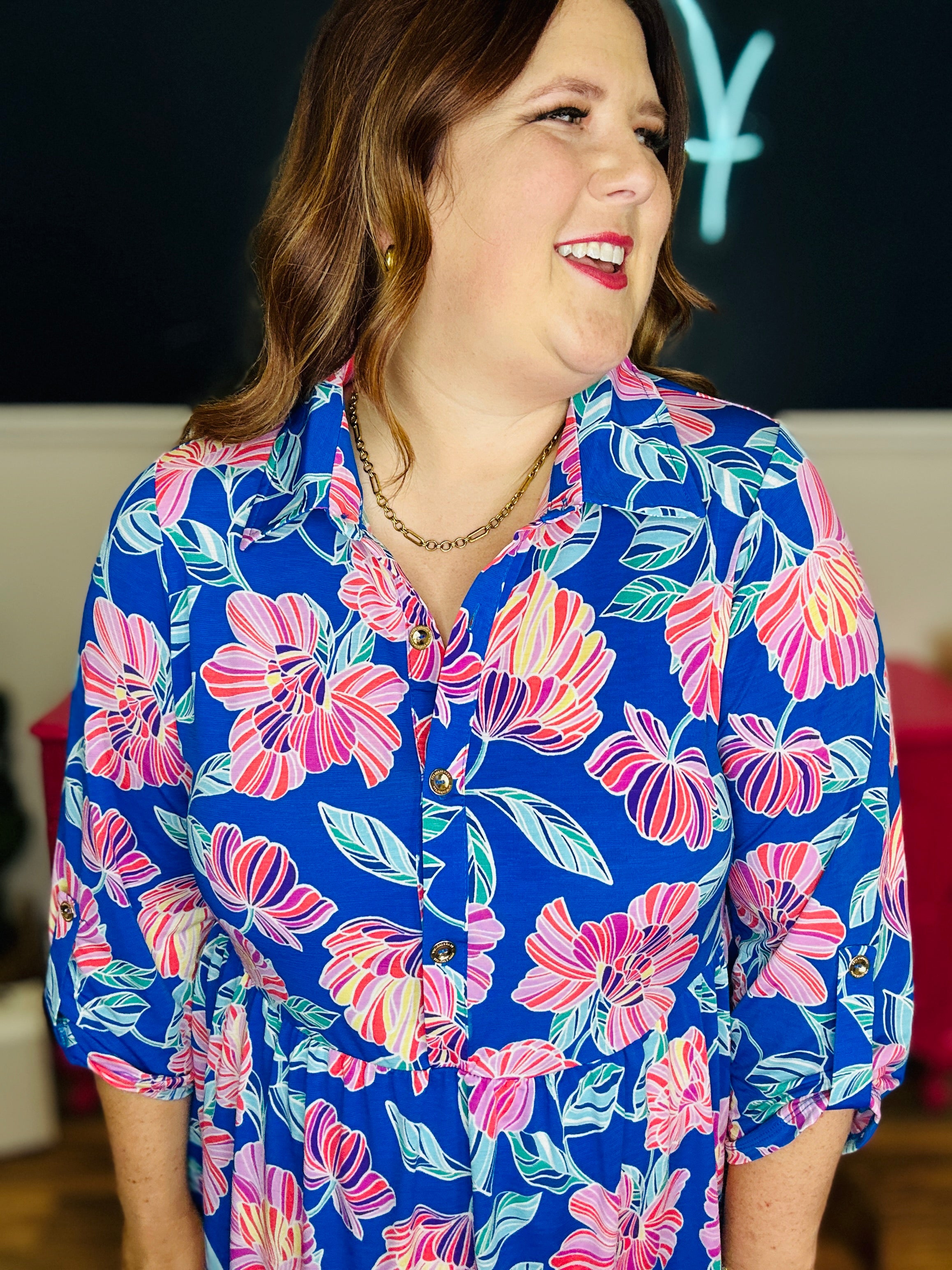• Collared Neckline | 3/4 Roll Tab Sleeves | Tiered Hemline